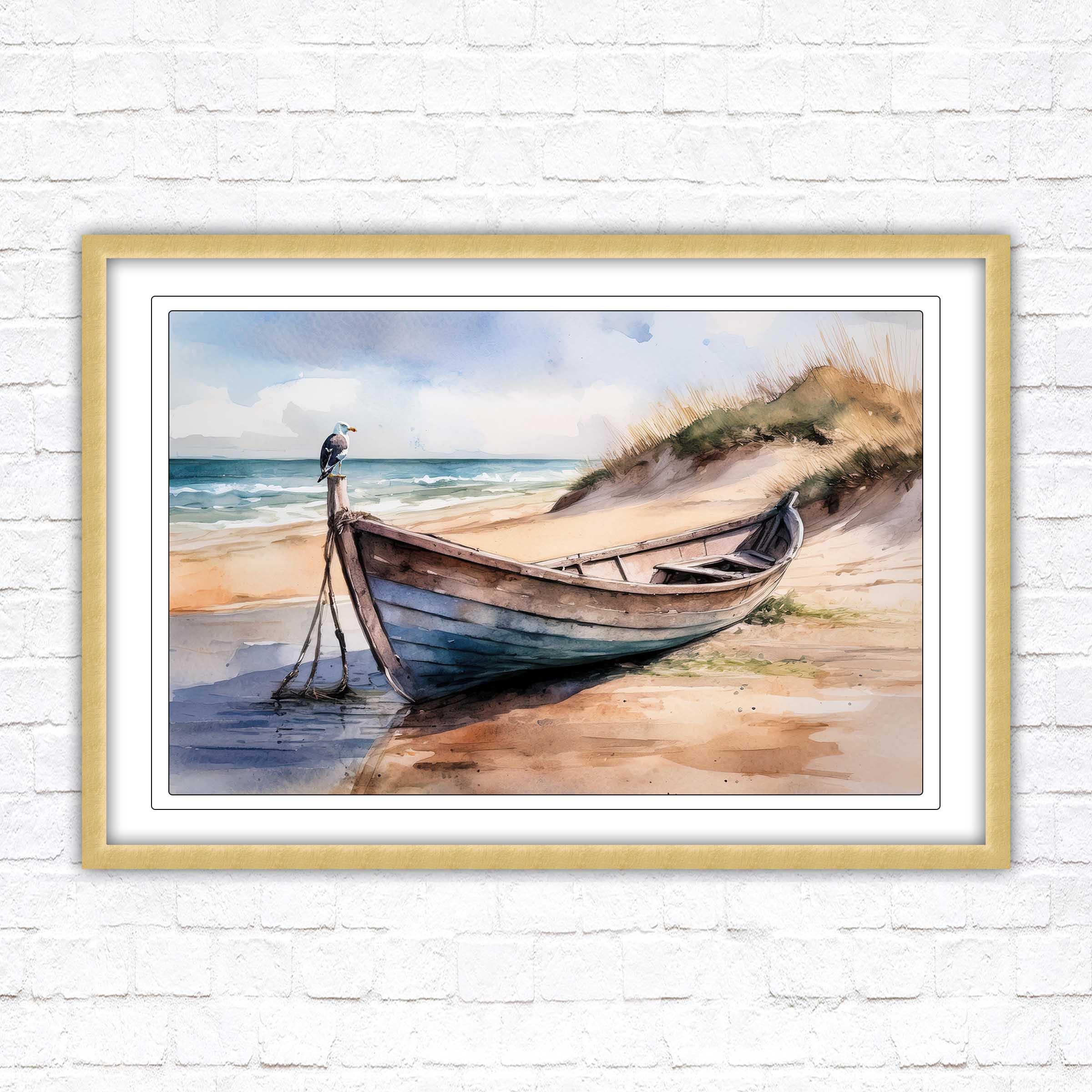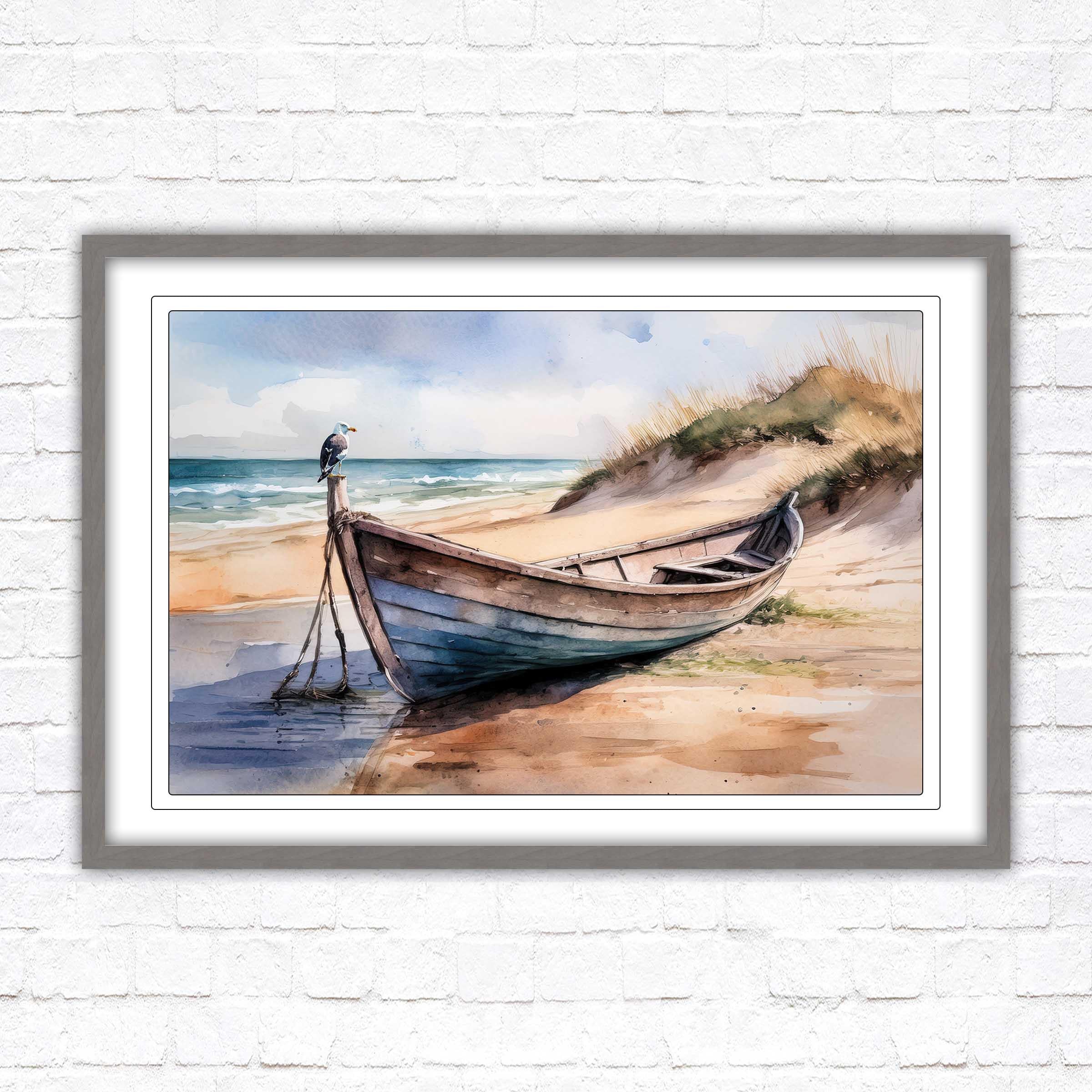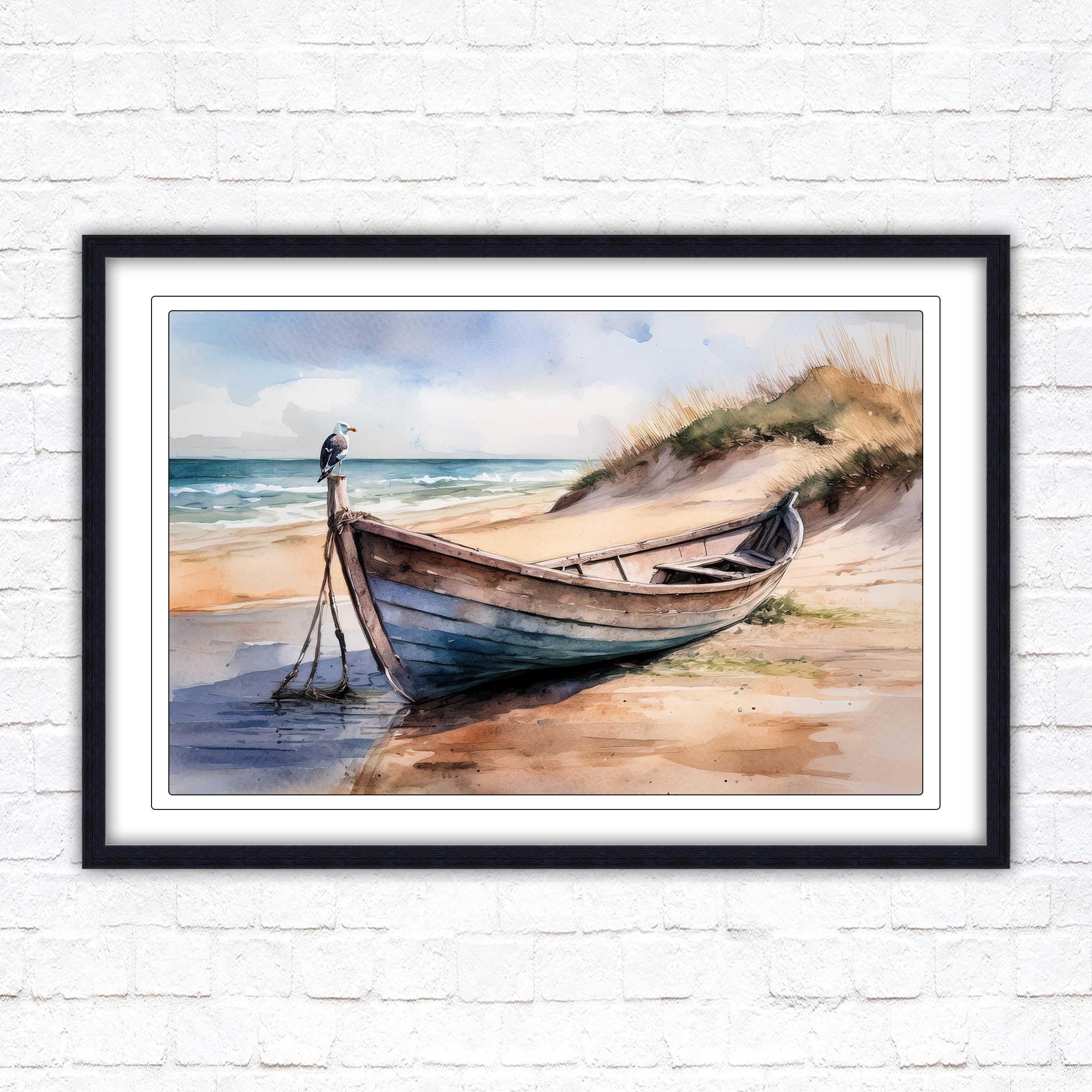 Bring the serene beauty of coastal charm into your home with this stunning watercolour painting of a classic rowing boat resting on the beach. The delicate strokes and soft, tranquil colours capture the peaceful essence of a quiet morning by the shore.