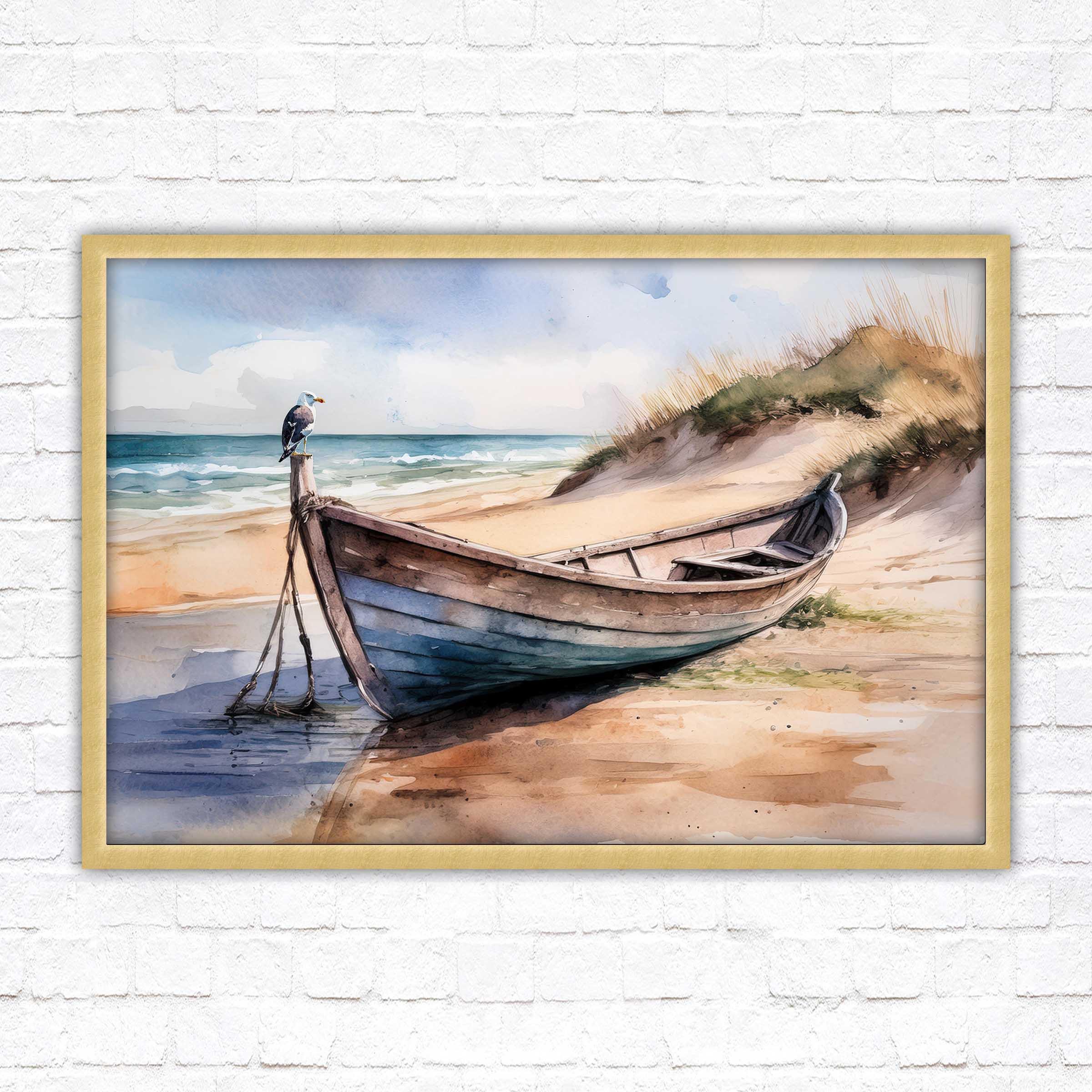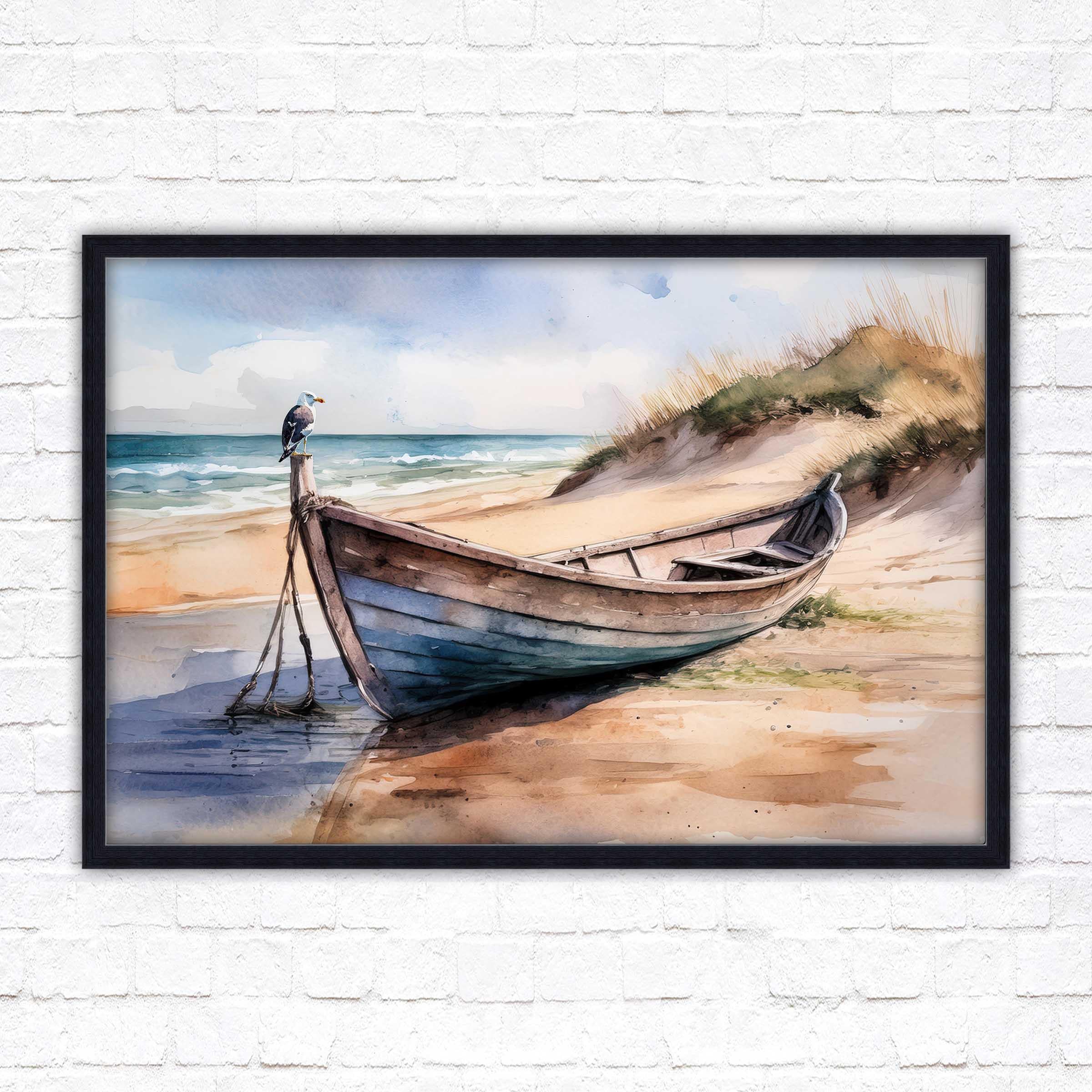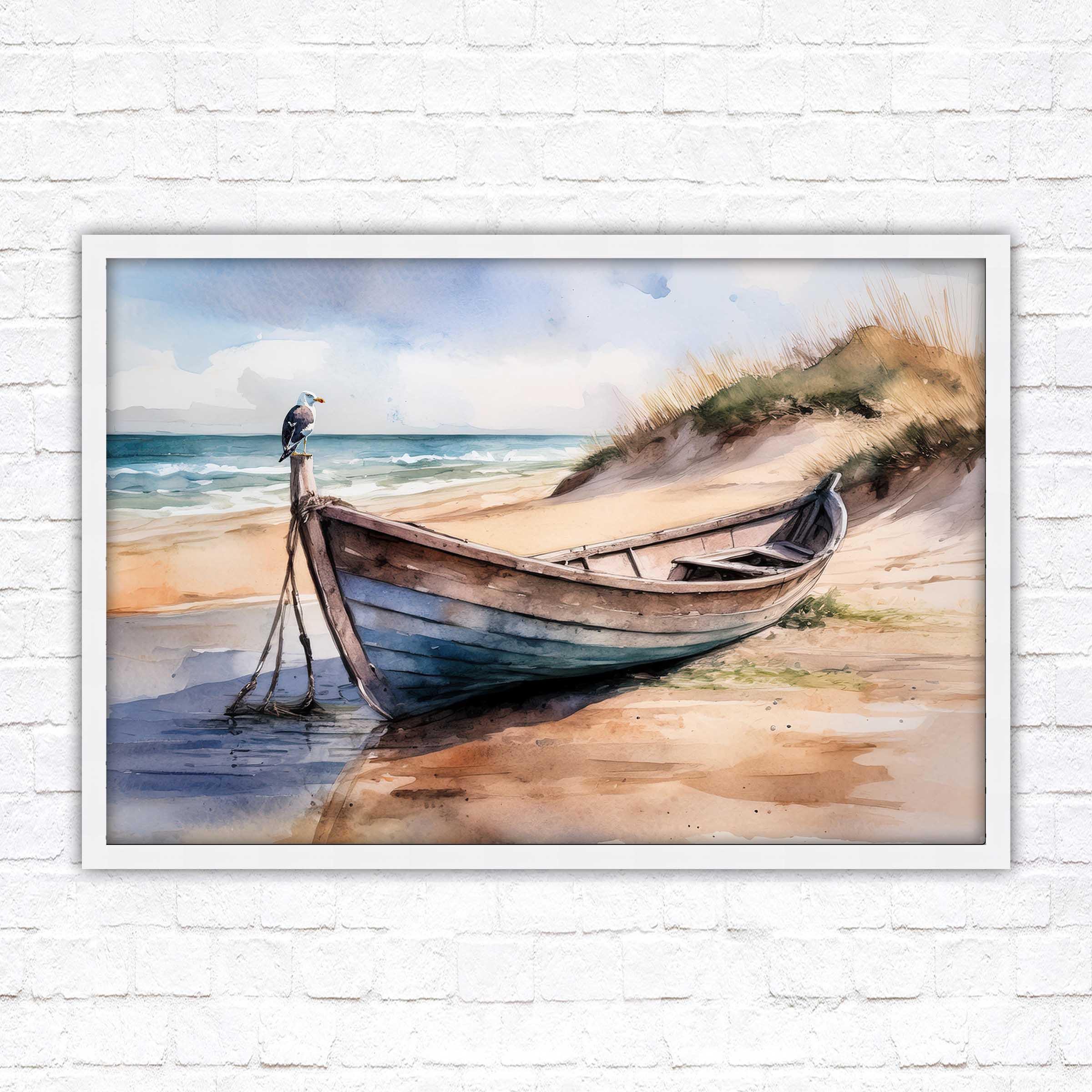 Bring the serene beauty of coastal charm into your home with this stunning watercolour painting of a classic rowing boat resting on the beach. The delicate strokes and soft, tranquil colours capture the peaceful essence of a quiet morning by the shore.