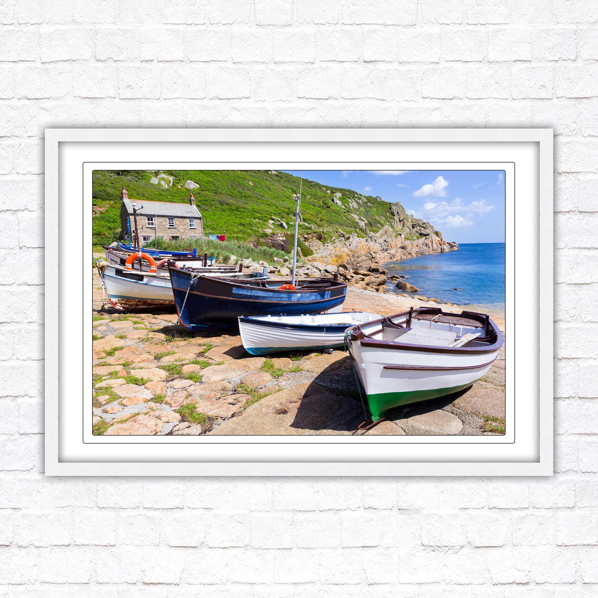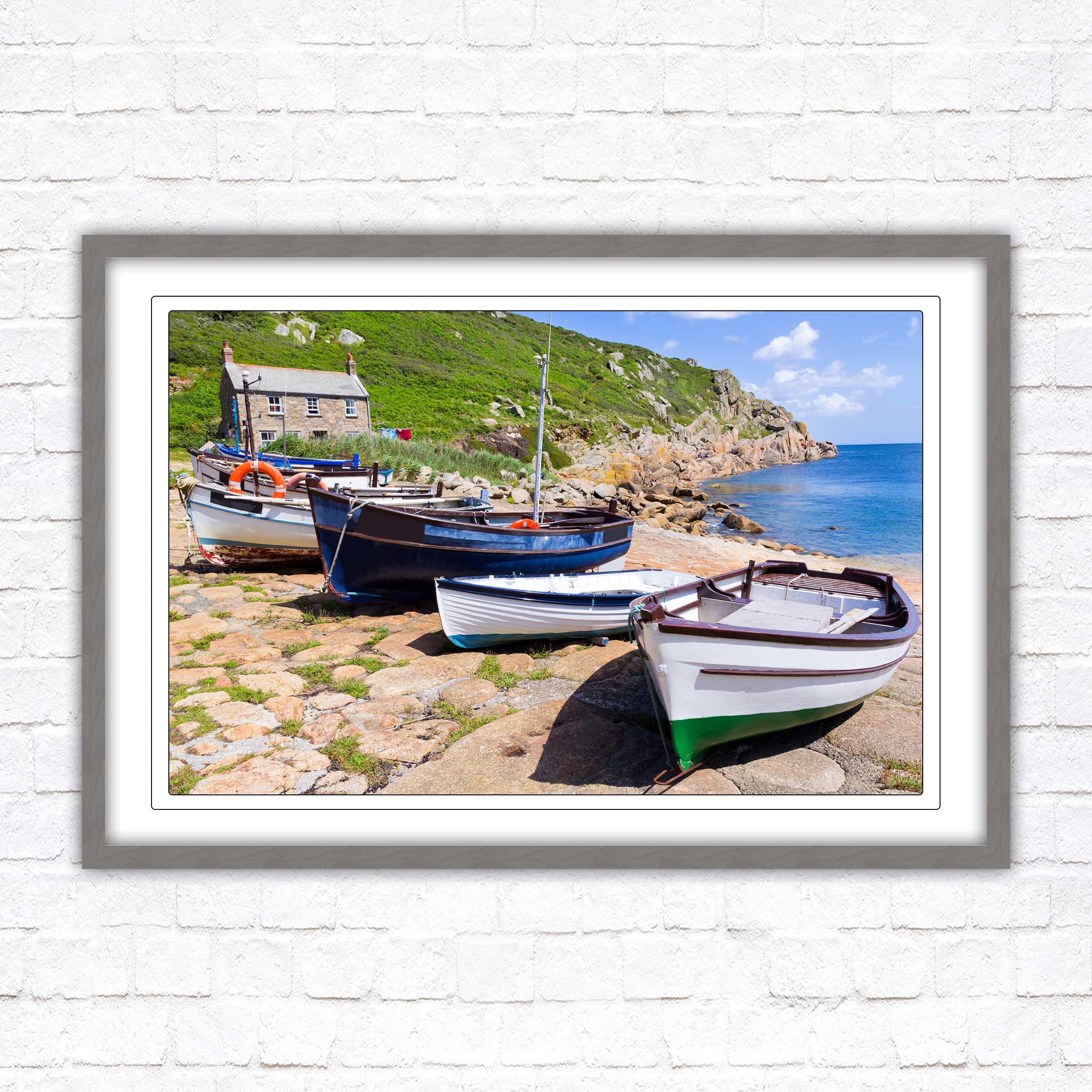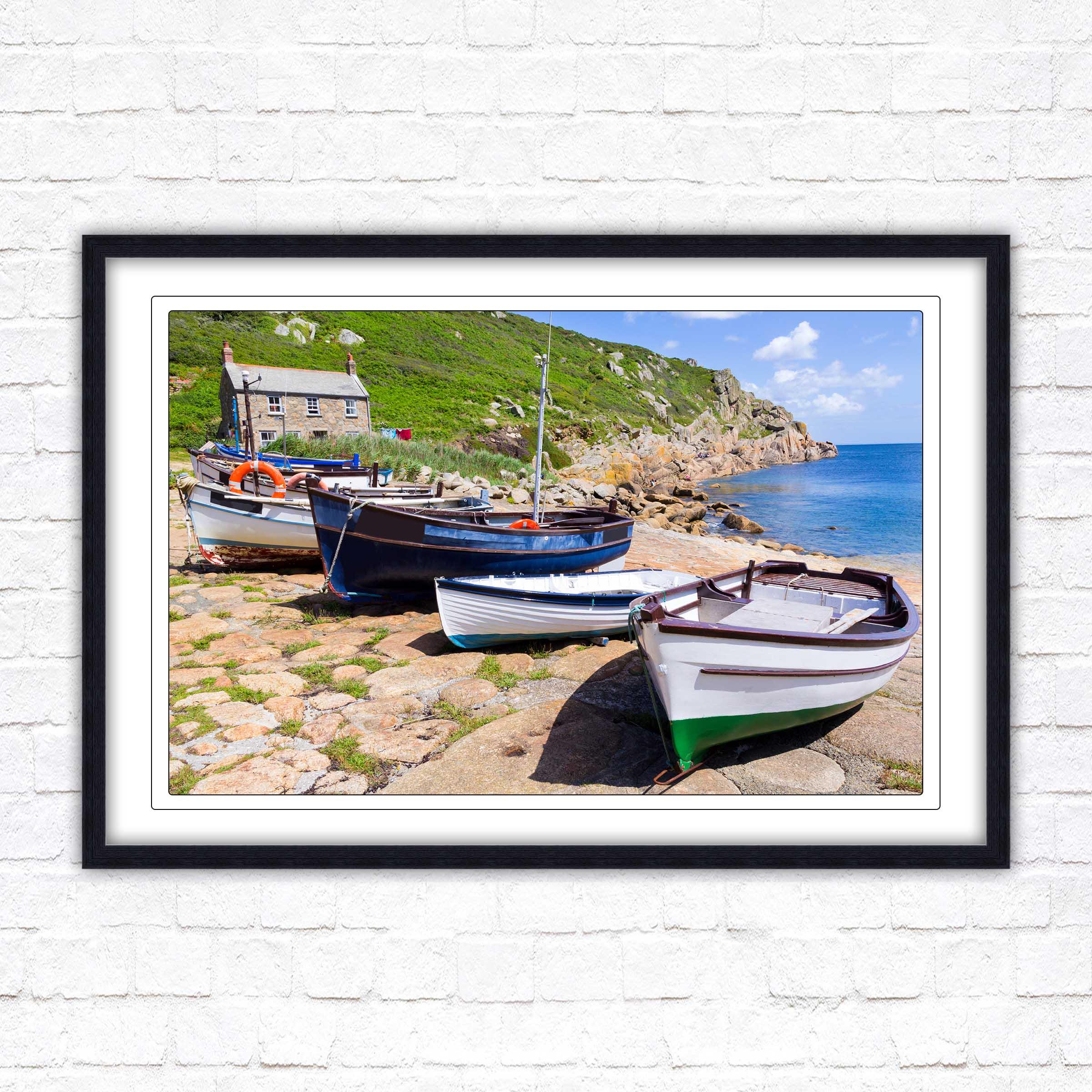 A beautiful framed picture of fishing Boats moored in the coastal village of Penberth, Cornwall. Enjoy this tranquil coastal image giving a sense of relaxation to any room of you home. Choose from a selection of frame styles.