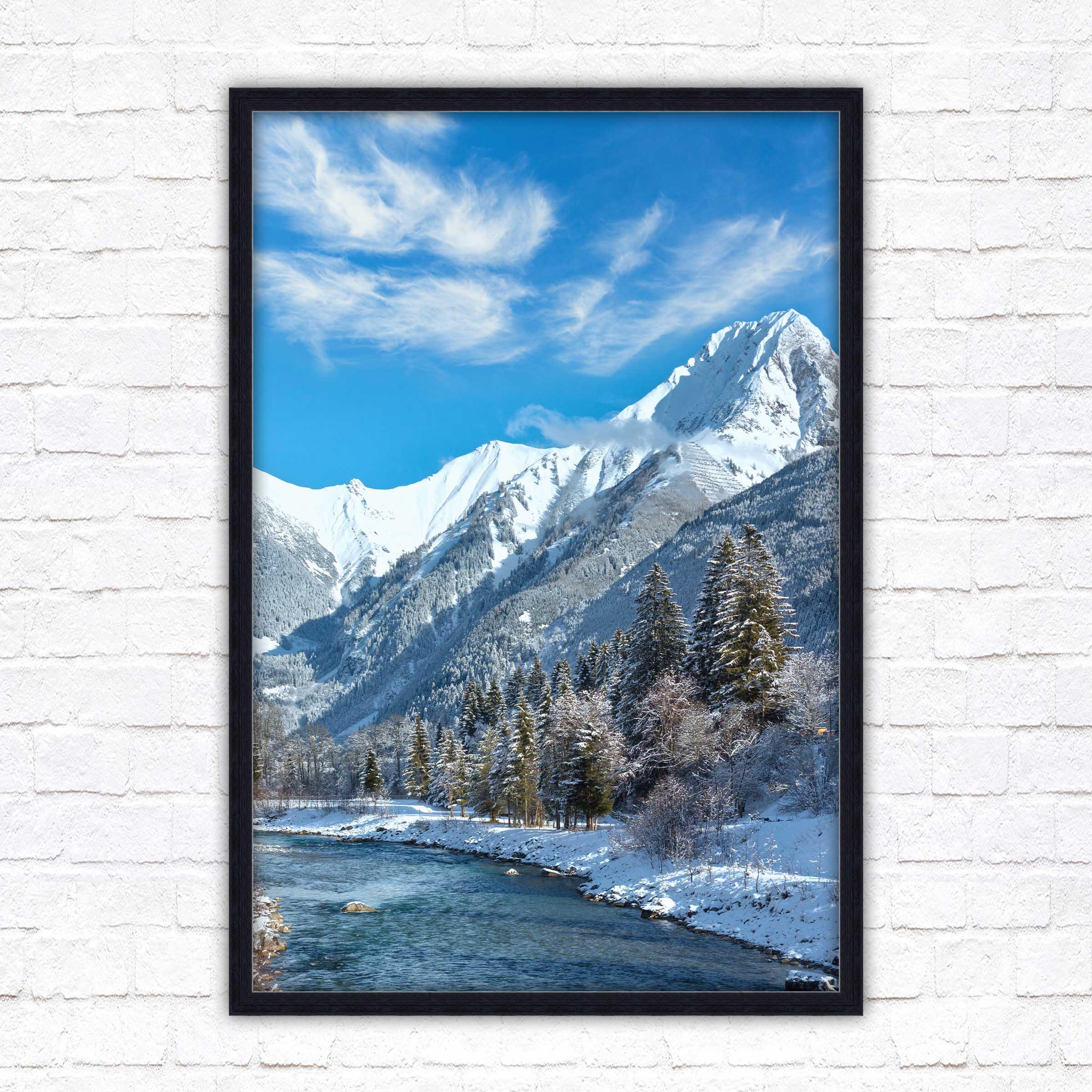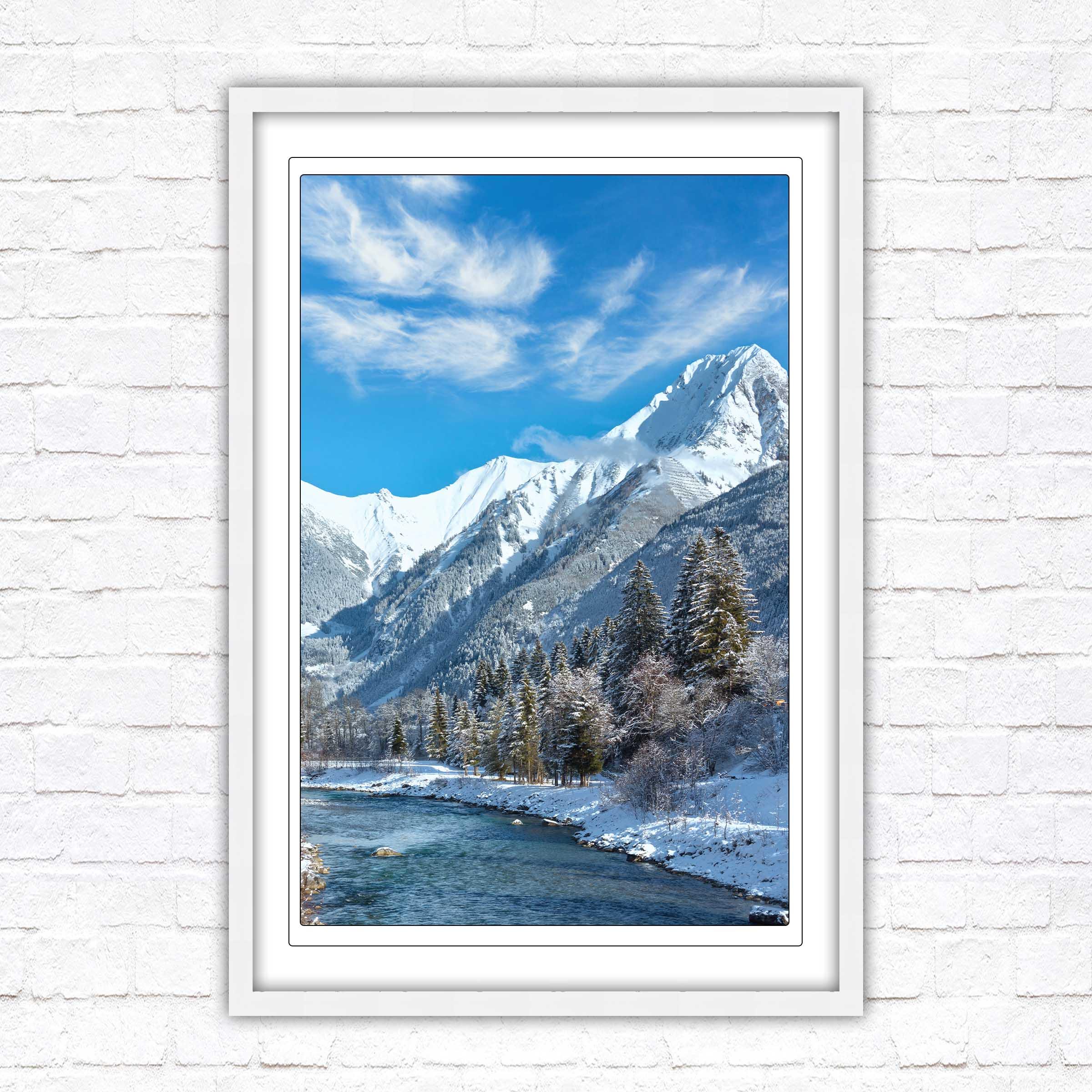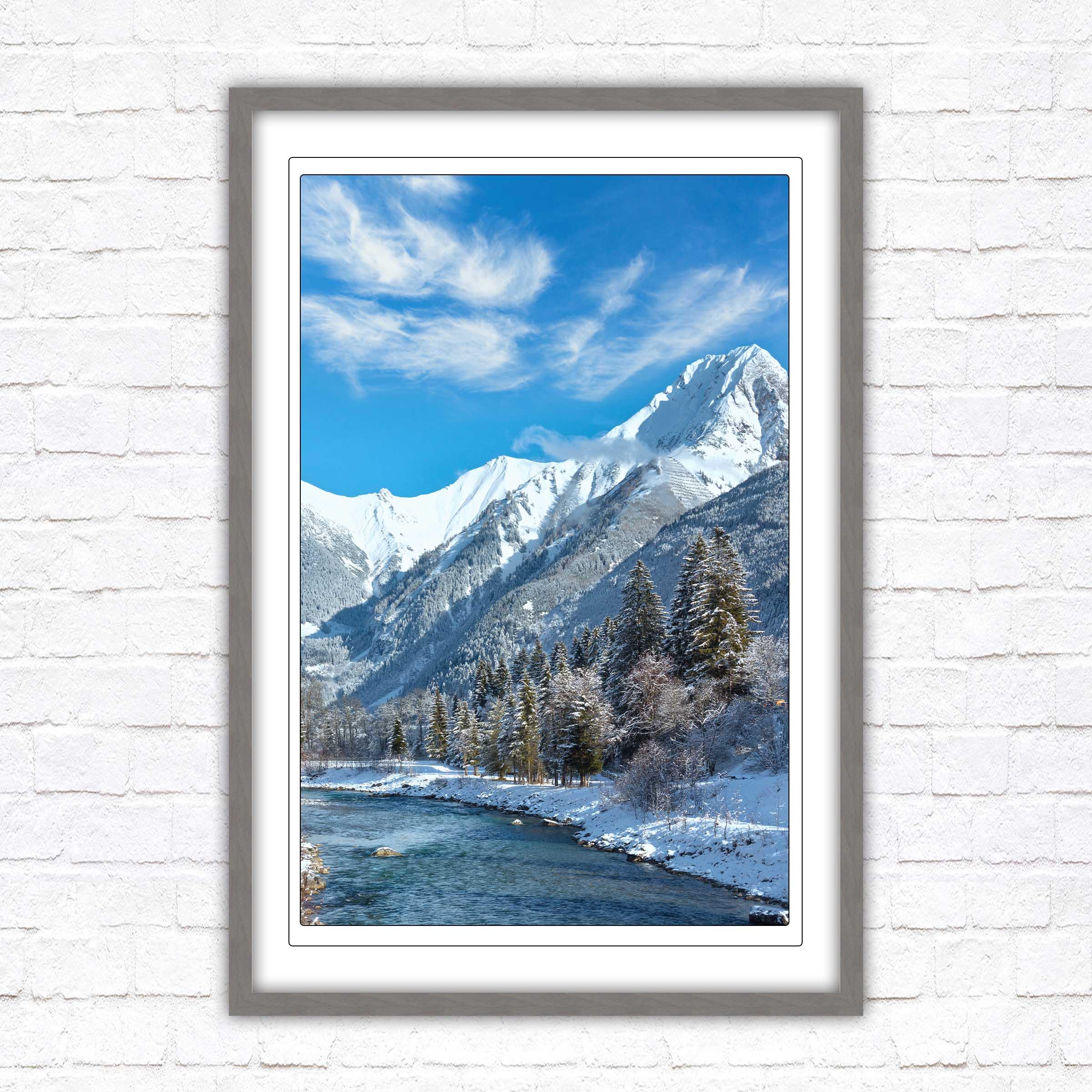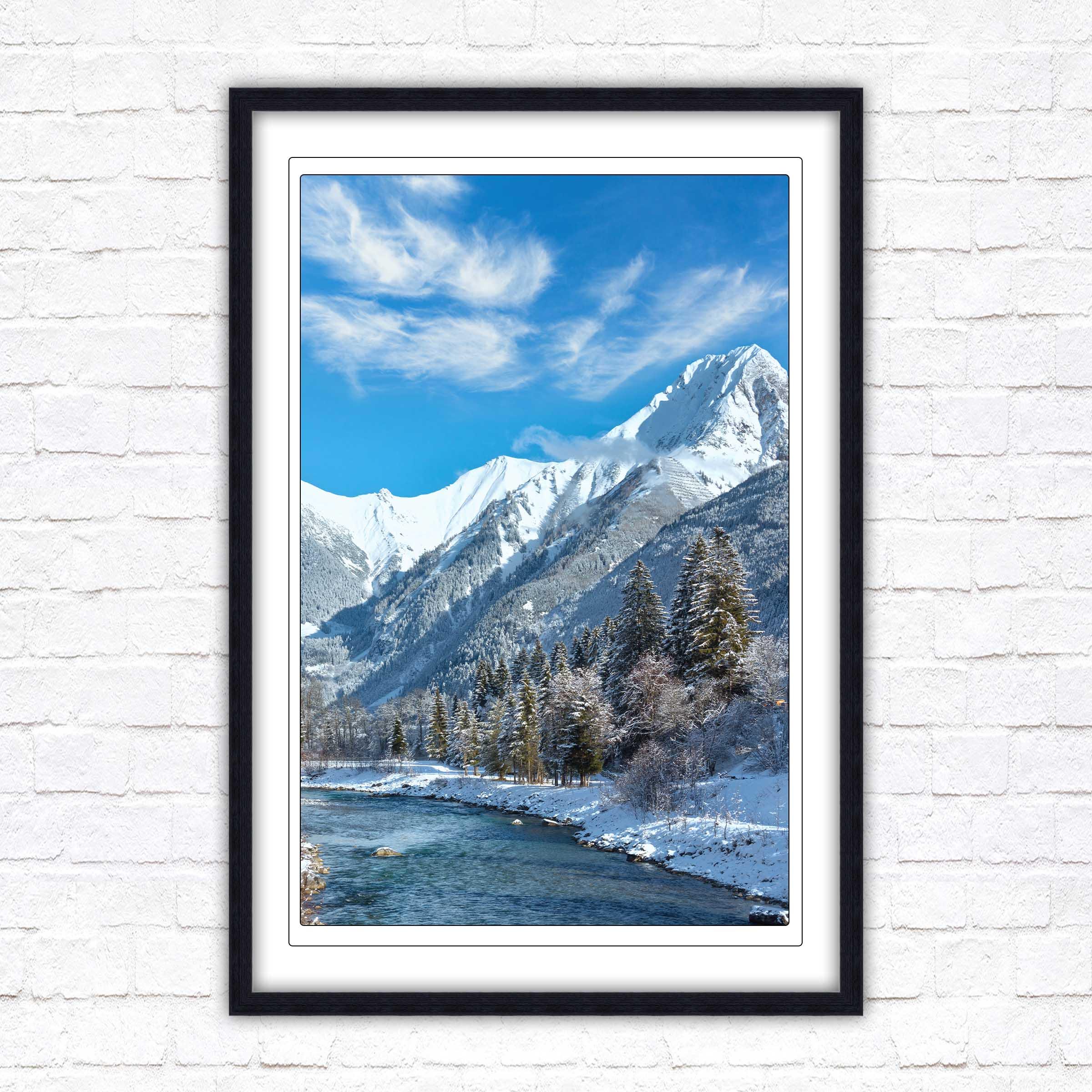 Bring the serene beauty of the Austrian Alps into your home with this breath-taking framed picture, showcasing a picturesque winter landscape. Snow-capped mountains tower over a sparkling river.