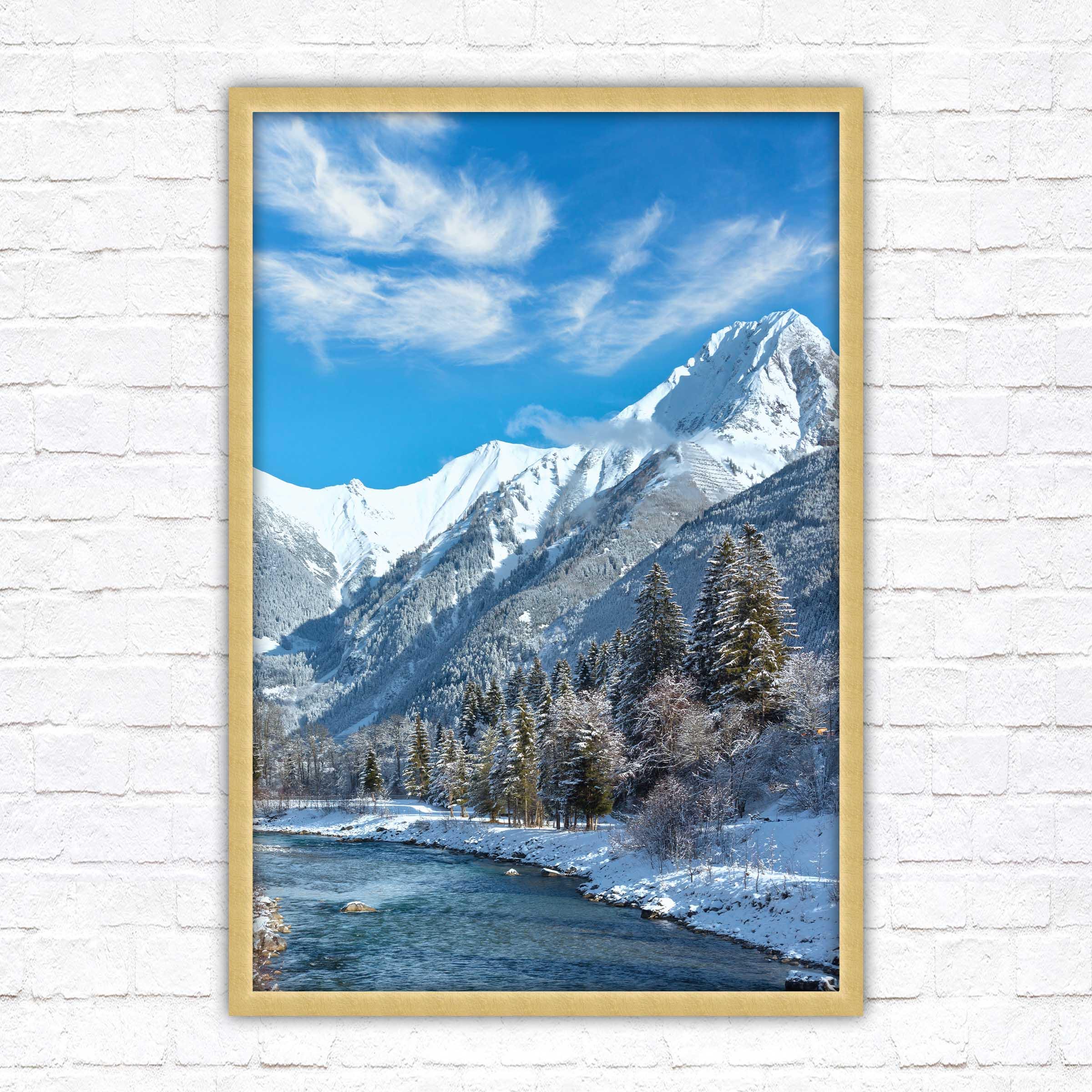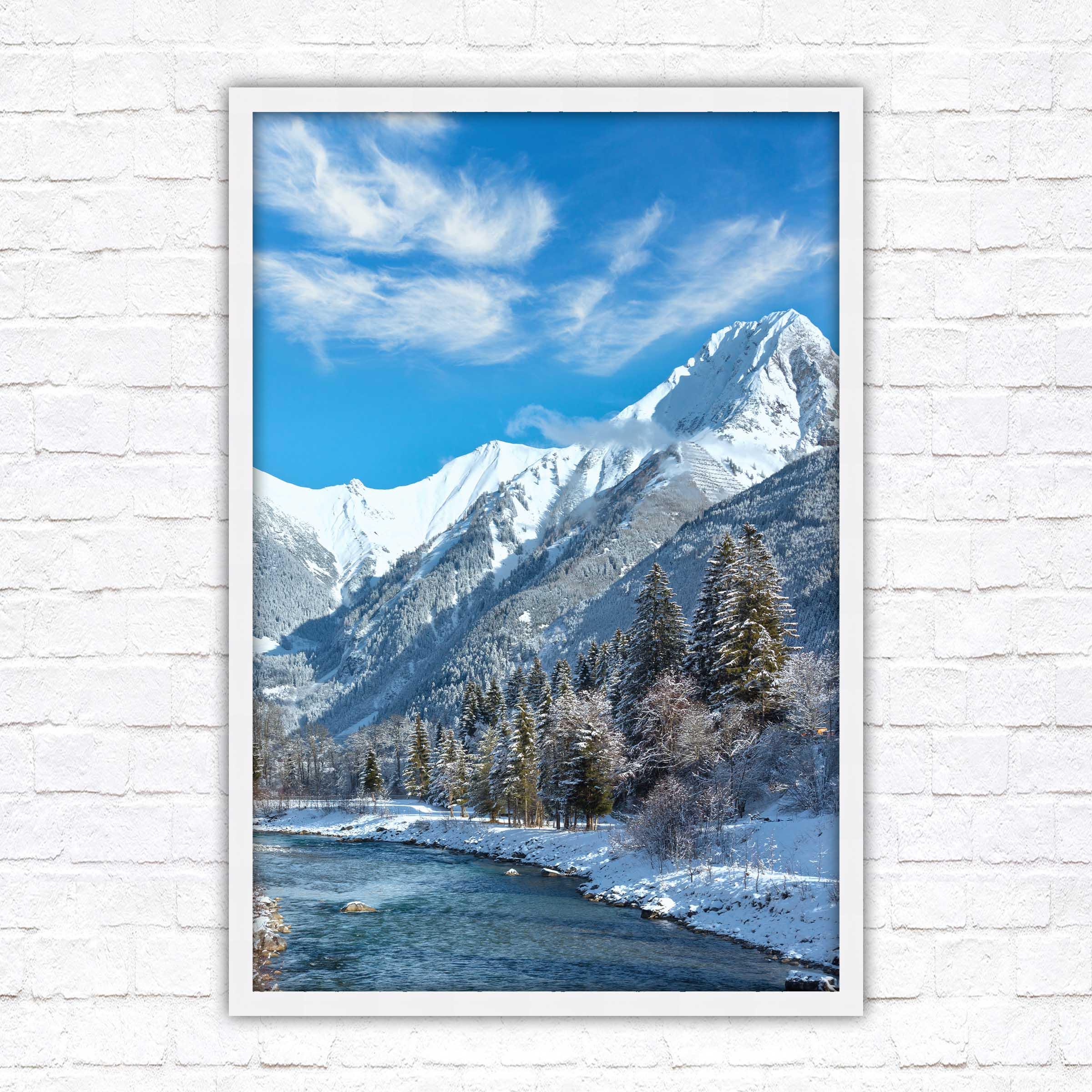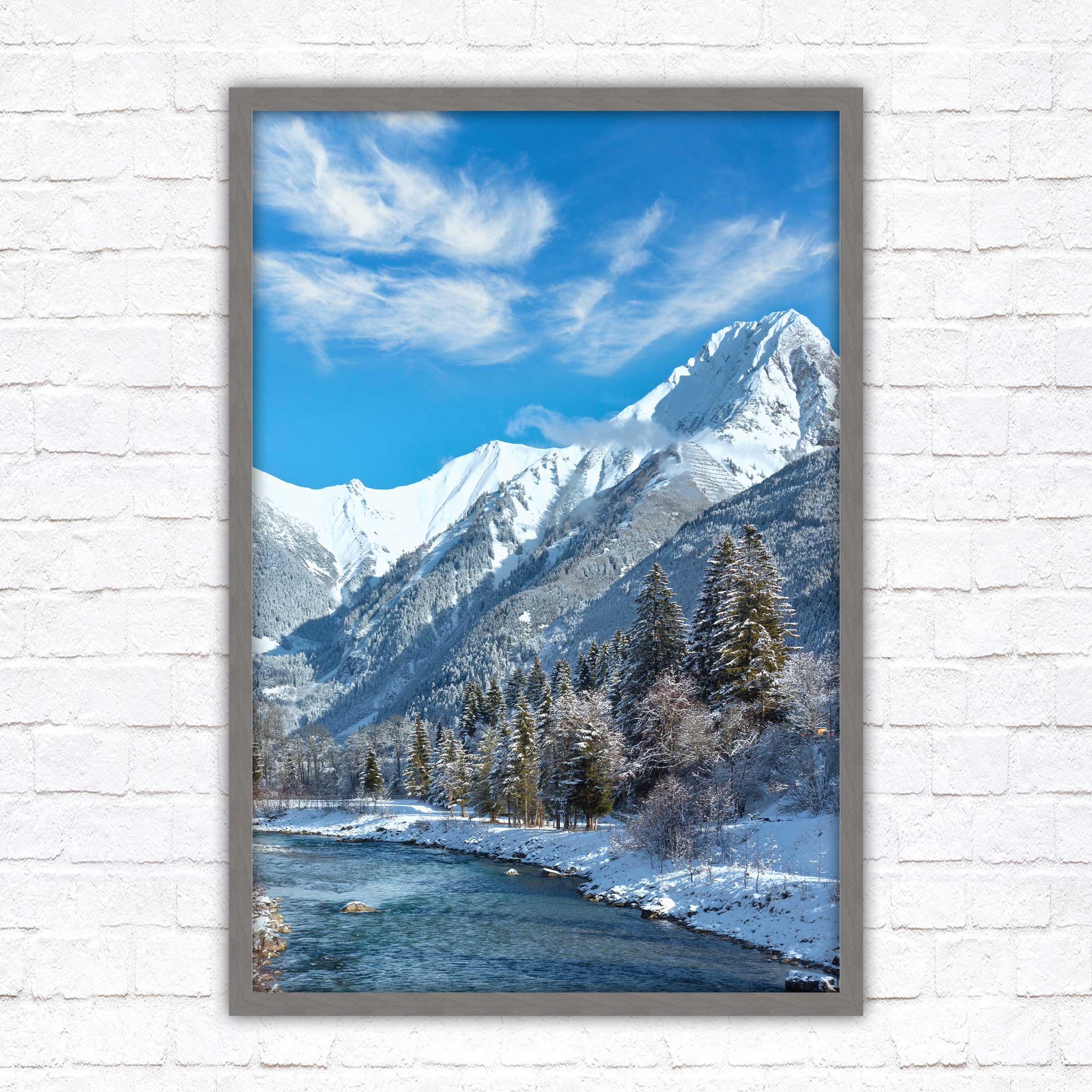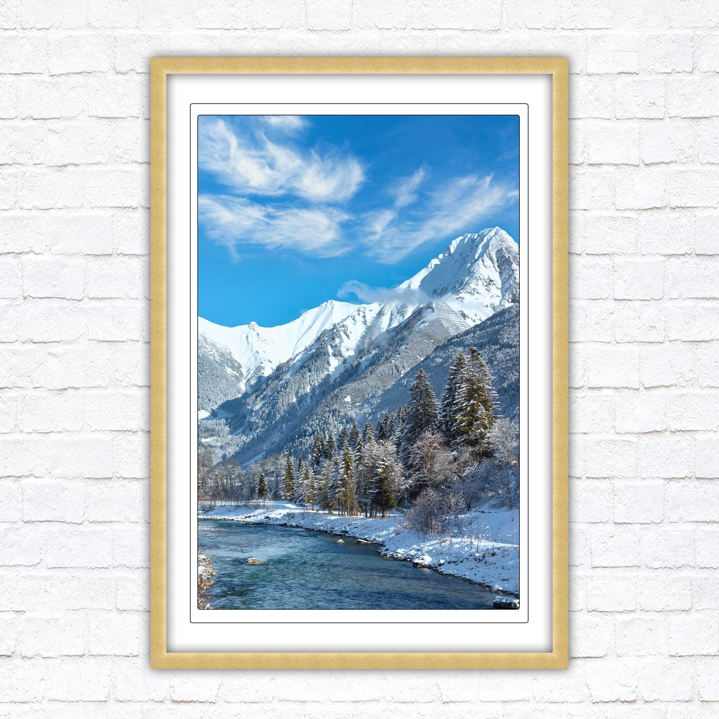 Bring the serene beauty of the Austrian Alps into your home with this breath-taking framed picture, showcasing a picturesque winter landscape. Snow-capped mountains tower over a sparkling river.