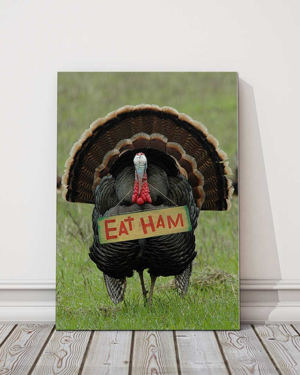 Christmas humour of a wild turkey displaying a 'Eat Ham' sign. Printed and framed as a canvas print. Available in... Read more