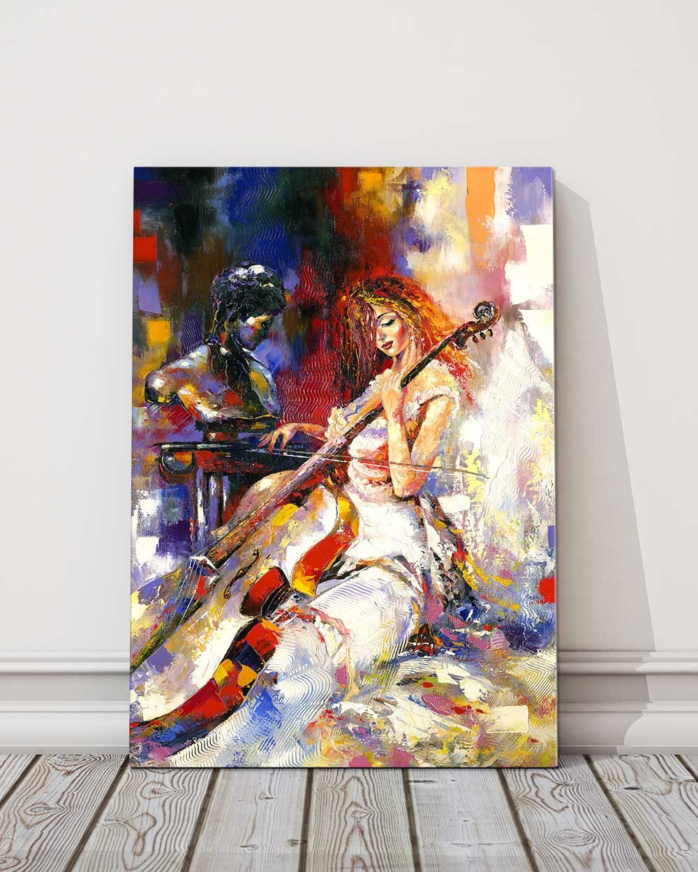 Girl playing a violoncello. Colourful oil painting, printed and finished as a canvas picture. Musician/orchestra.