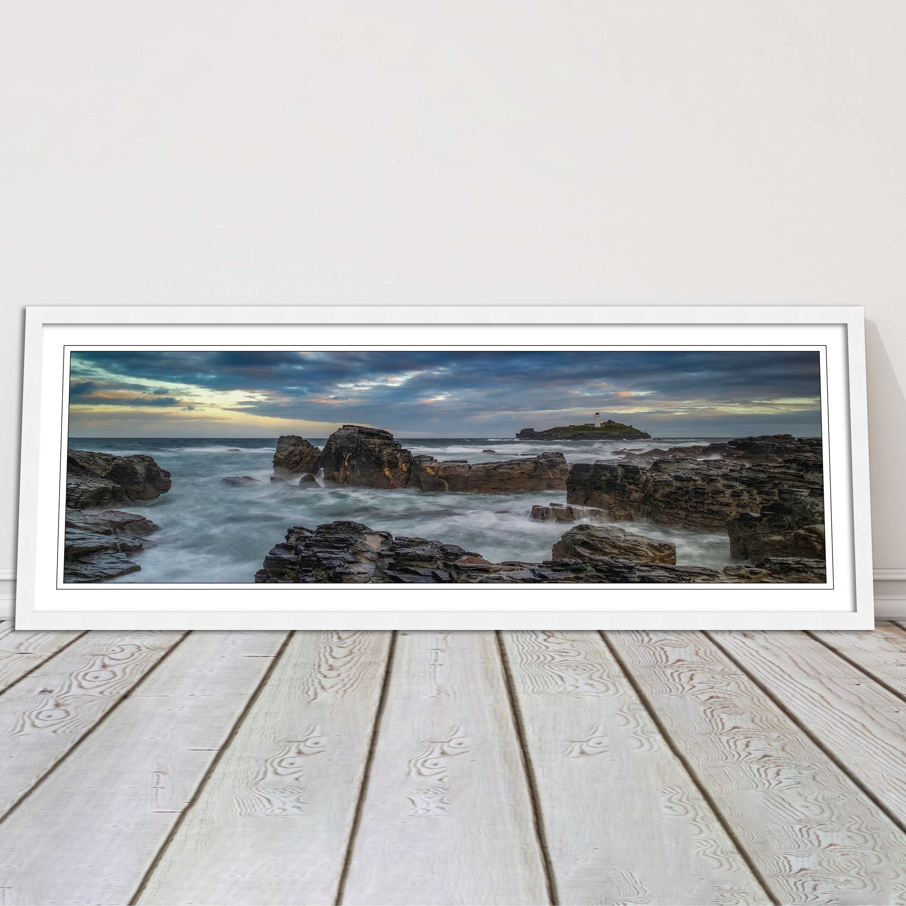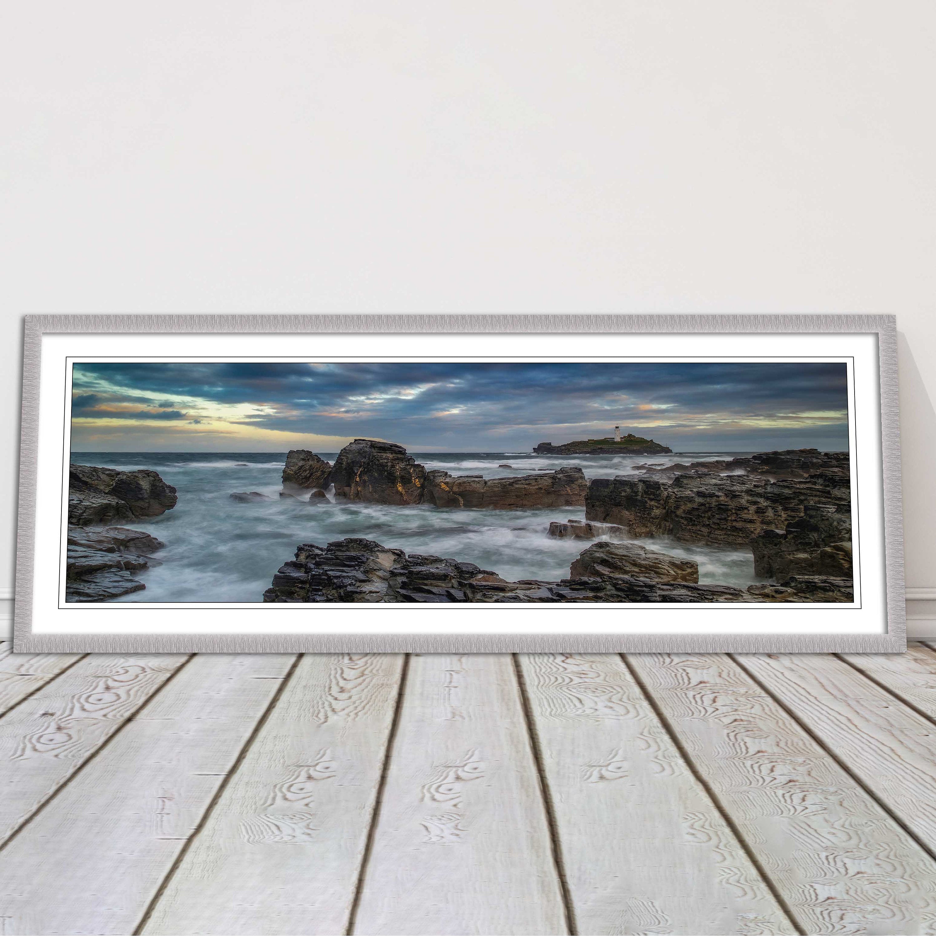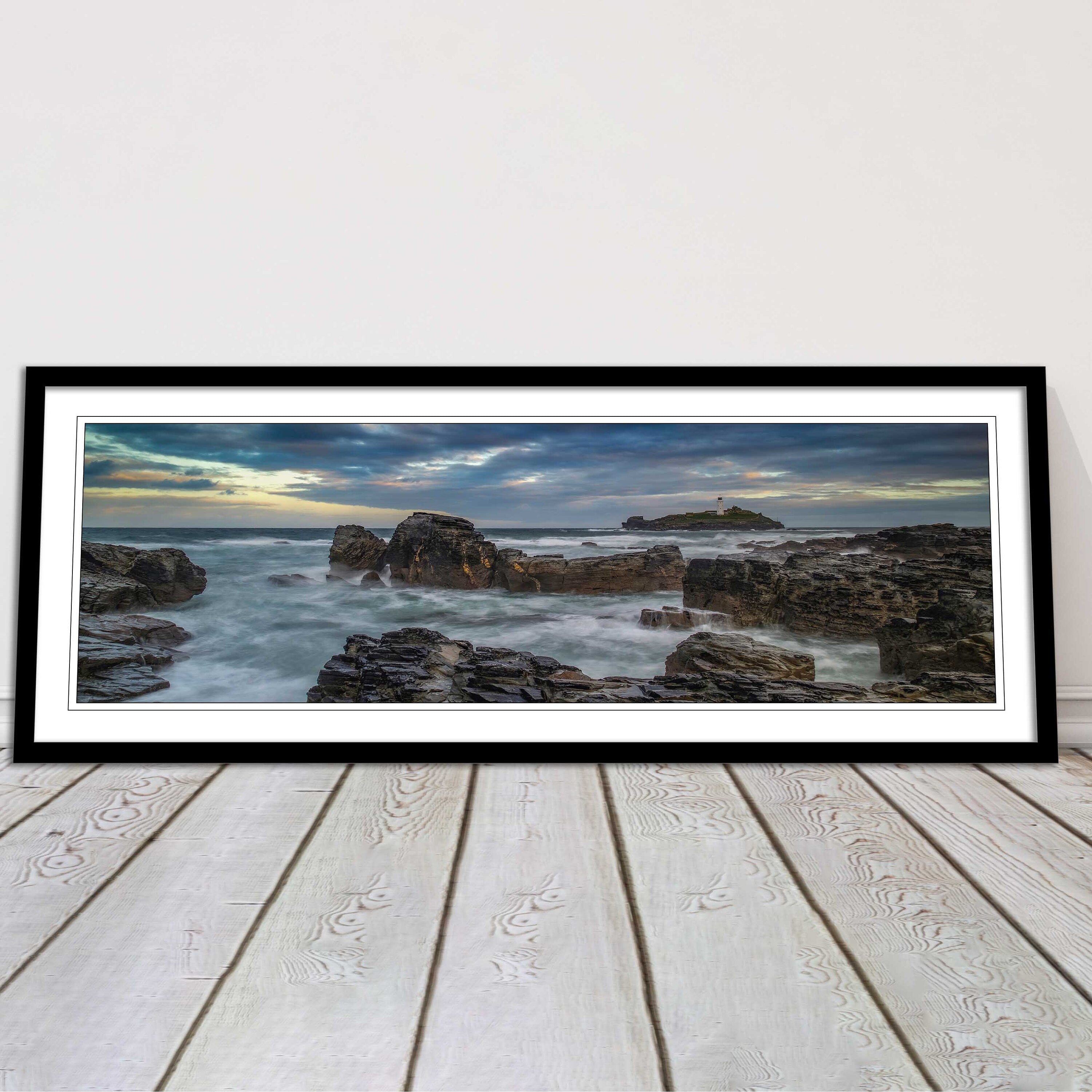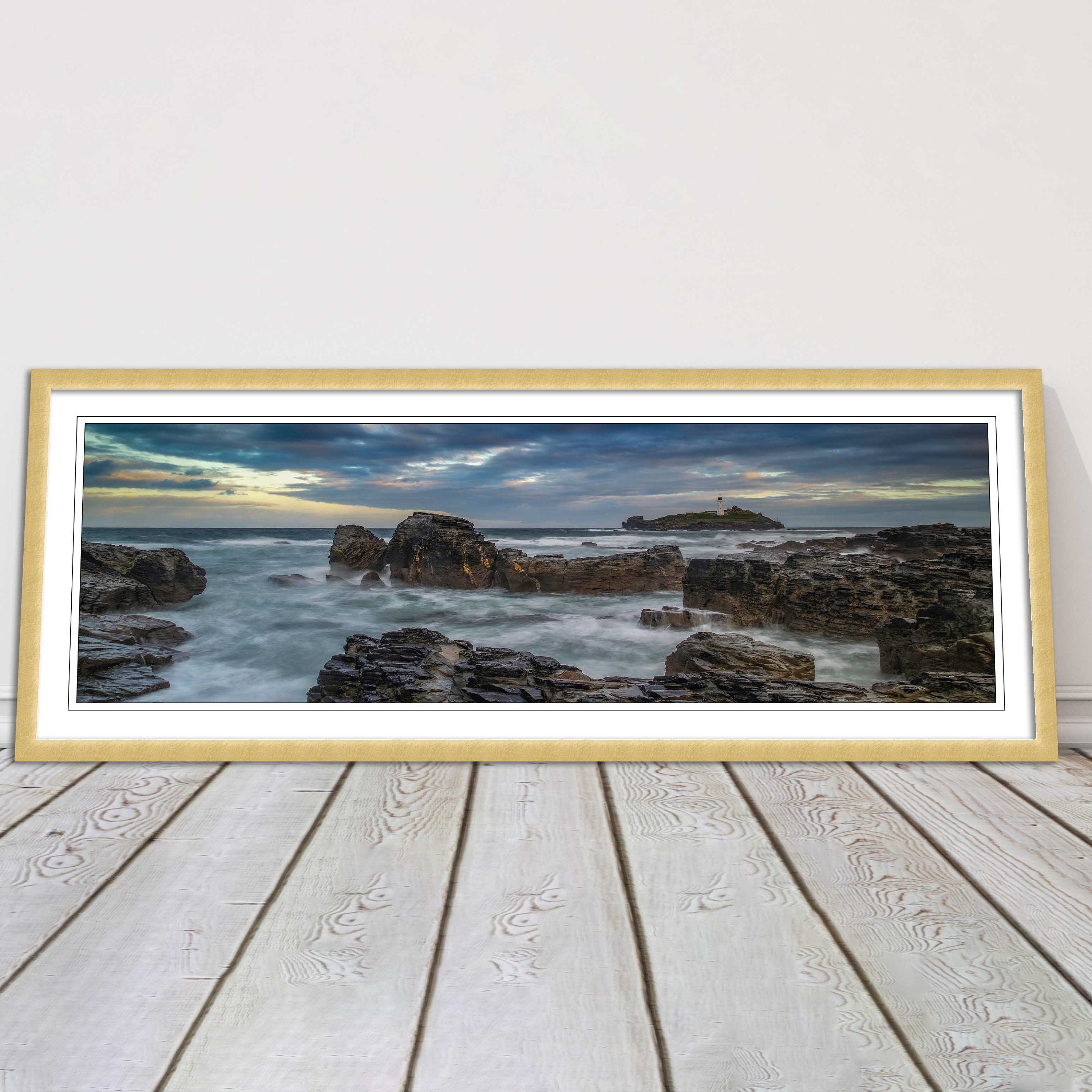 A beautiful panoramic framed picture of Godrevy Lighthouse, Cornwall. Stormy sky. Choose from a choice of frame styles.