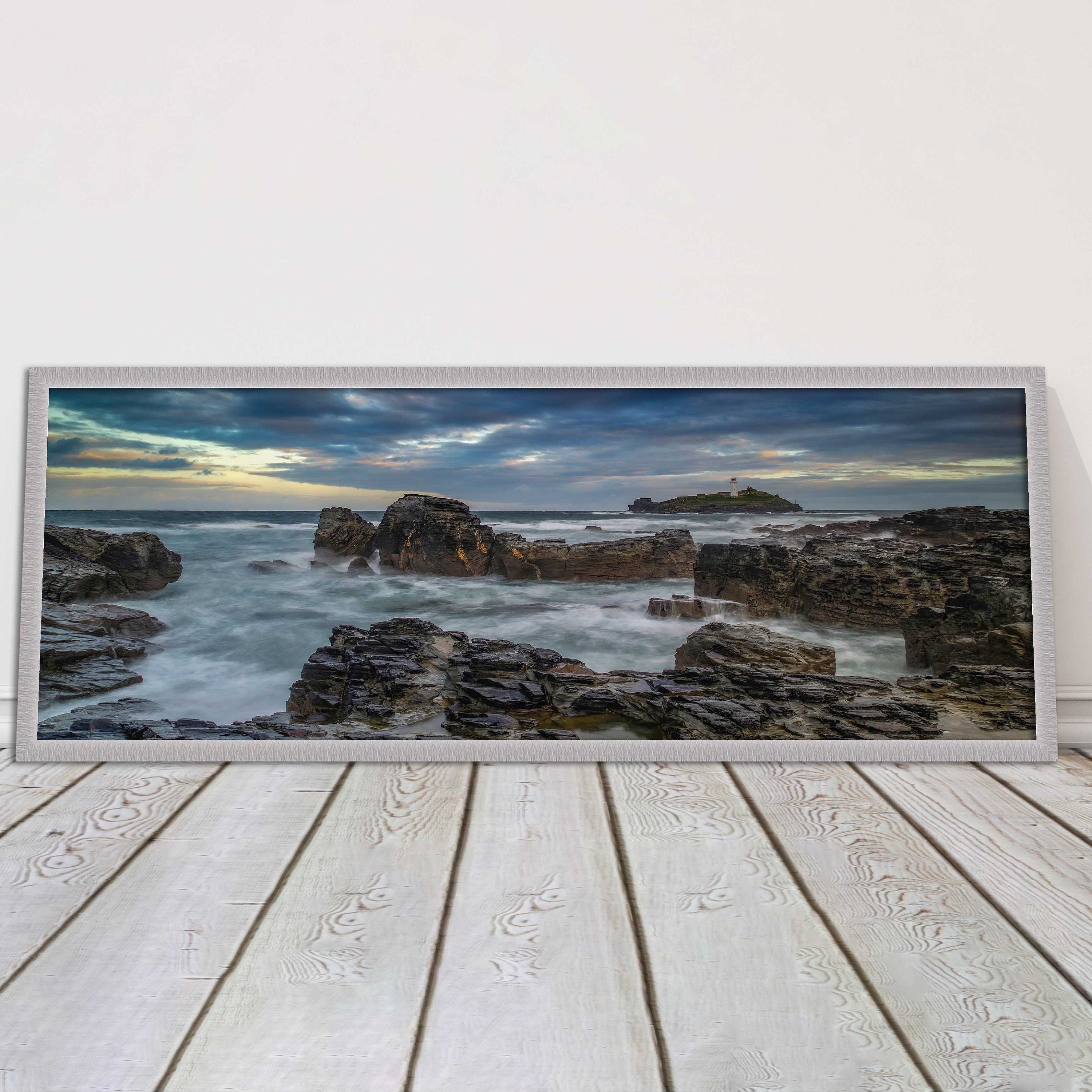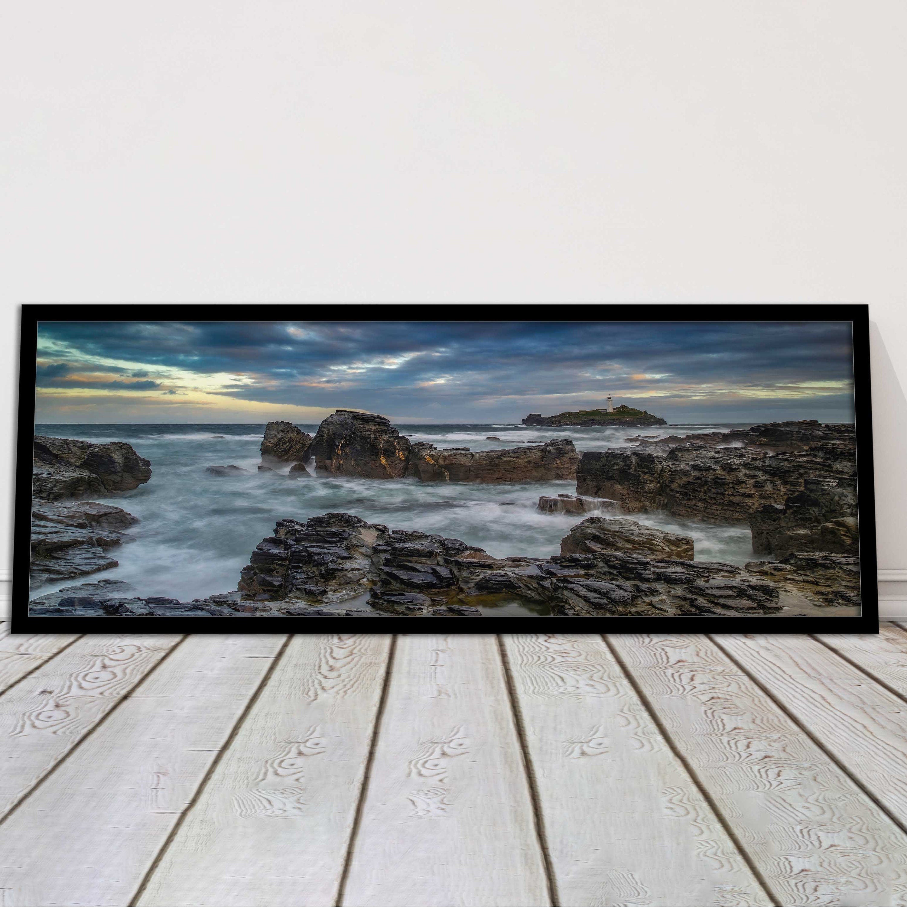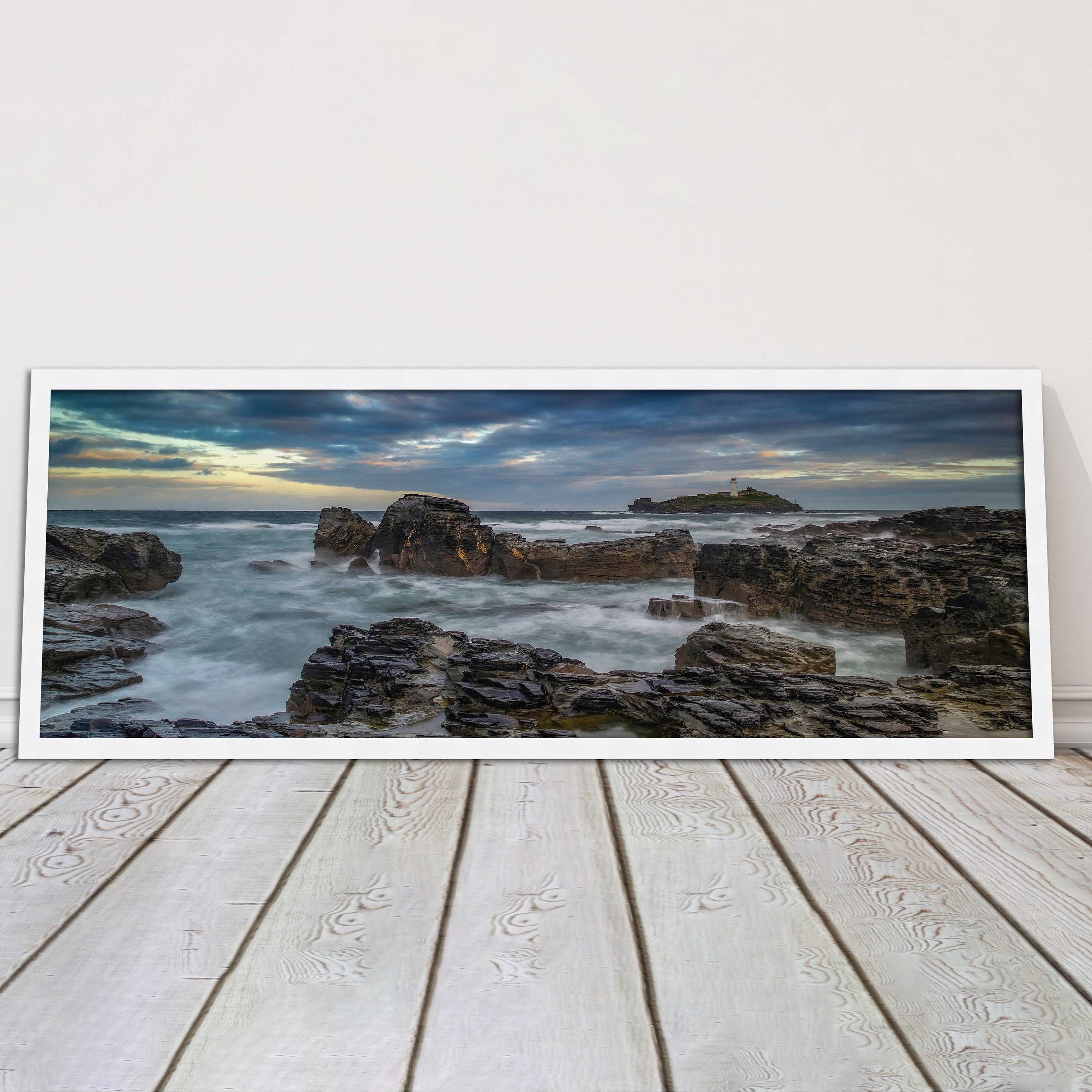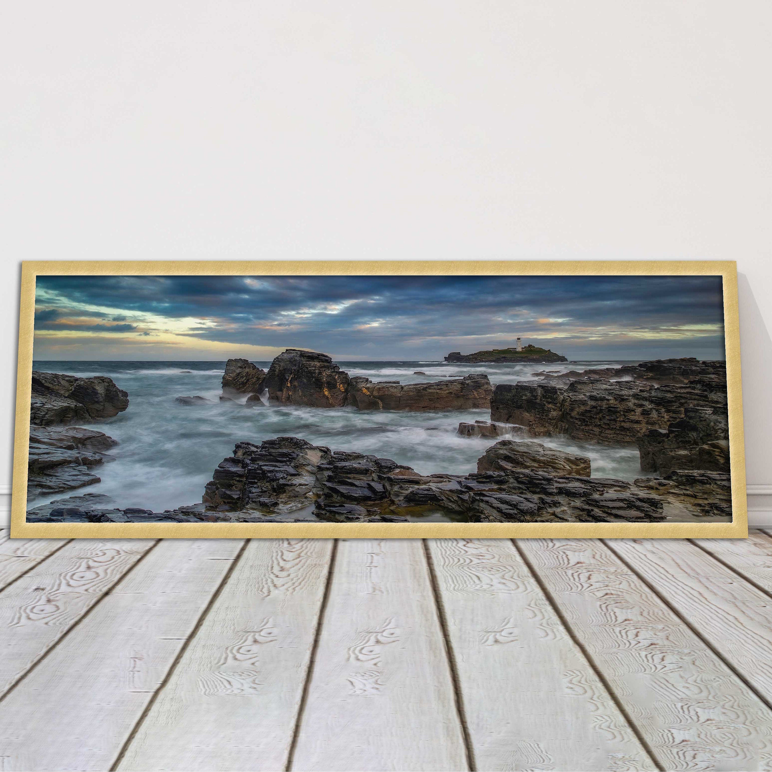 A beautiful panoramic framed picture of Godrevy Lighthouse, Cornwall. Stormy sky. Choose from a choice of frame styles.