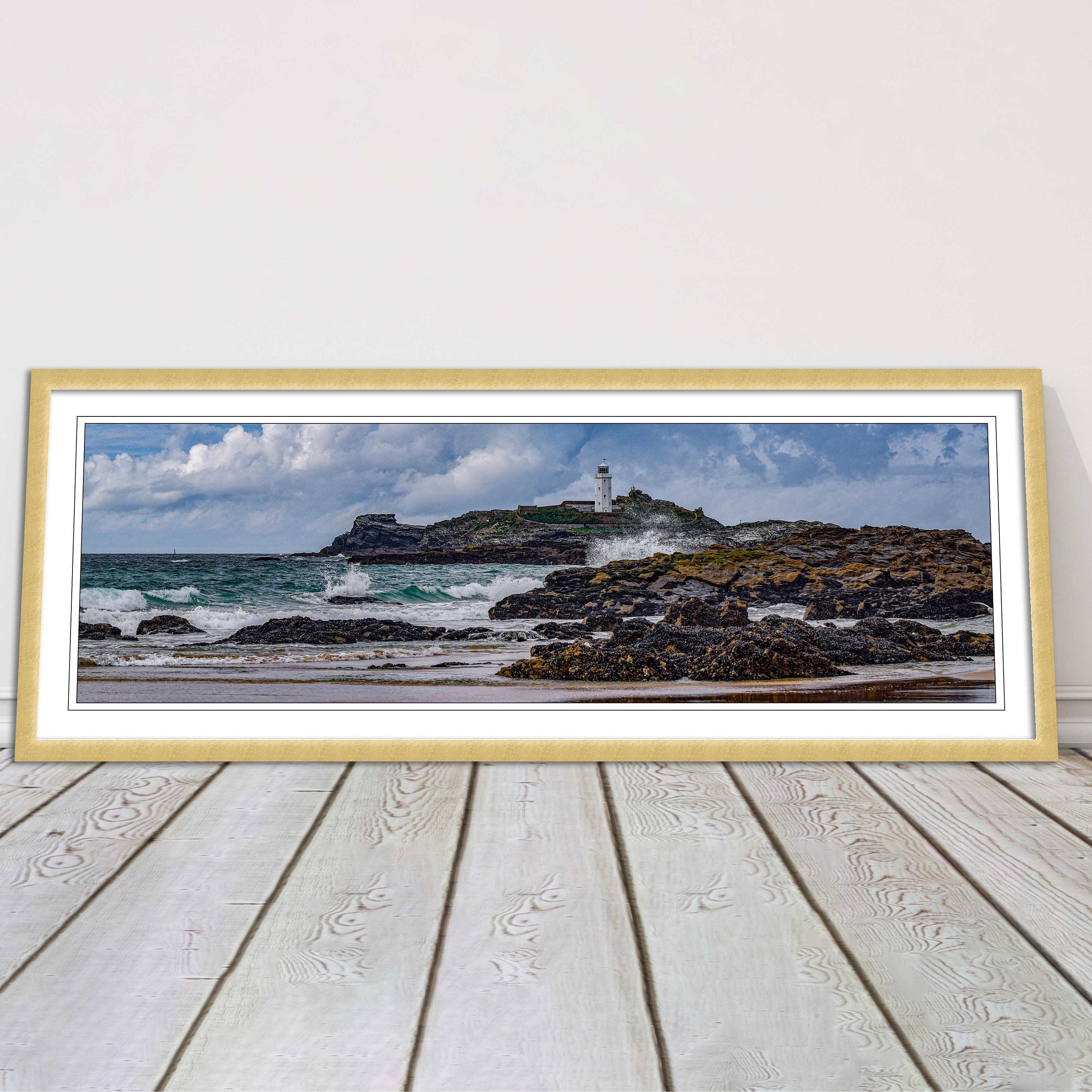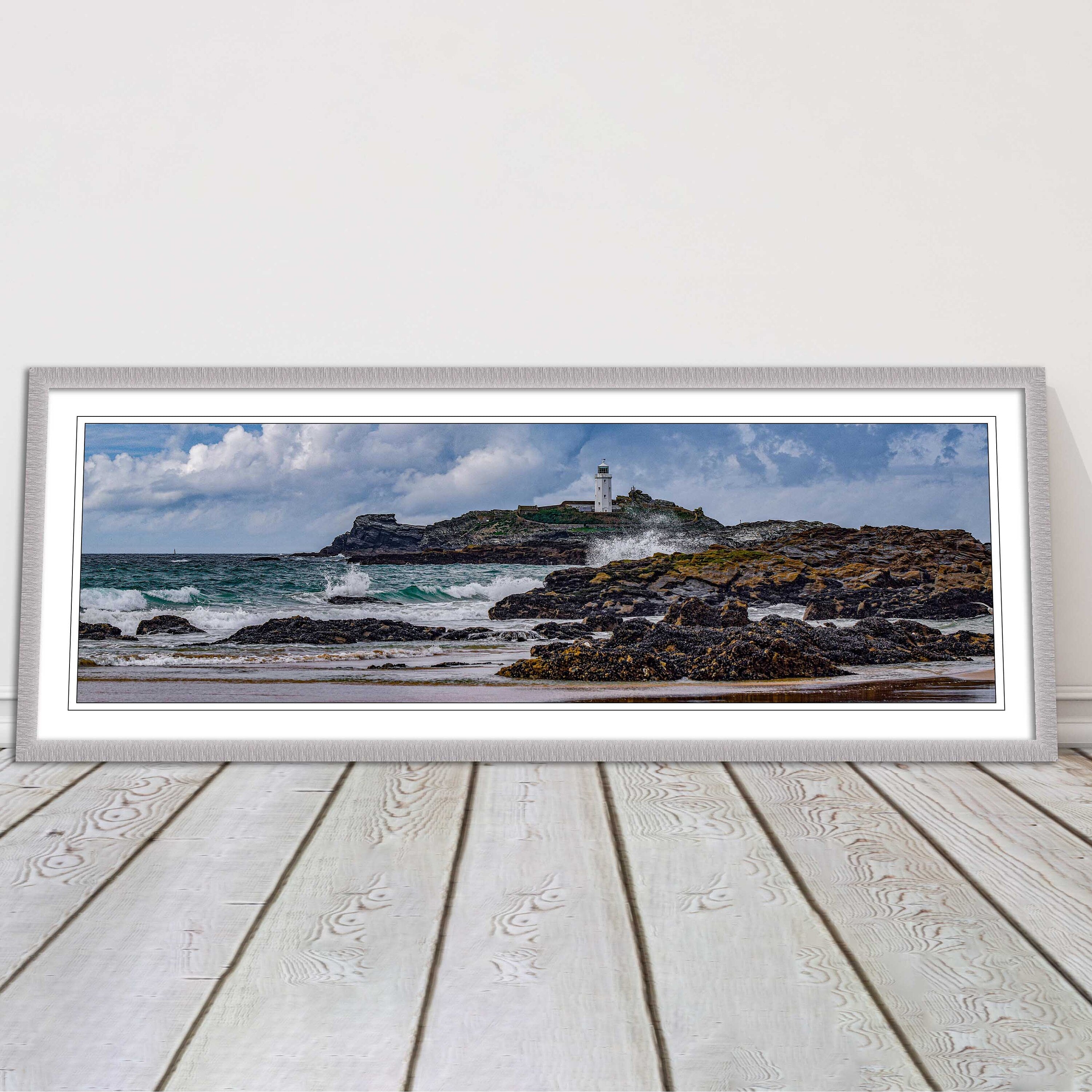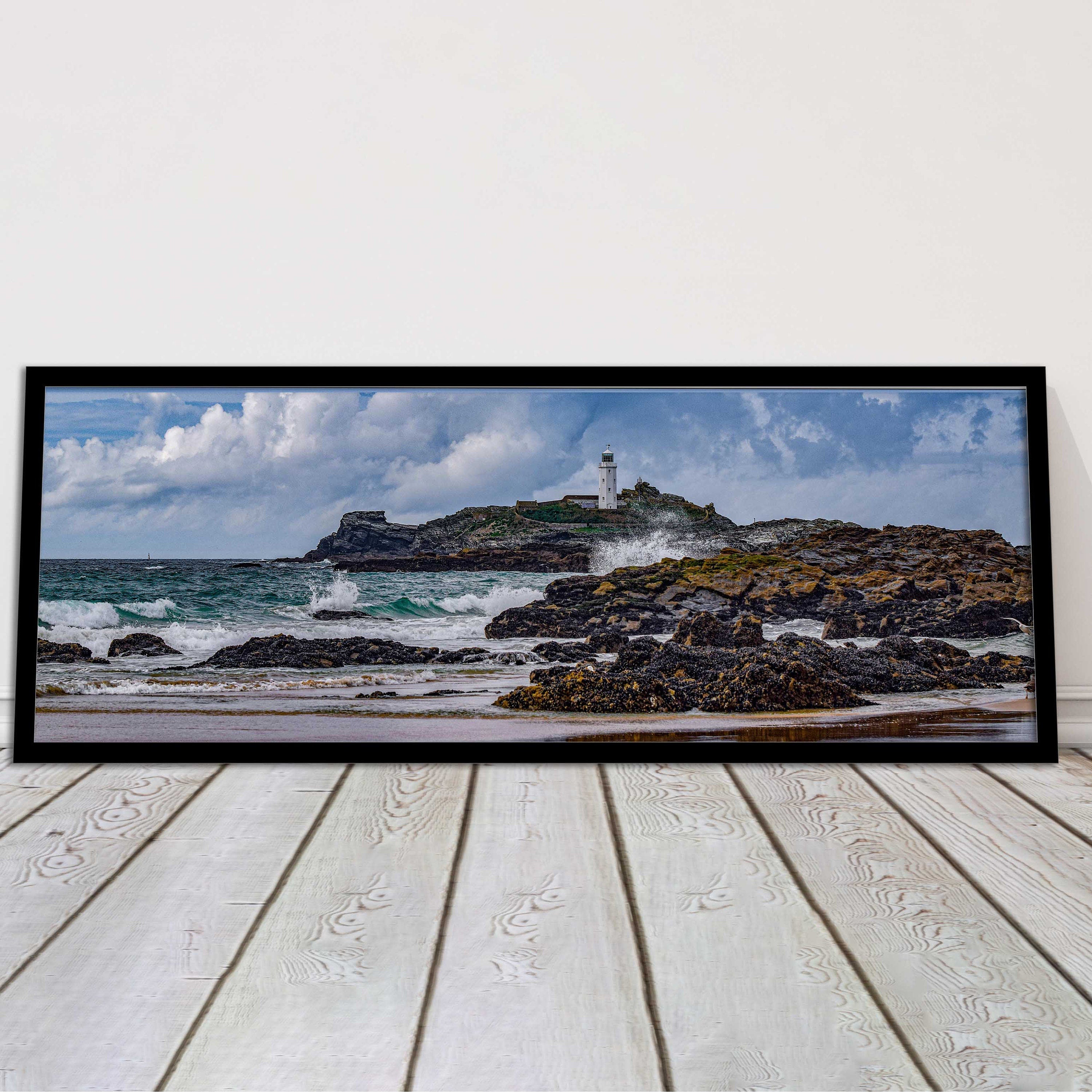 A beautiful panoramic framed picture of Godrevy Lighthouse with breaking waves at the shore, Cornwall. Stormy sky. Choose from a choice of frame styles.