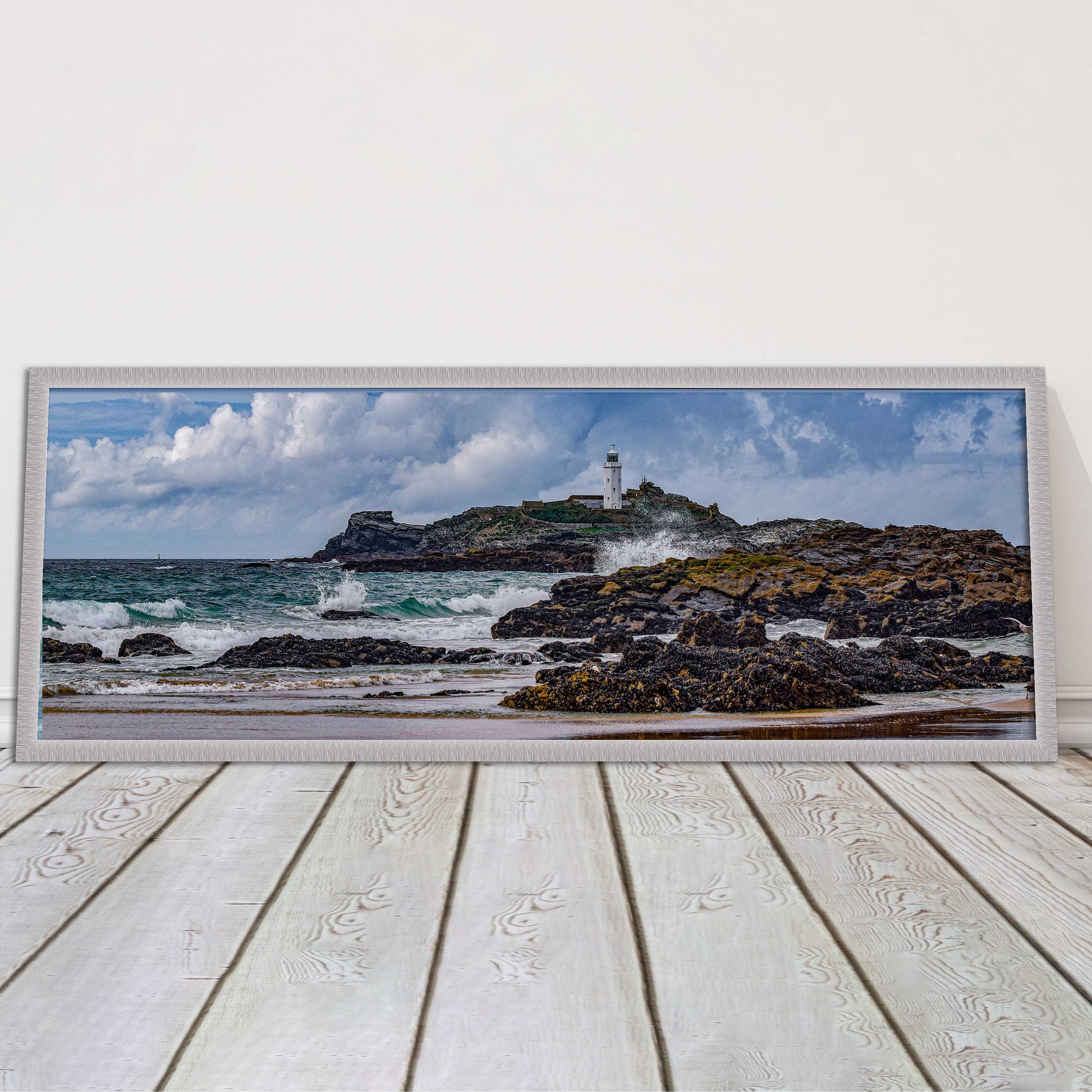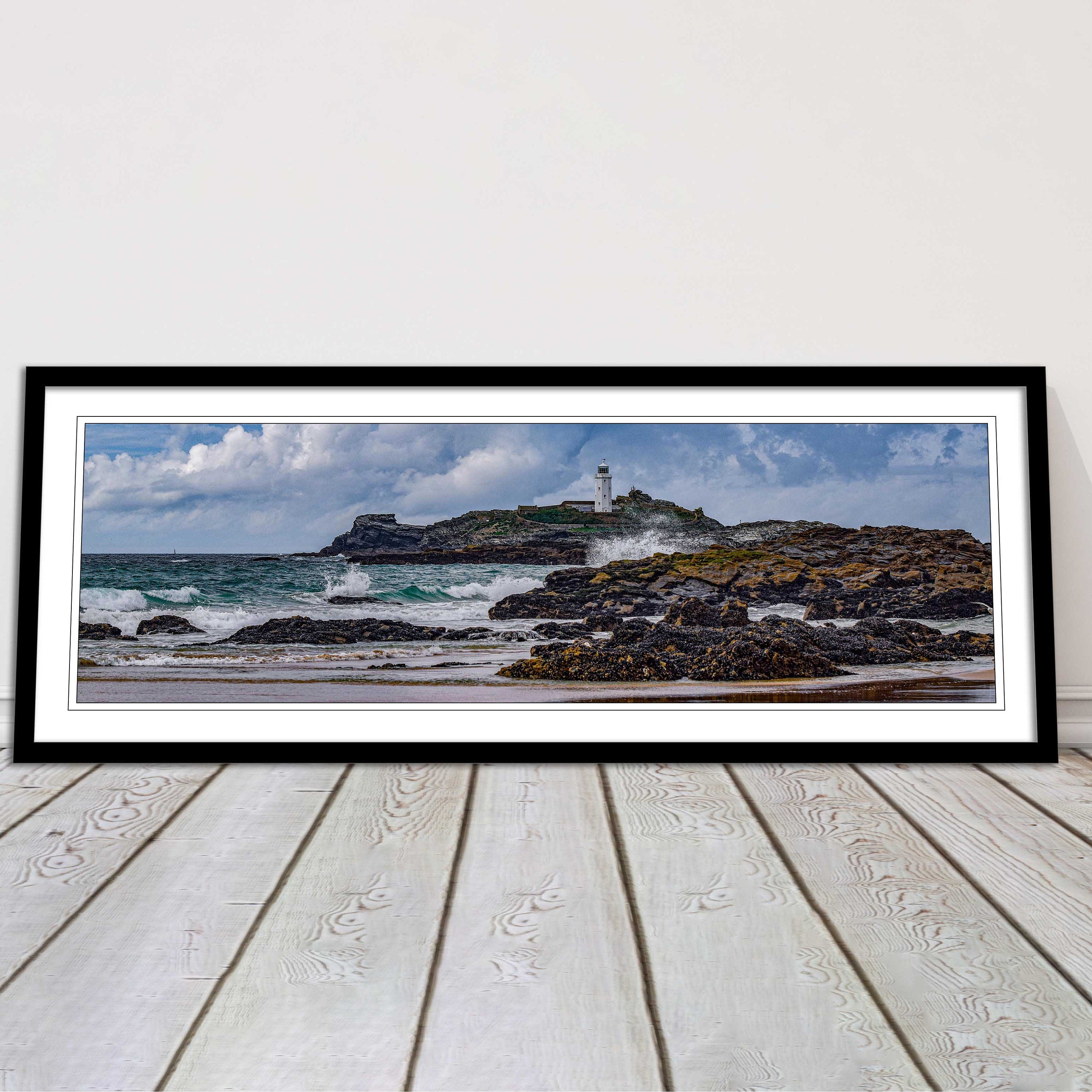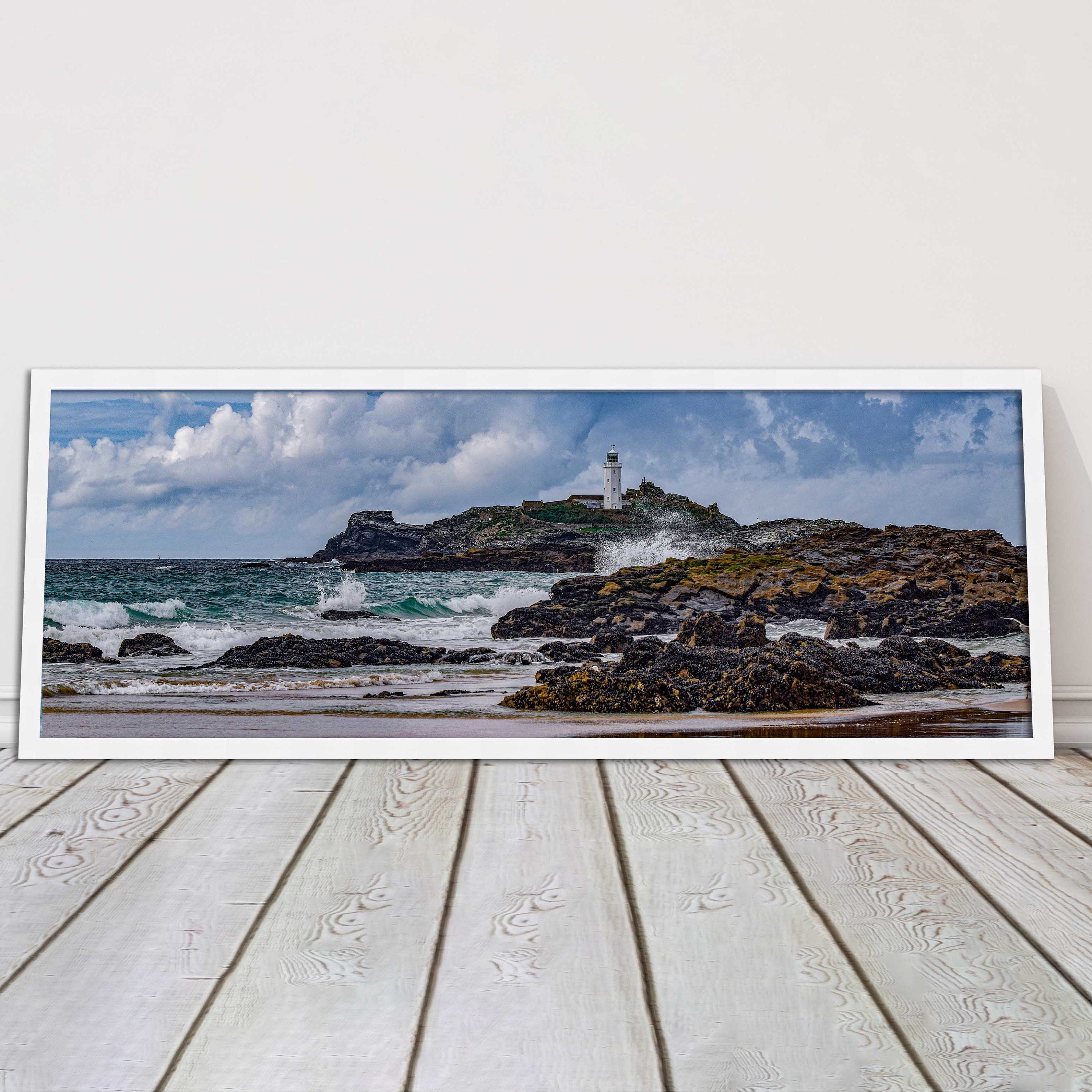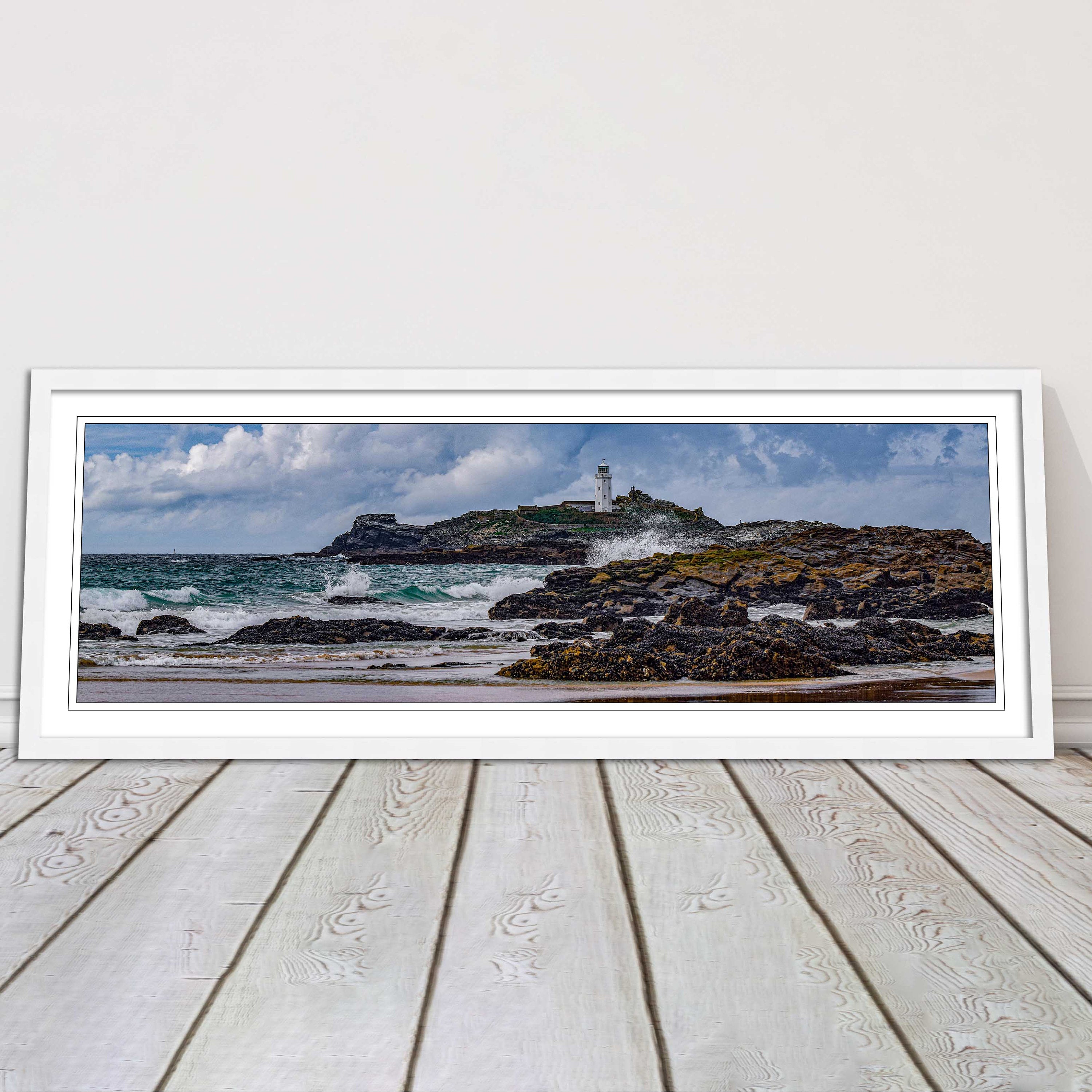 A beautiful panoramic framed picture of Godrevy Lighthouse with breaking waves at the shore, Cornwall. Stormy sky. Choose from a choice of frame styles.