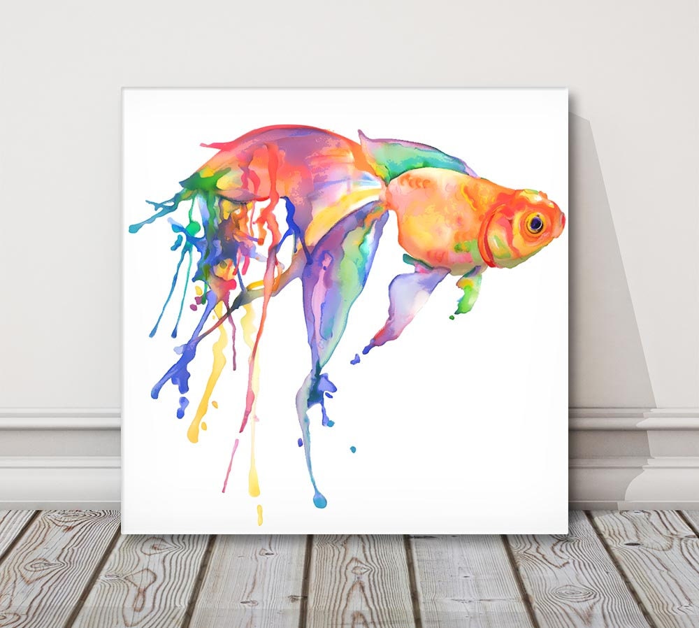 Goldfish painted in rainbow watercolours. Canvas picture print on a white background. Available to order in a choice of sizes.