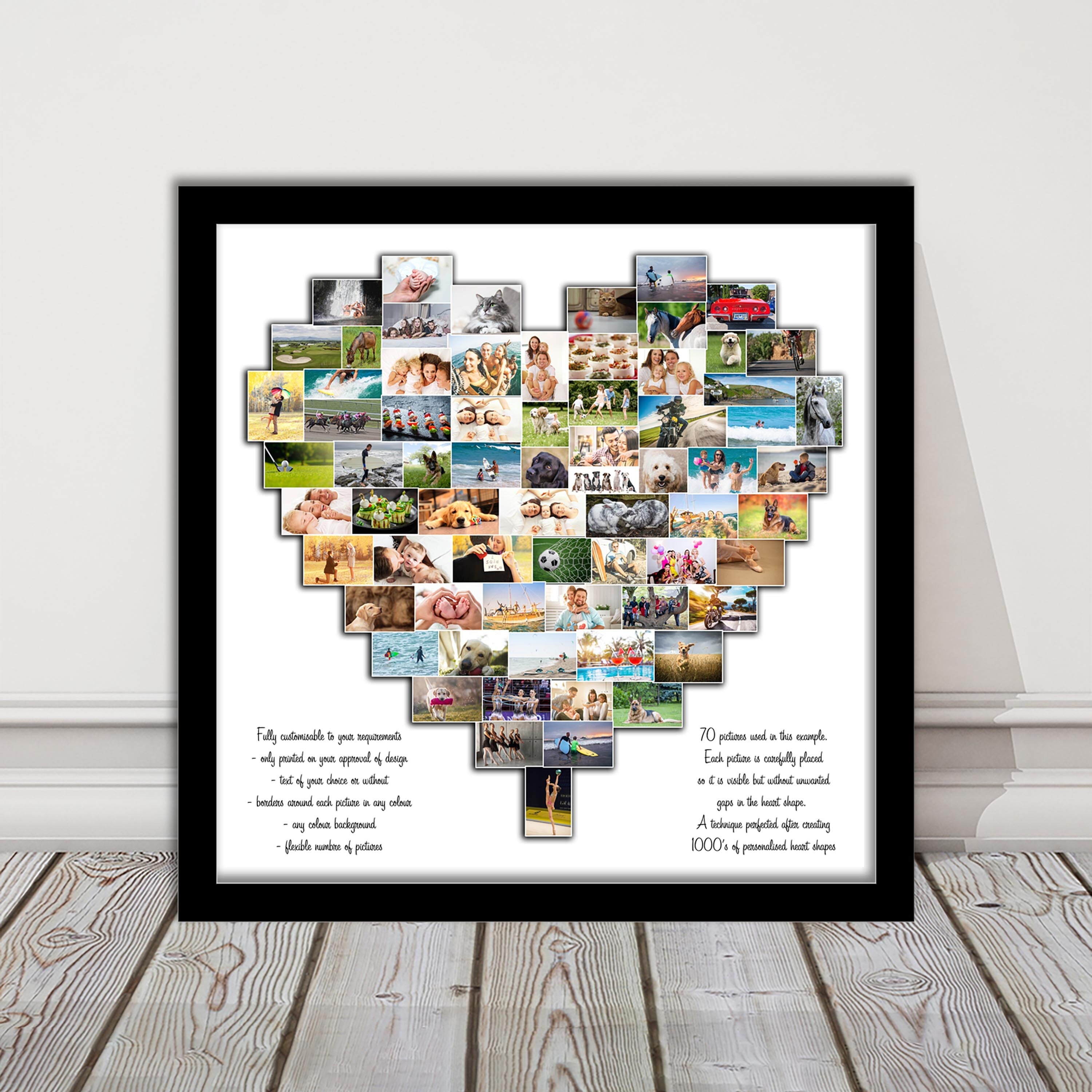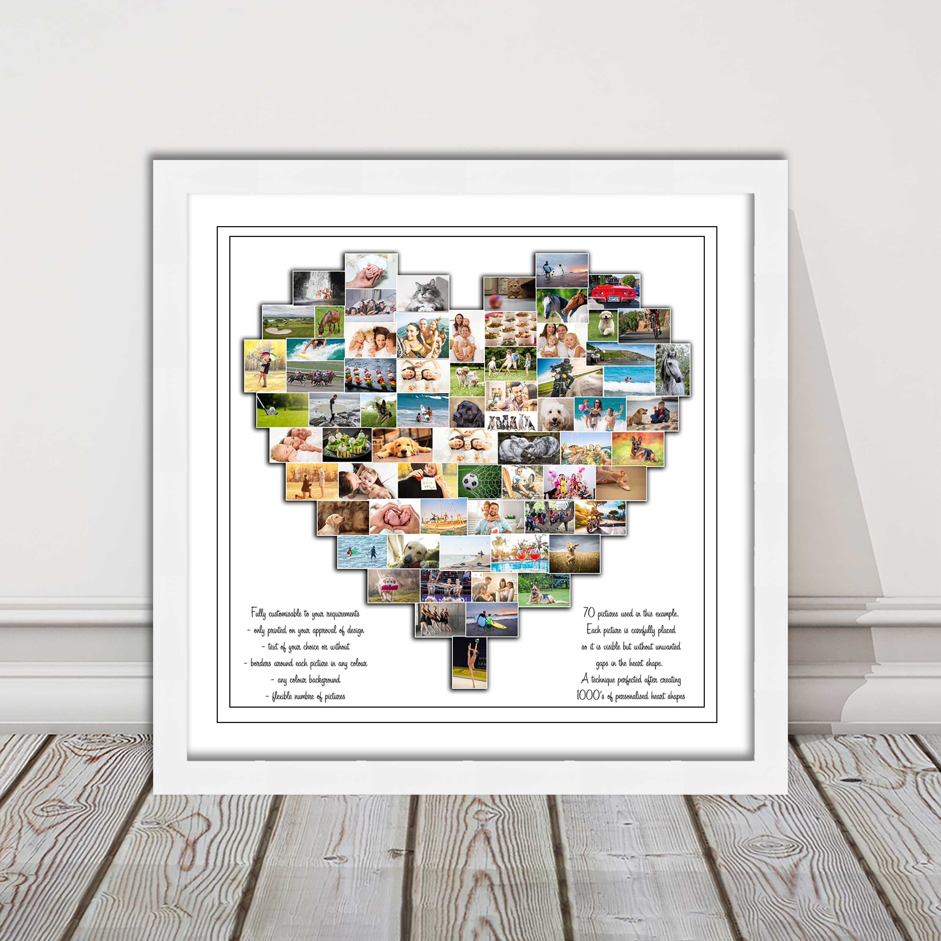 A Stunning personalised heart shaped picture print. Each heart is hand designed with every picture individually placed to ensure they can all be viewed and also so the layout is complete without gaps. Very easy to upload your favourite photos and have some of your special memories in a beautiful collage. Perfect gift for birthdays, anniversaries, weddings and holidays.