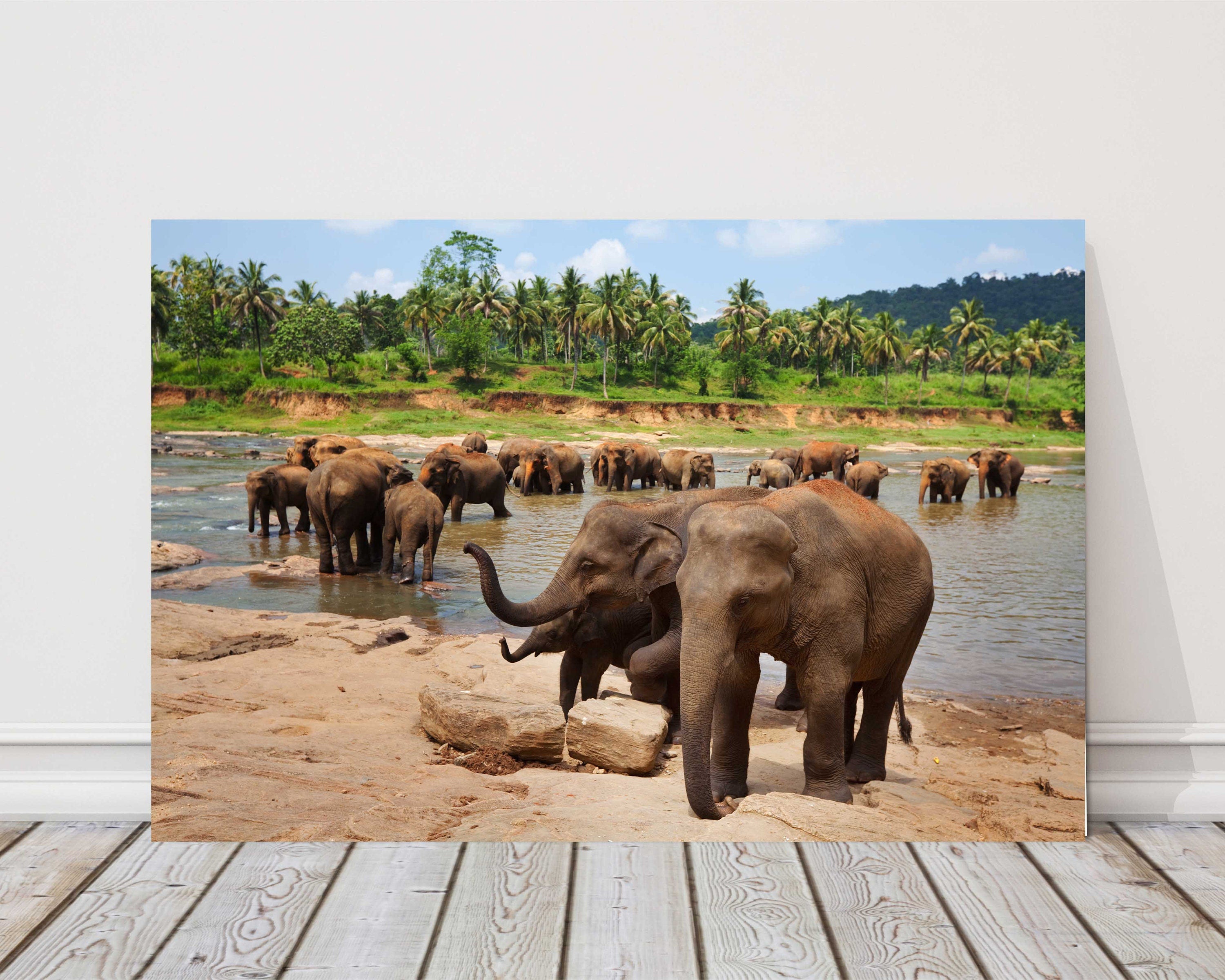 Herd of Elephants in Sri Lanka. Bathing and drinking in a river Printed and framed as a canvas picture print available in a choice of sizes.