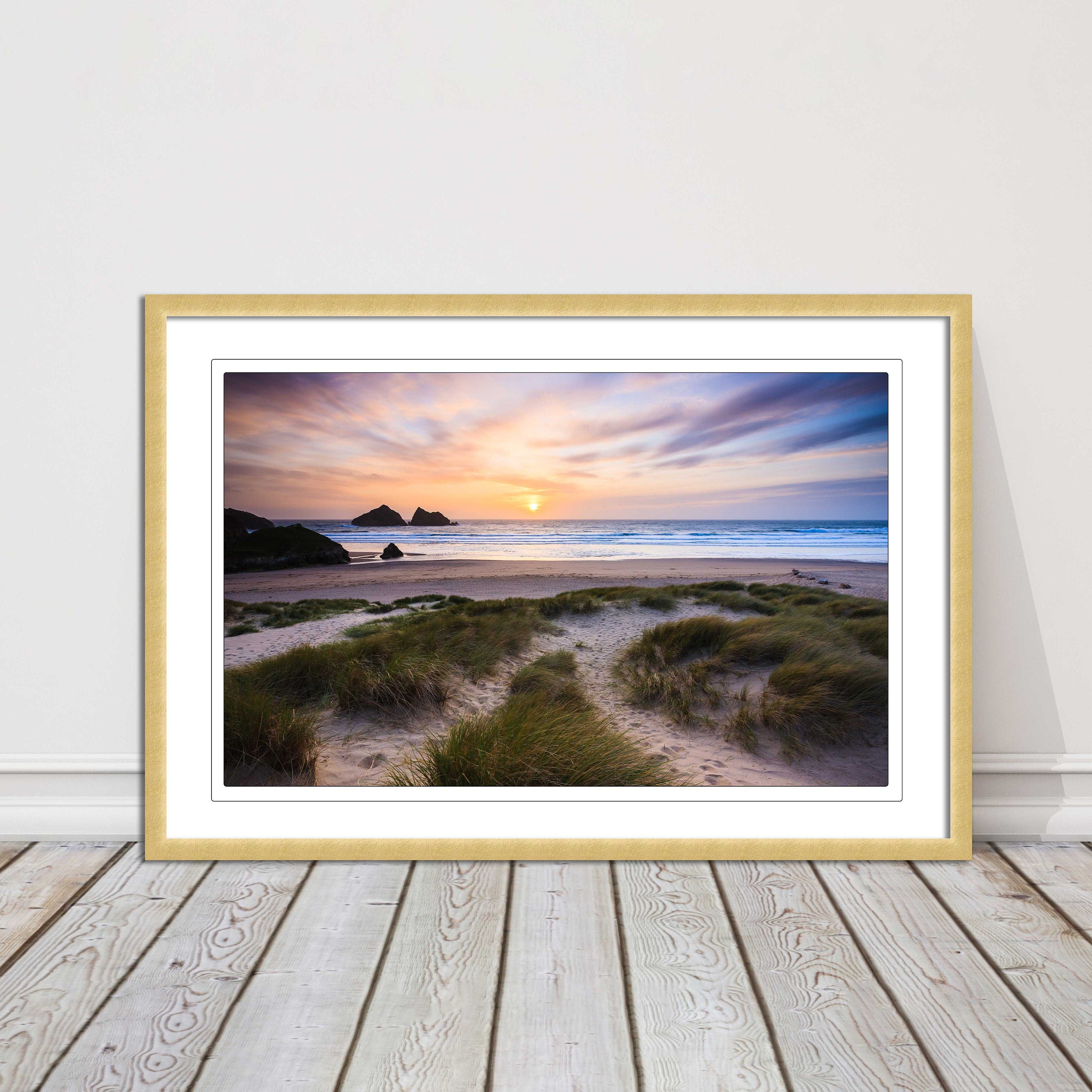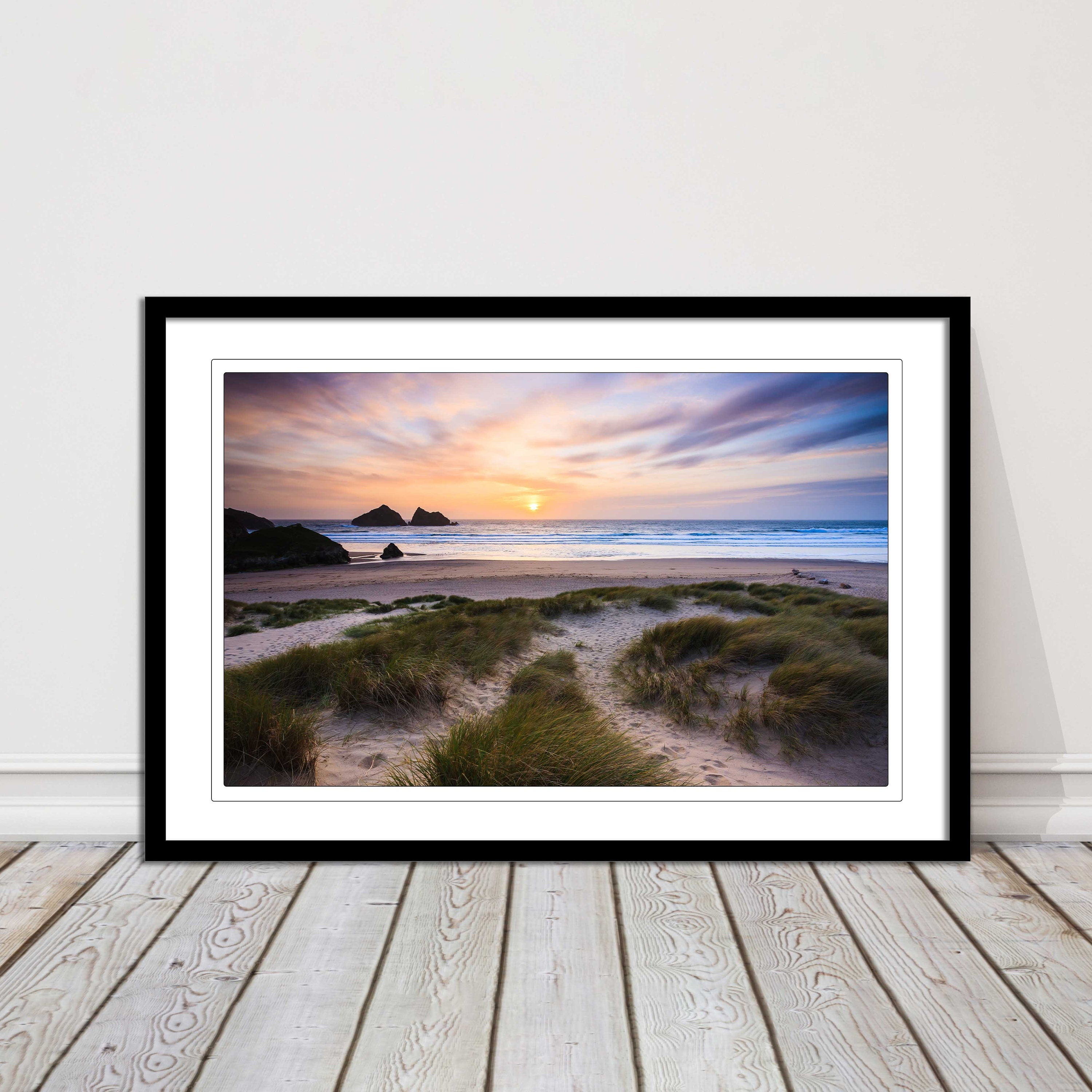 A beautiful framed picture of holywell bay near newquay in cornwall at sunset. Choose from a choice of frame styles.