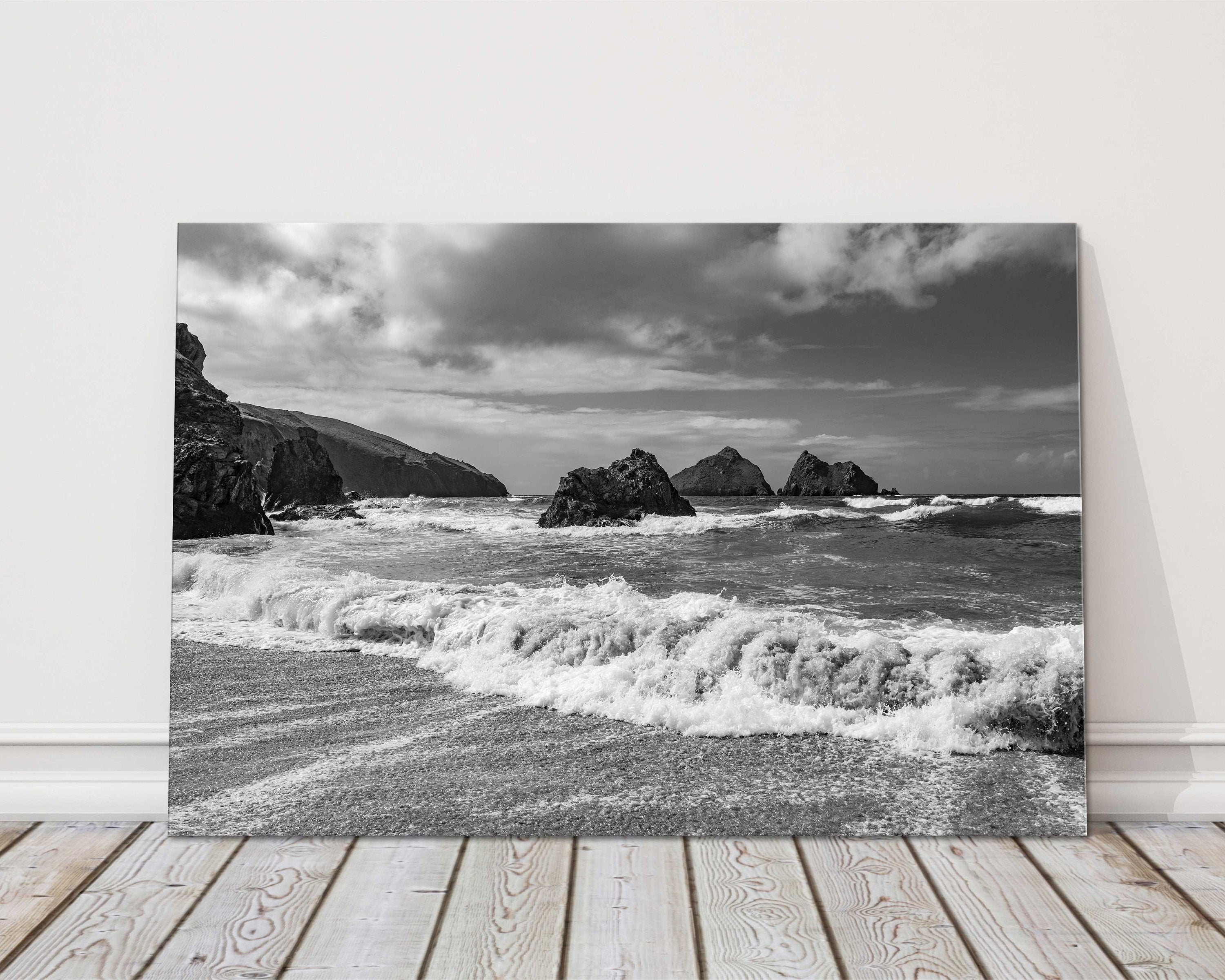 Holywell Bay, Cornwall. Black and white Canvas picture print. Iconic Gul rock pictured from the beach as the waves roll in. Available to order in a choice of sizes.