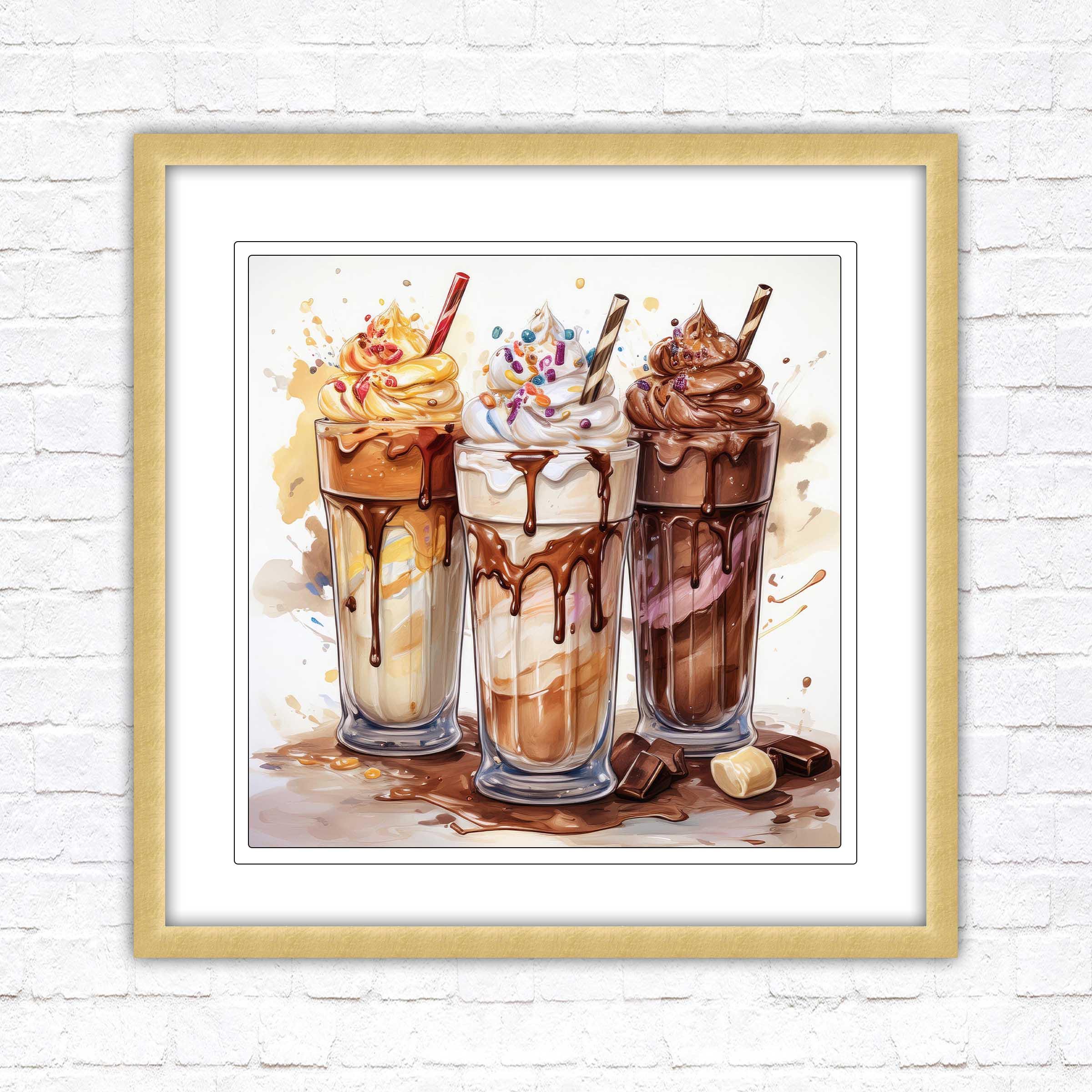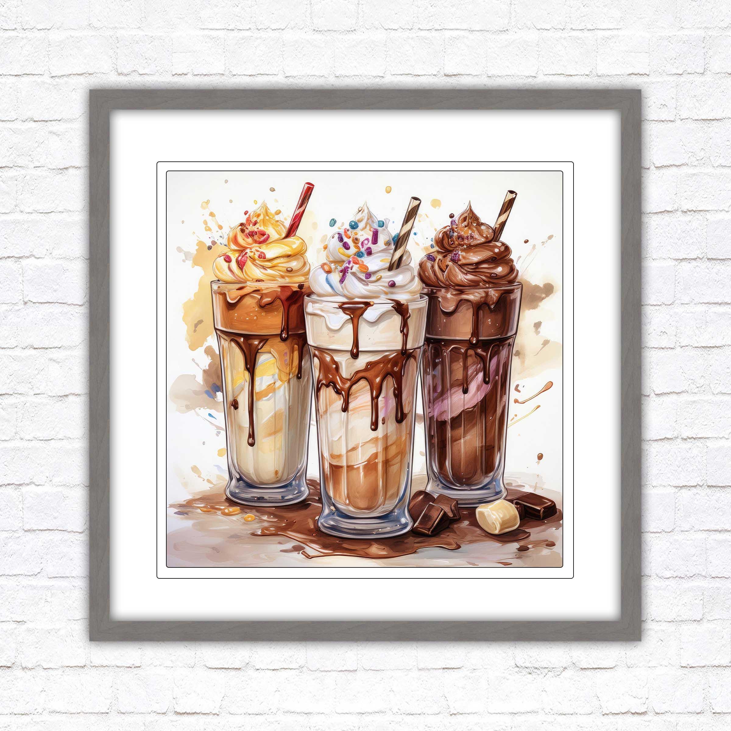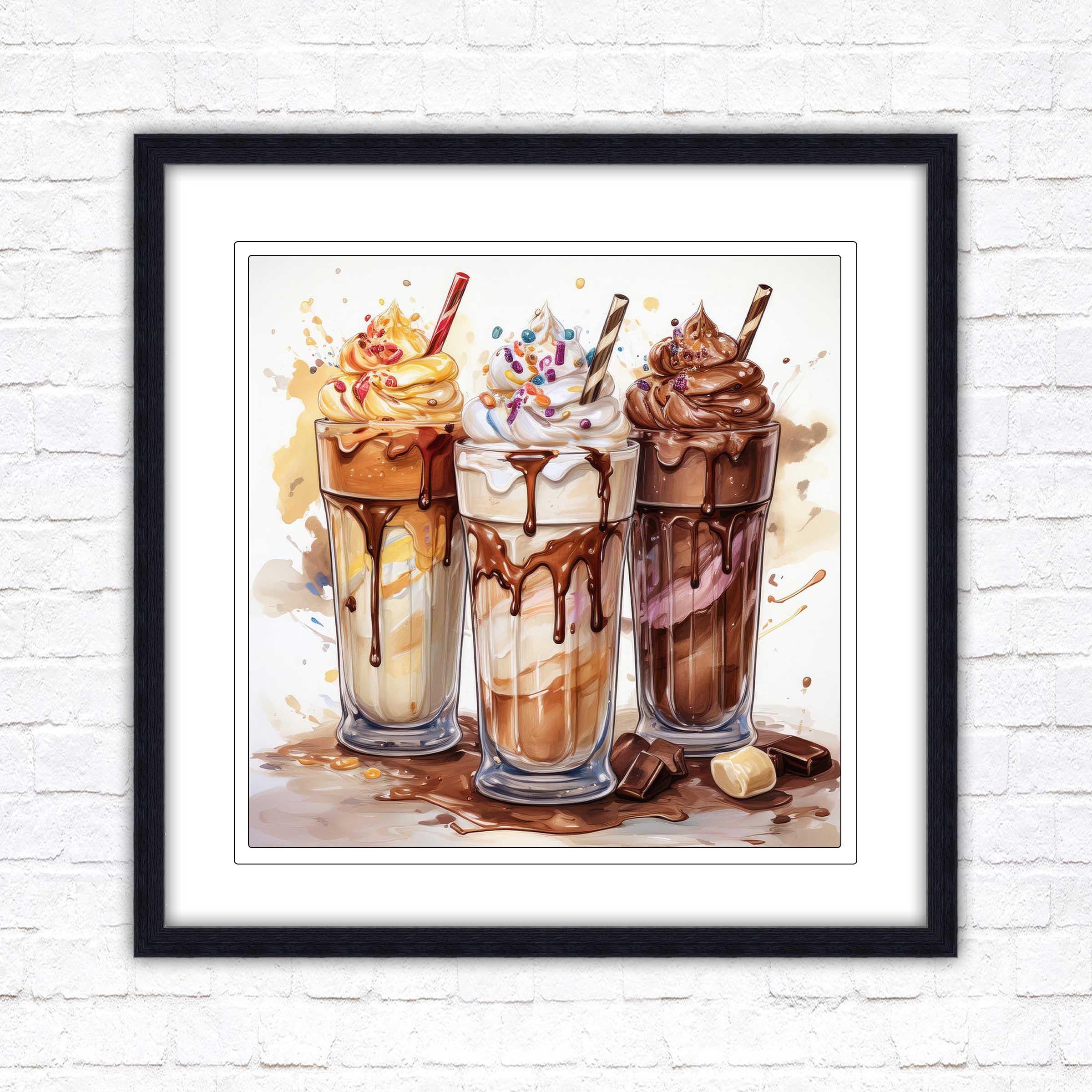 Ice cream Milkshakes, Watercolour painting, Framed picture print. Perfect wall décor for kitchen, café or restaurant. Choose from a choice of frame styles and sizes.