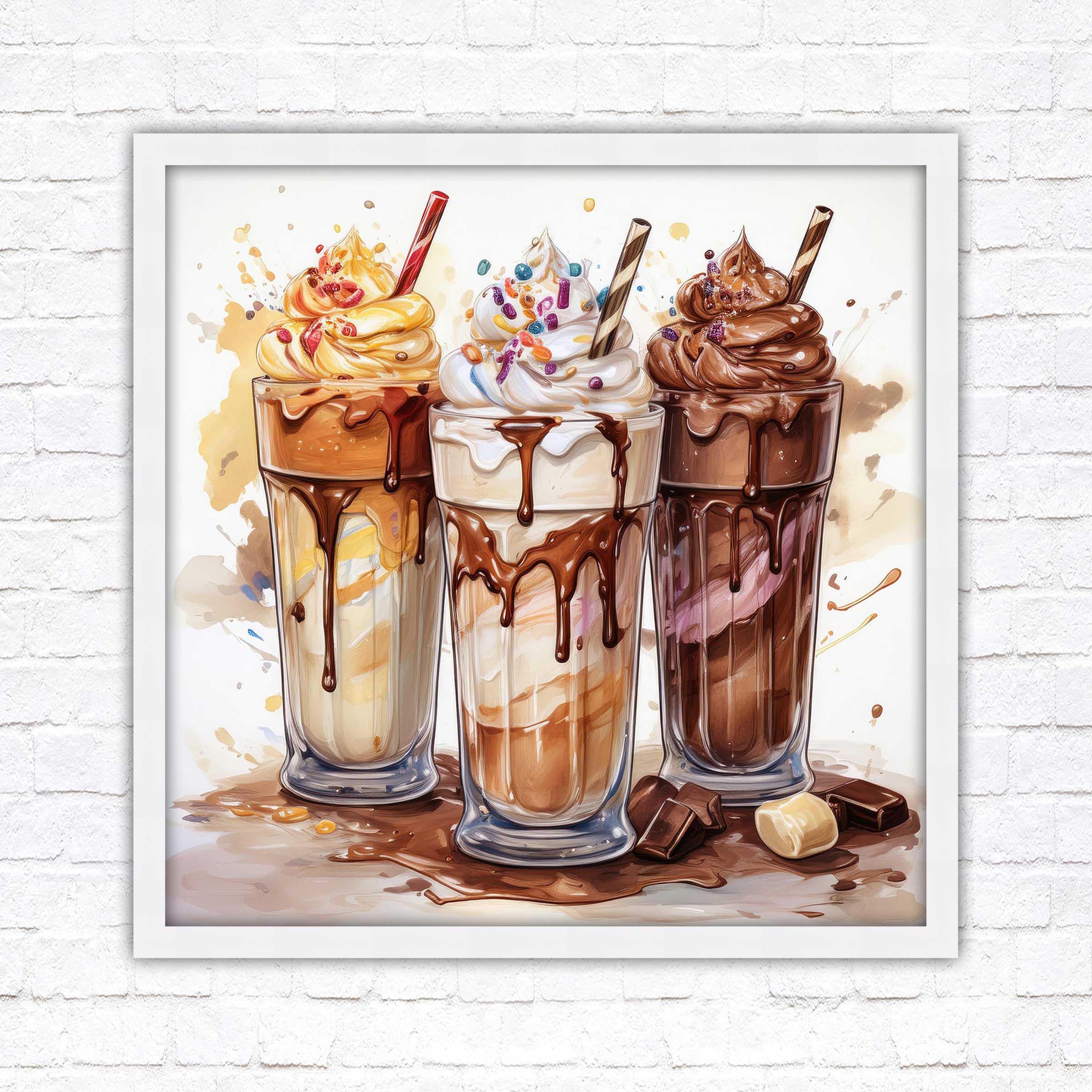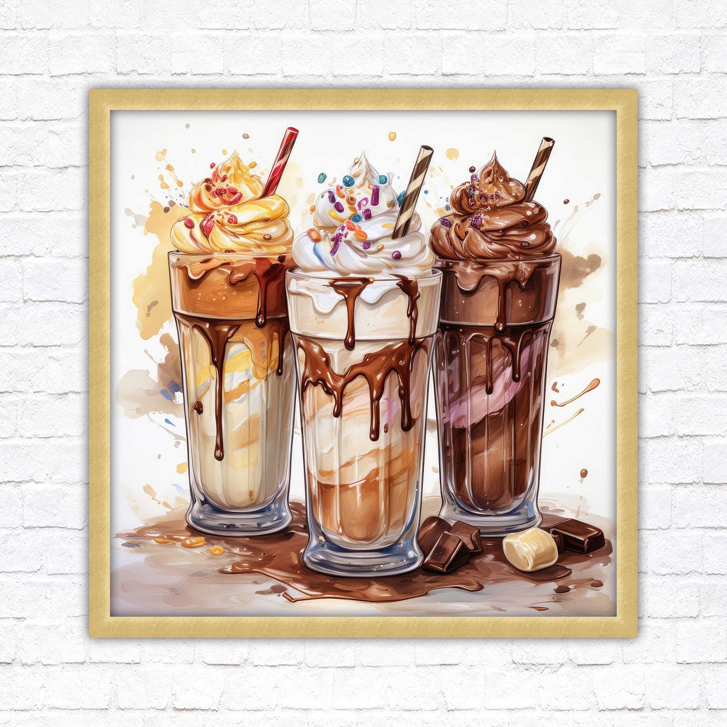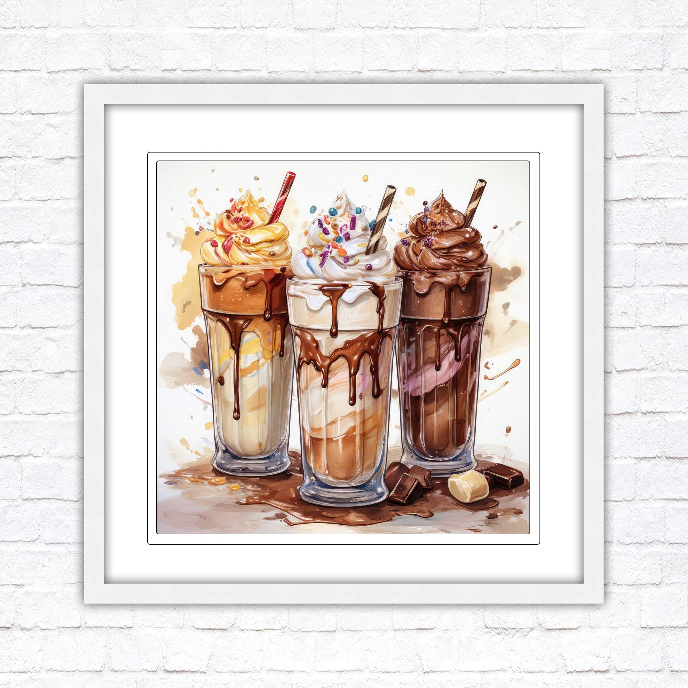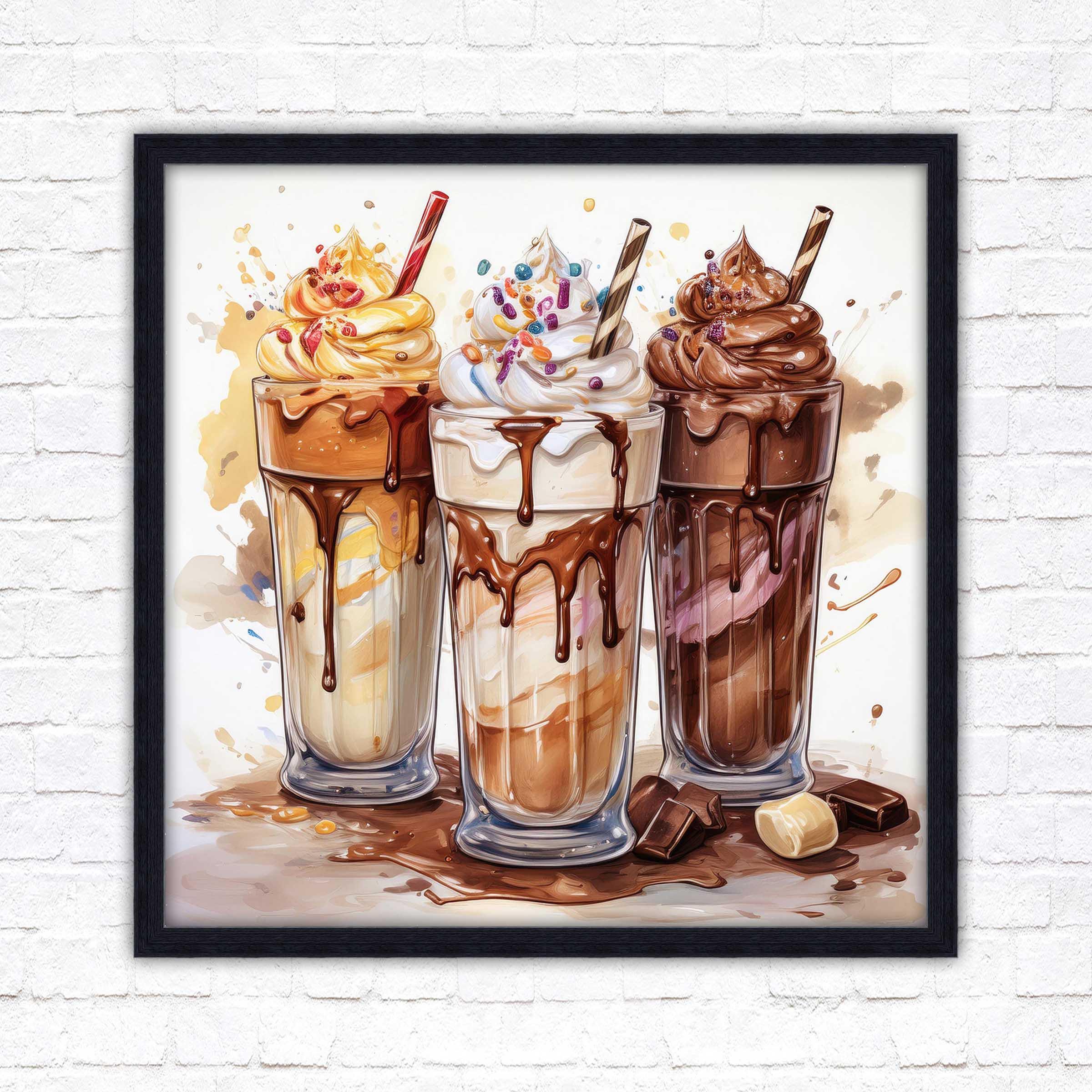 Ice cream Milkshakes, Watercolour painting, Framed picture print. Perfect wall décor for kitchen, café or restaurant. Choose from a choice of frame styles and sizes.