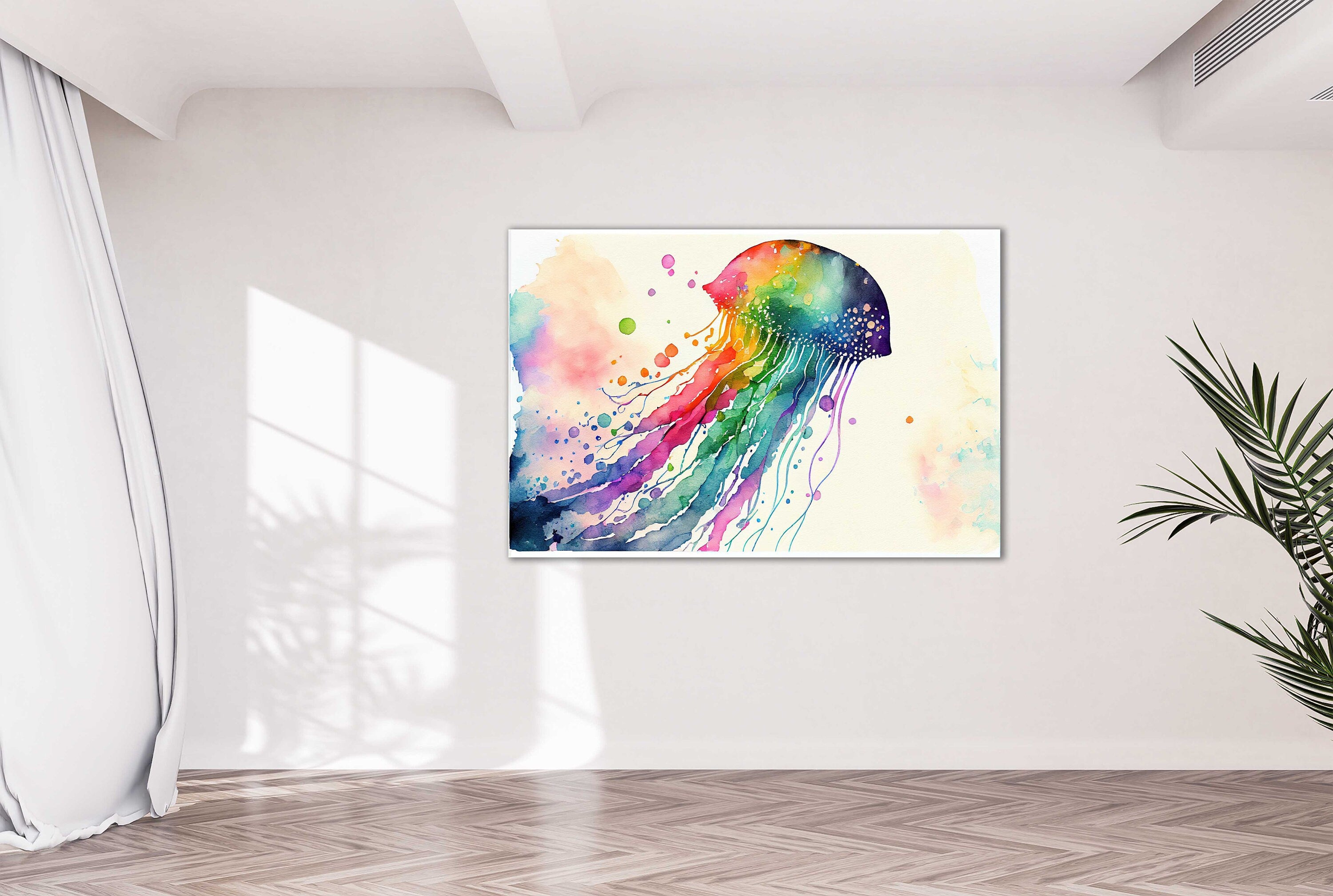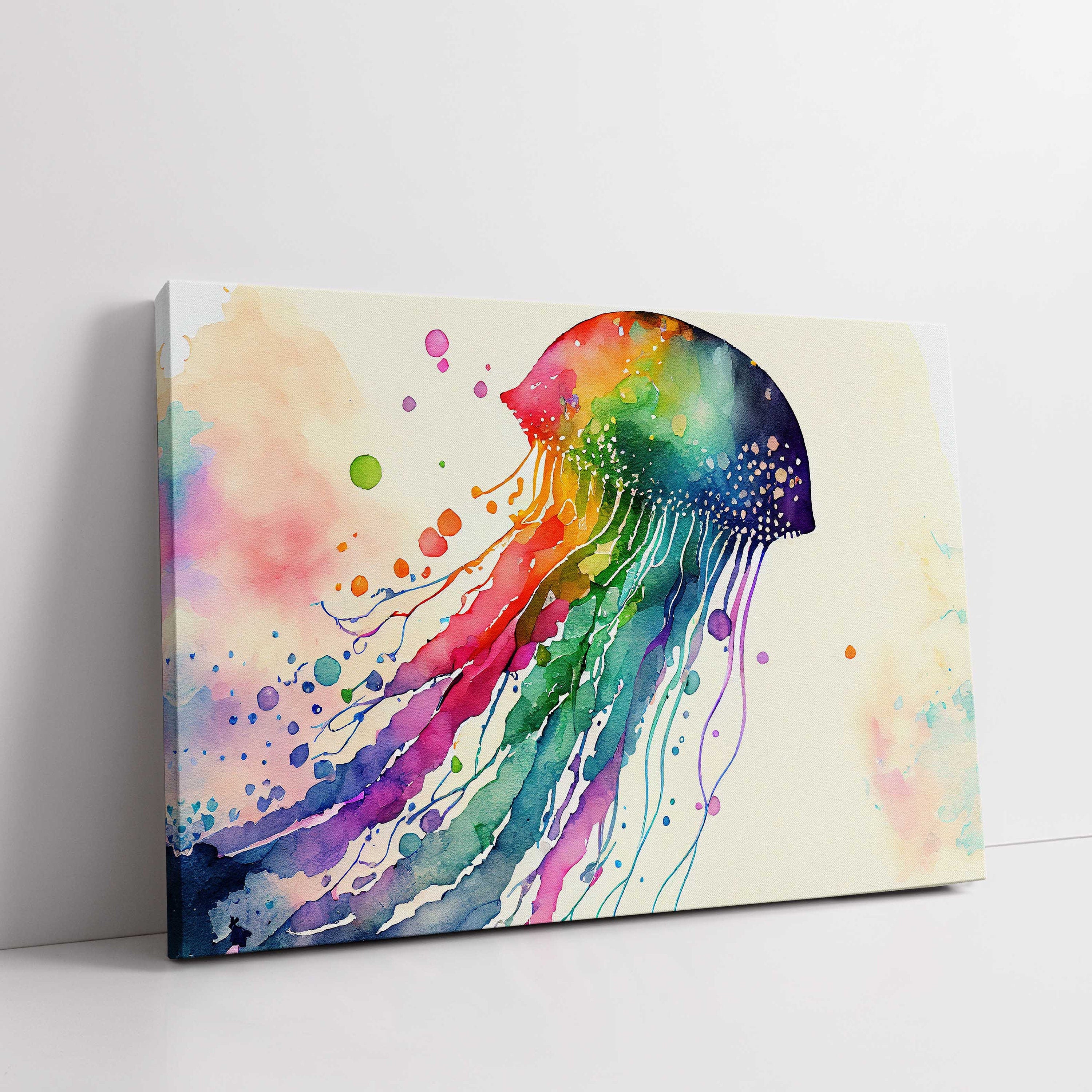 Jellyfish, rainbow colour splash. Printed and framed as a canvas picture print. Nautical themed. Choice of sizes available to order.