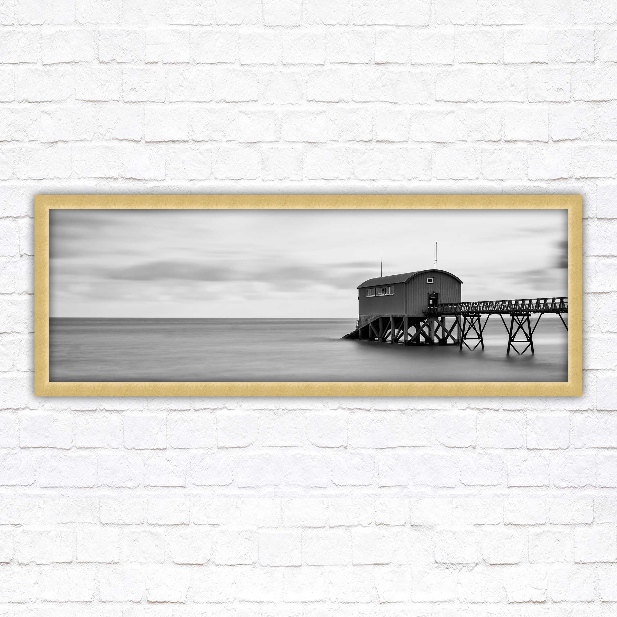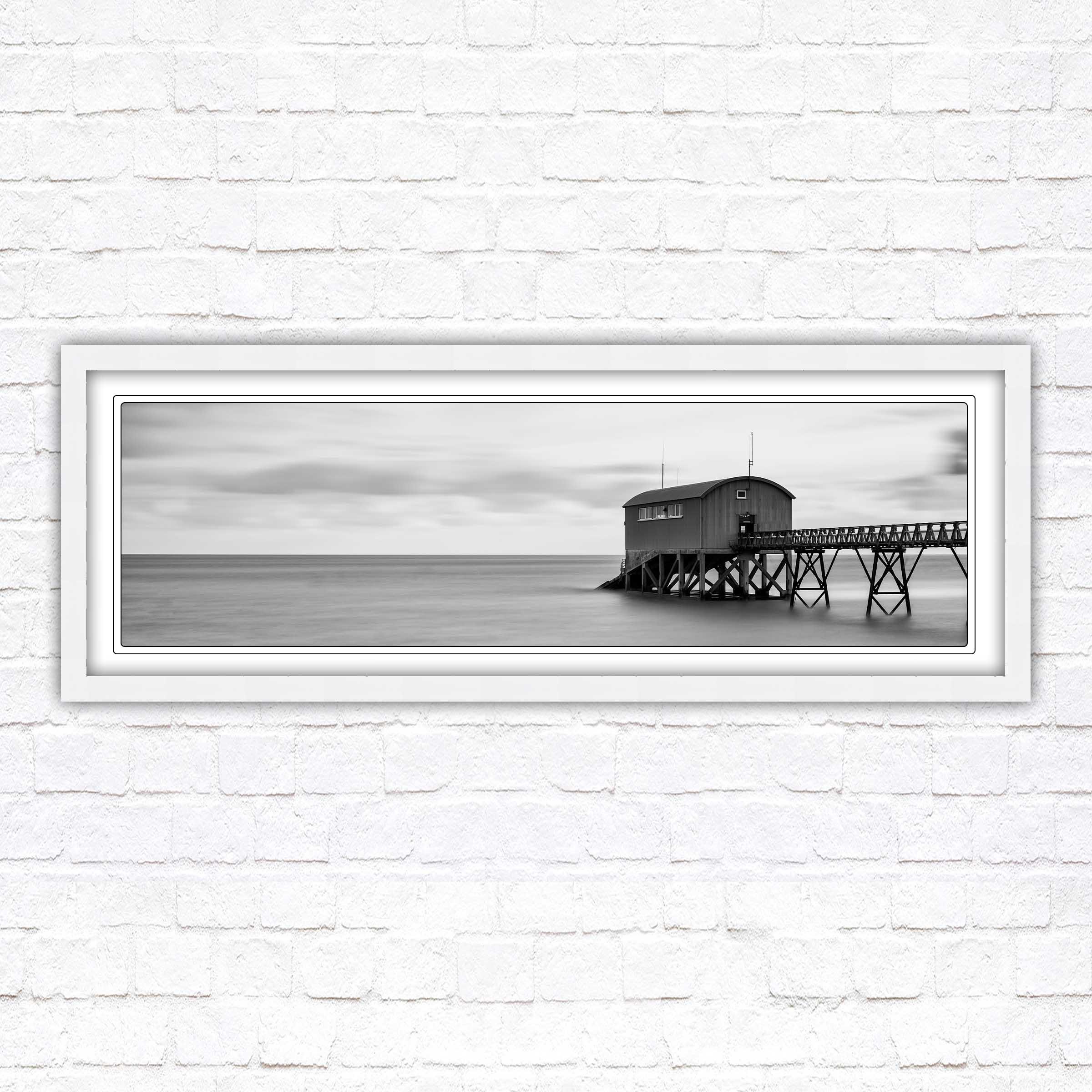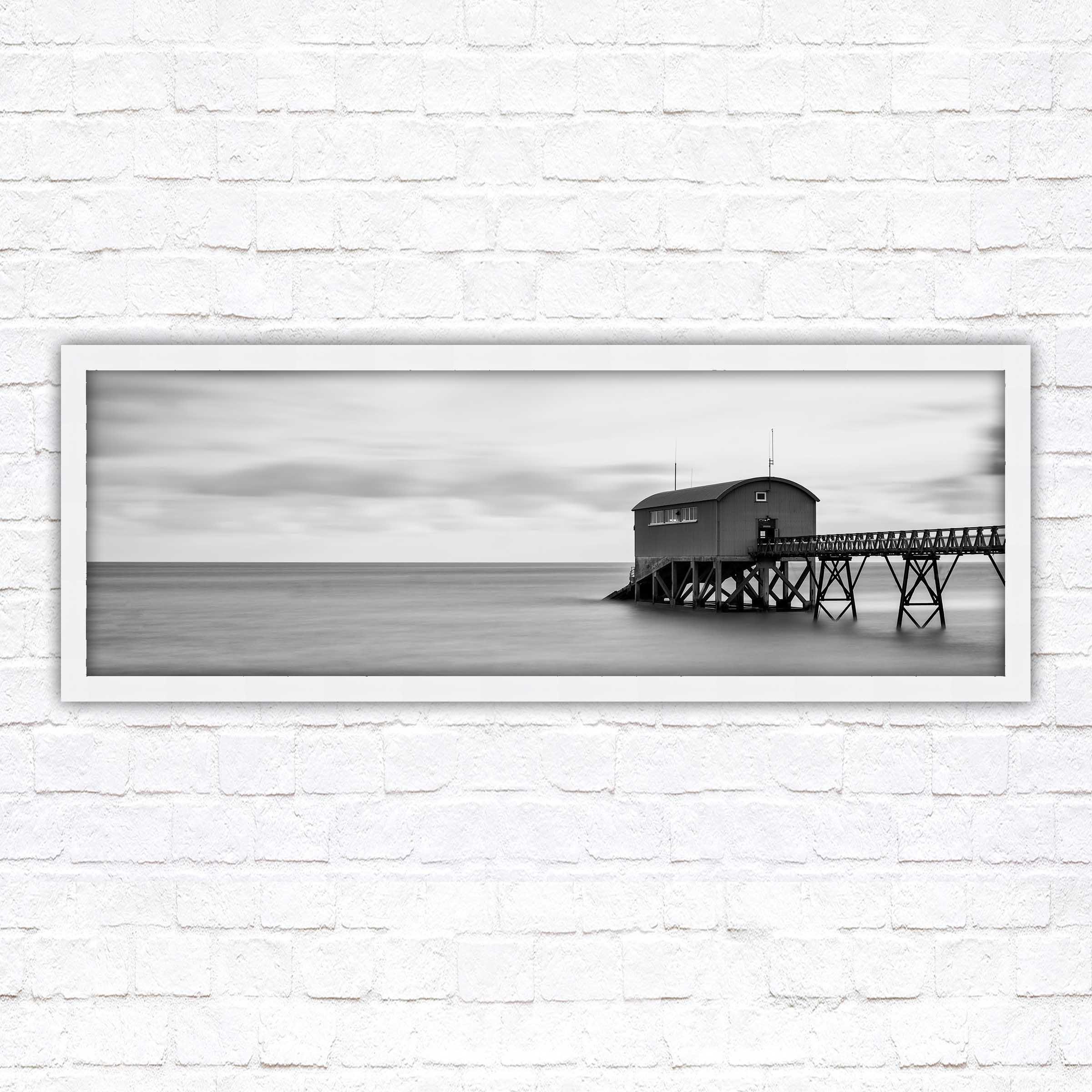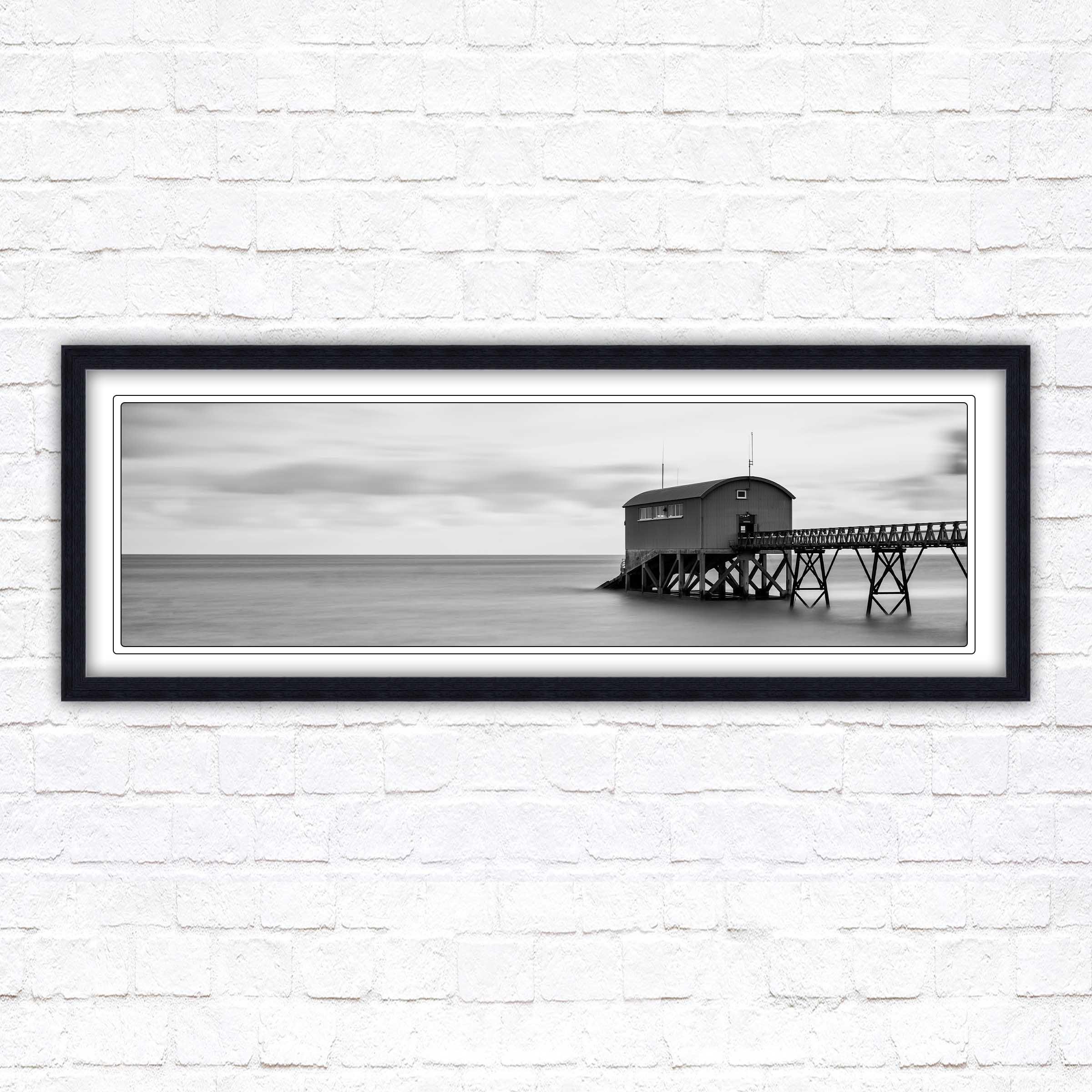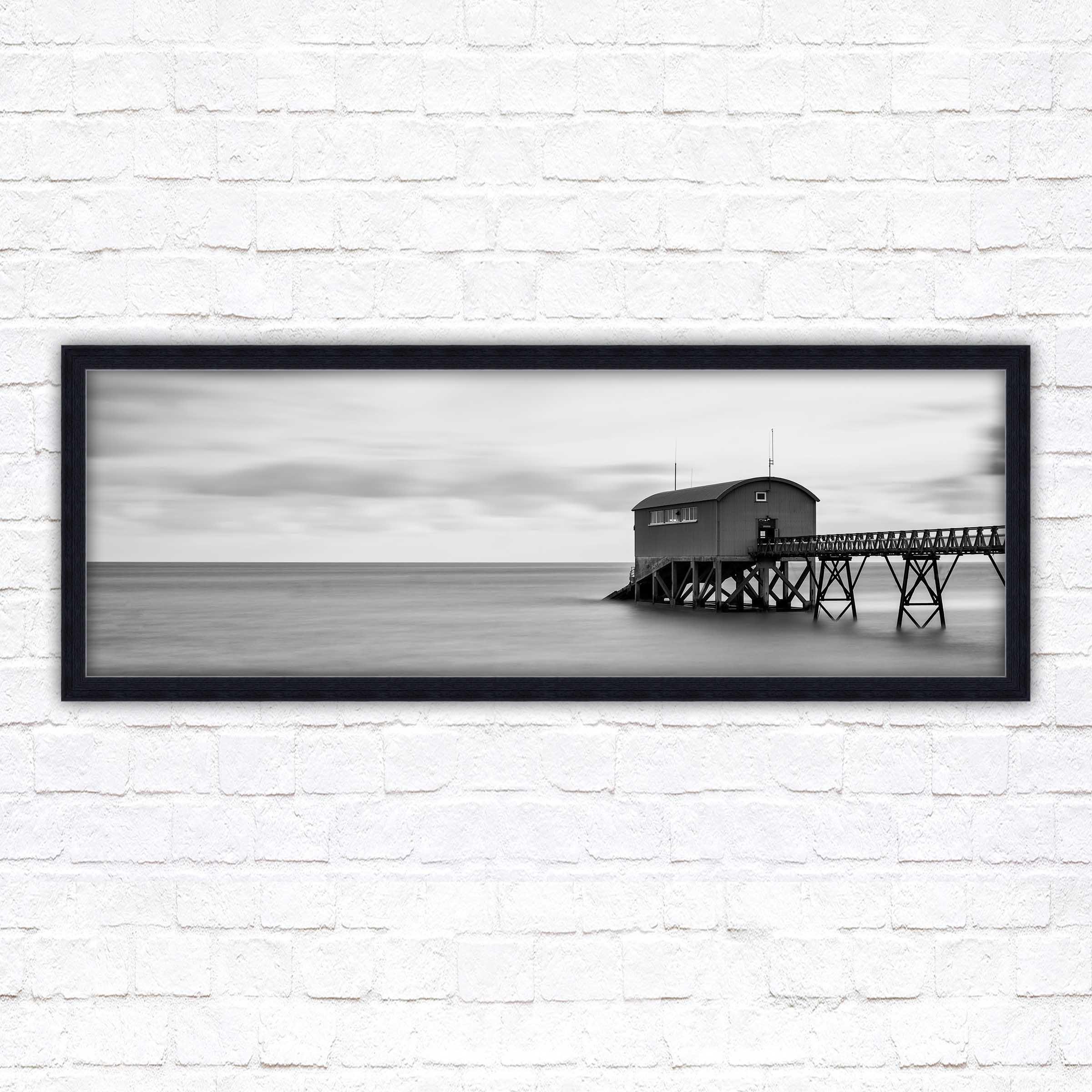 A beautiful black and white, panoramic, framed picture of Life boat station at sea. Calm tranquil waters creating a sense of peace looking into this picture. A choice of frames available.
