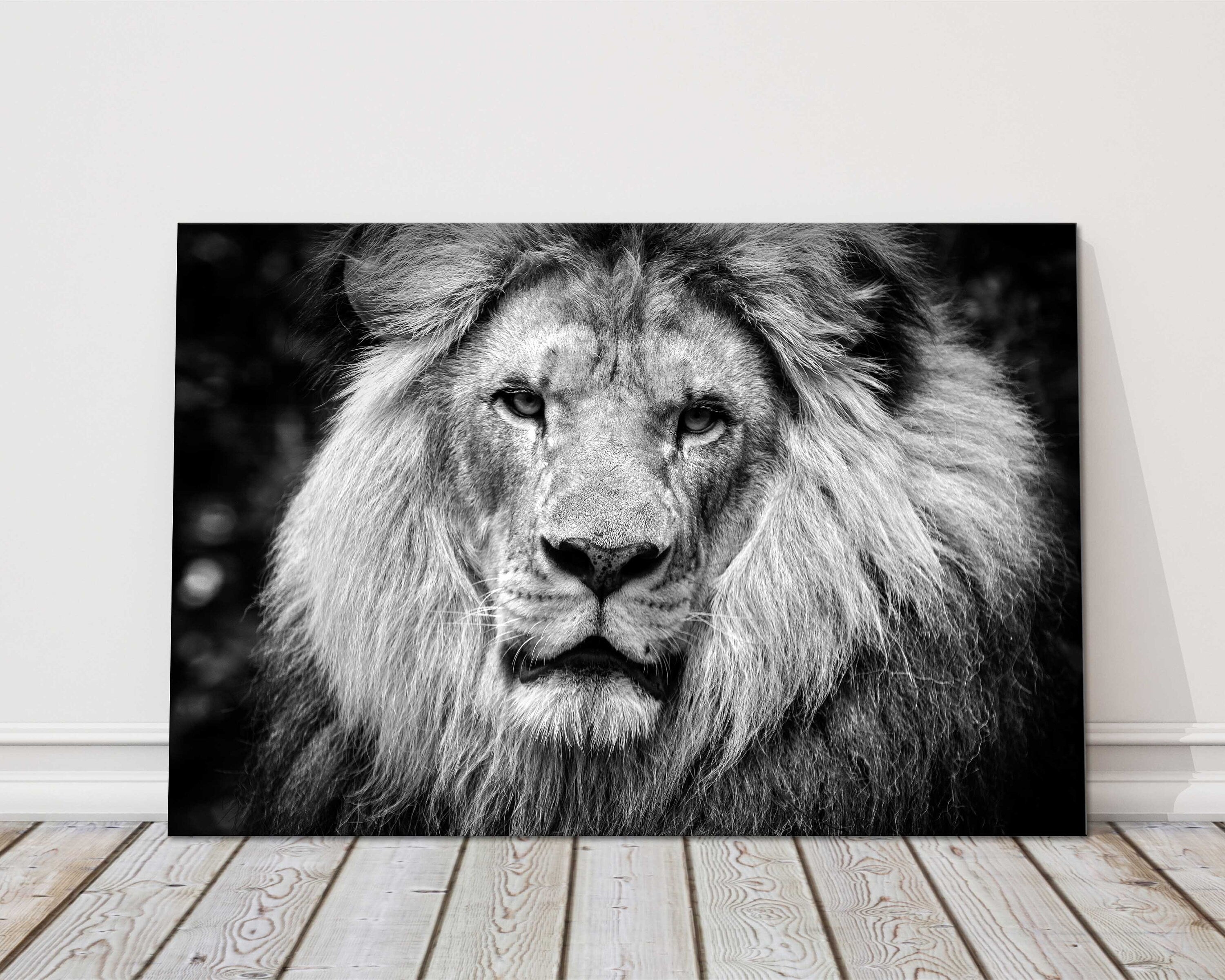 Striking portrait of an African lion face, in black and white. Printed and finished as a canvas picture. Choice of sizes available. Ideal gift/present.