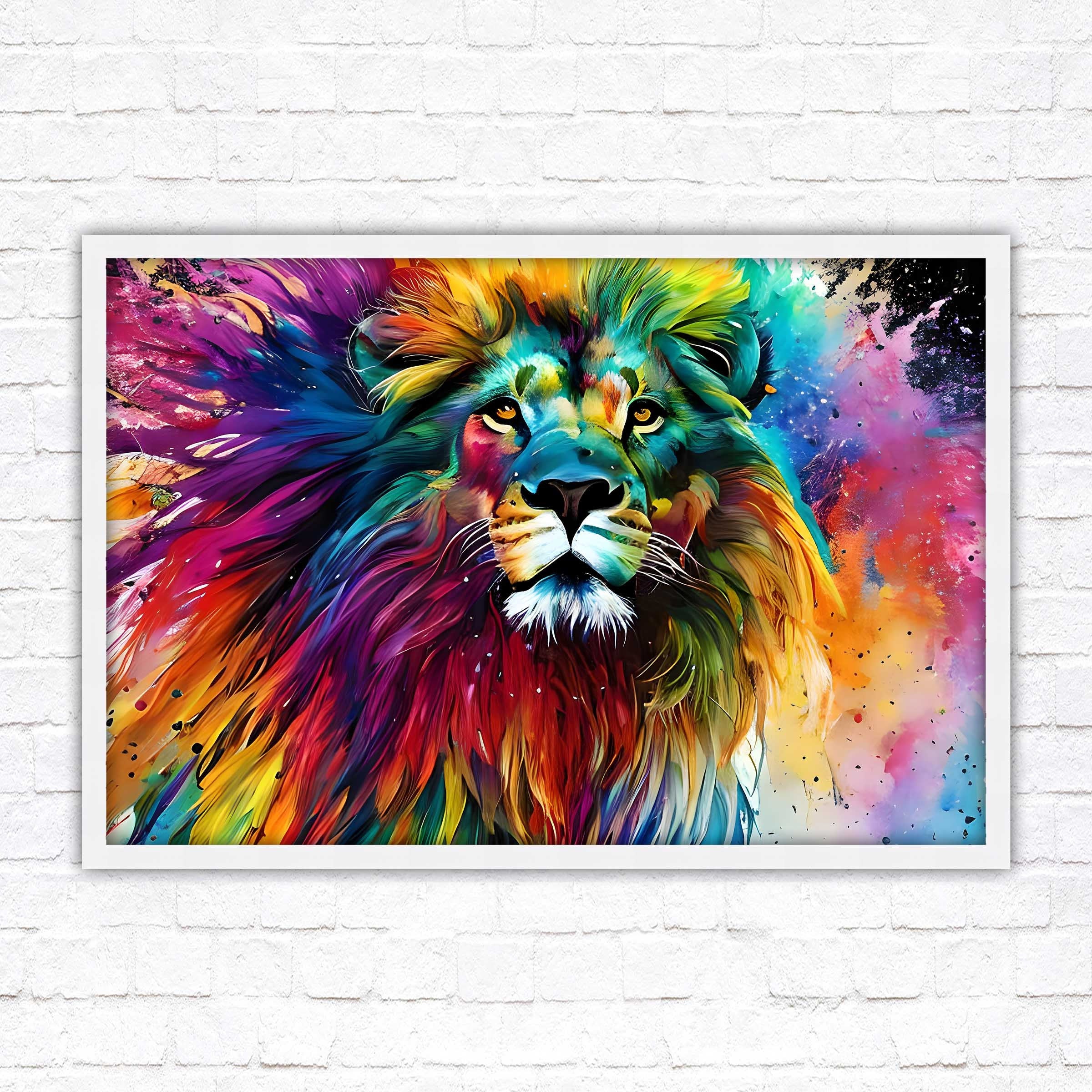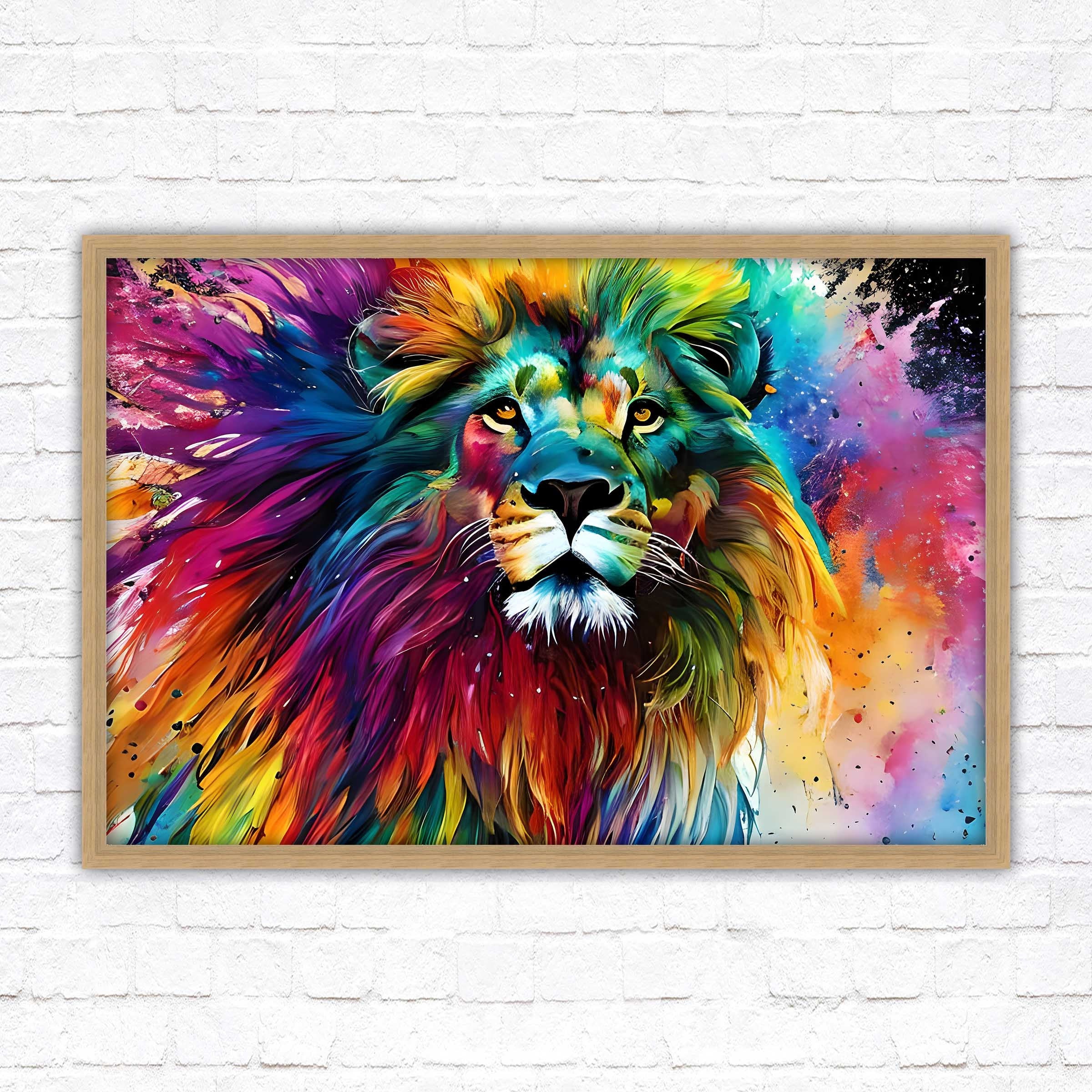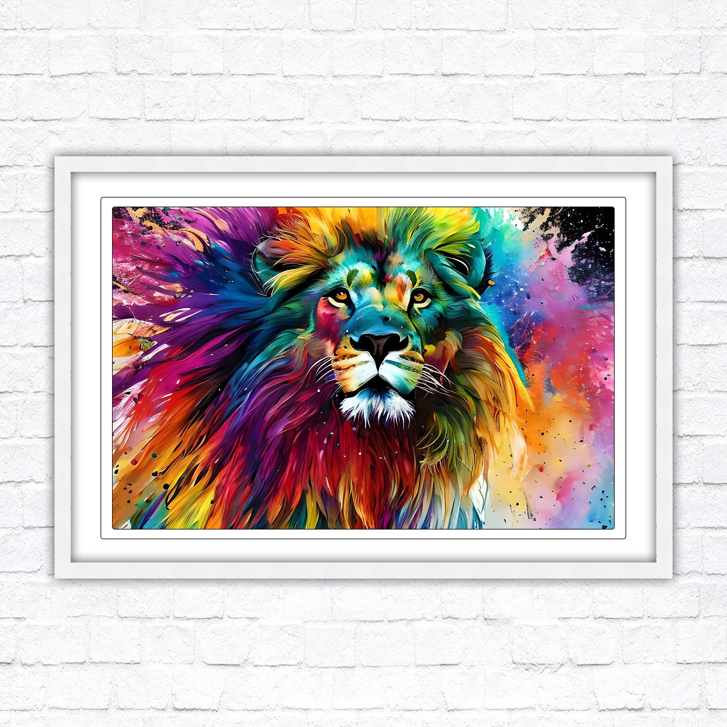 Lion in multicolour. Bright colourful wall art. A choice of frame styles and borders.