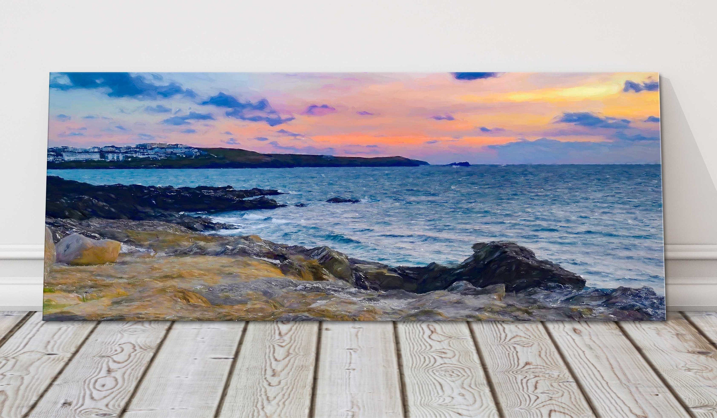 A beautiful panoramic sunset painting of Little Fistral beach Newquay. Famous surfing beach in Newquay, Cornwall. Printed and framed as a canvas print, available in a choice of sizes.