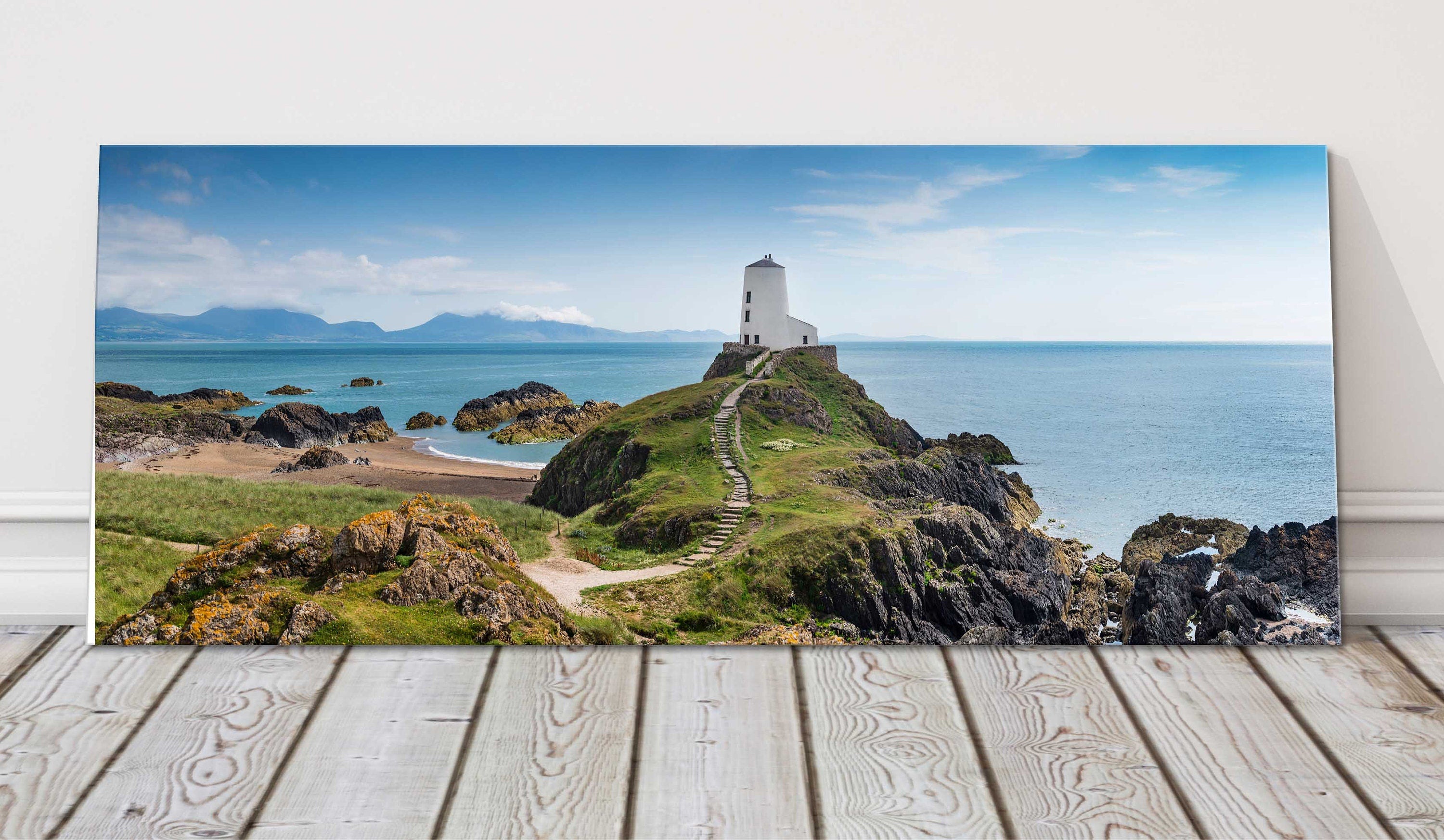 A beautiful panoramic picture of Llanddwyn Island, Anglesey, North Wales. Stunning picture of lighthouse and coastal scenery. Printed and framed as a canvas print. Available to order in a choice of sizes.