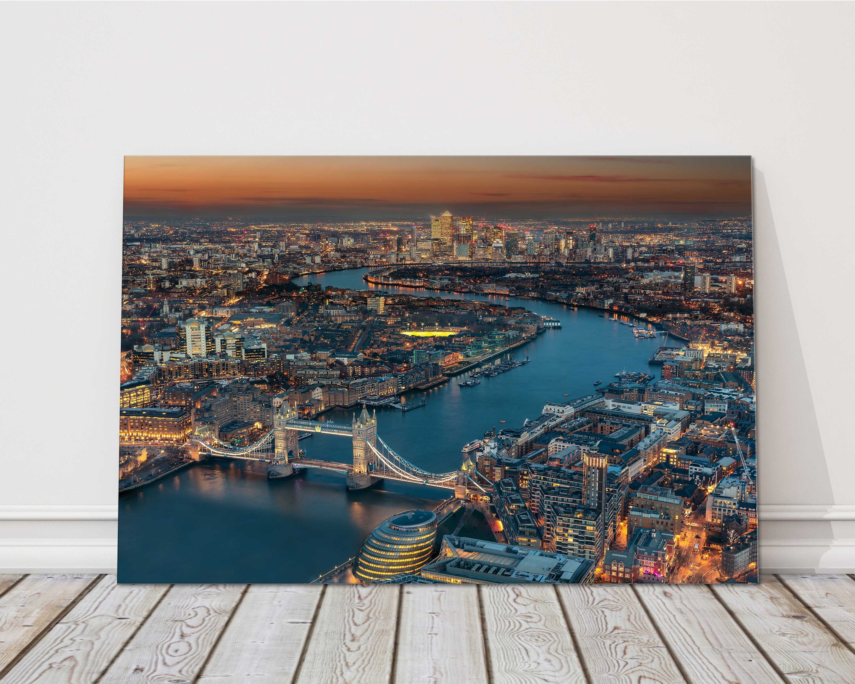 Aerial view of London along the River Thames during evening time.
