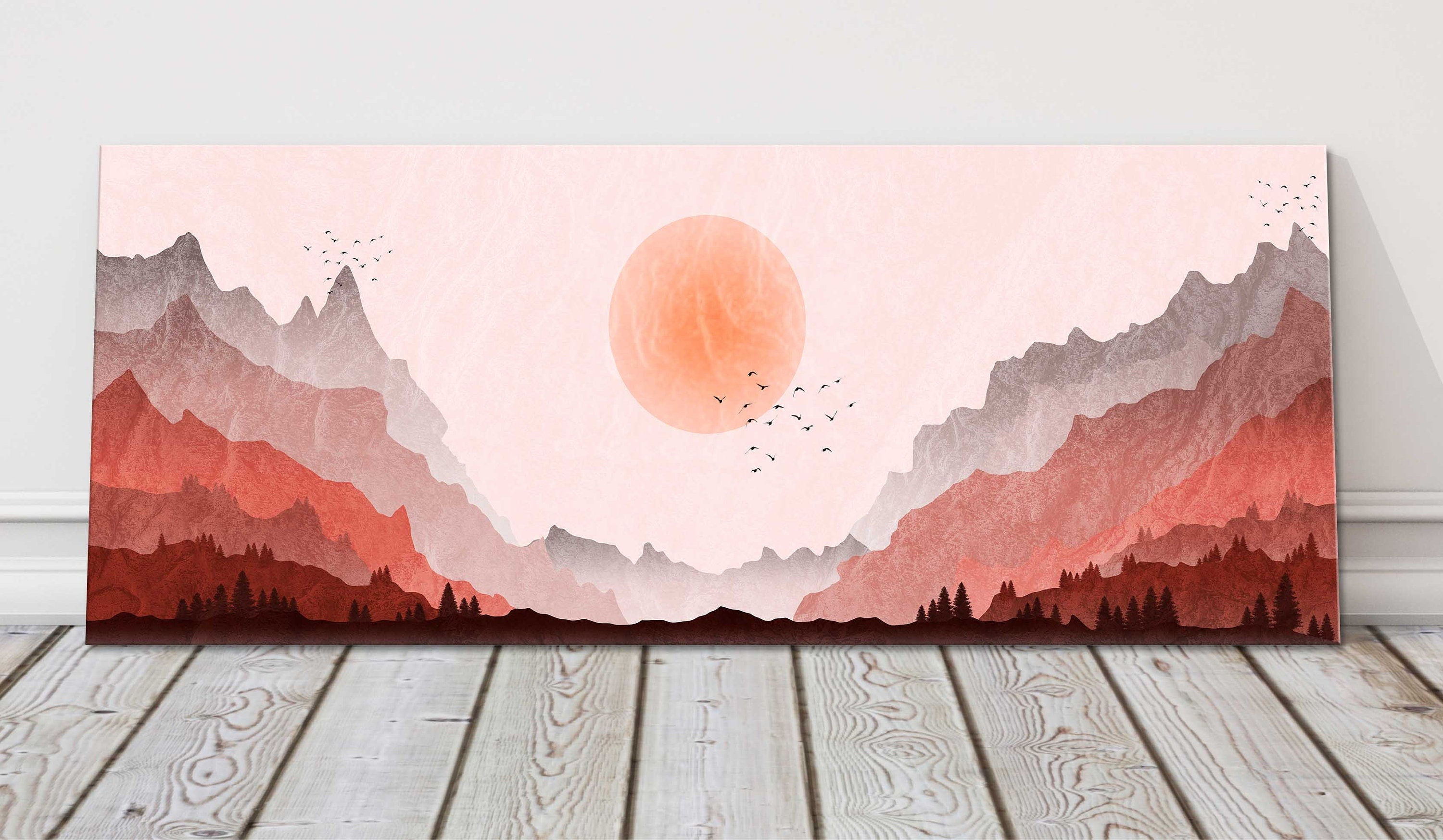 Illustration of a mountain landscape with the moon setting over the valley. Panoramic canvas picture print.