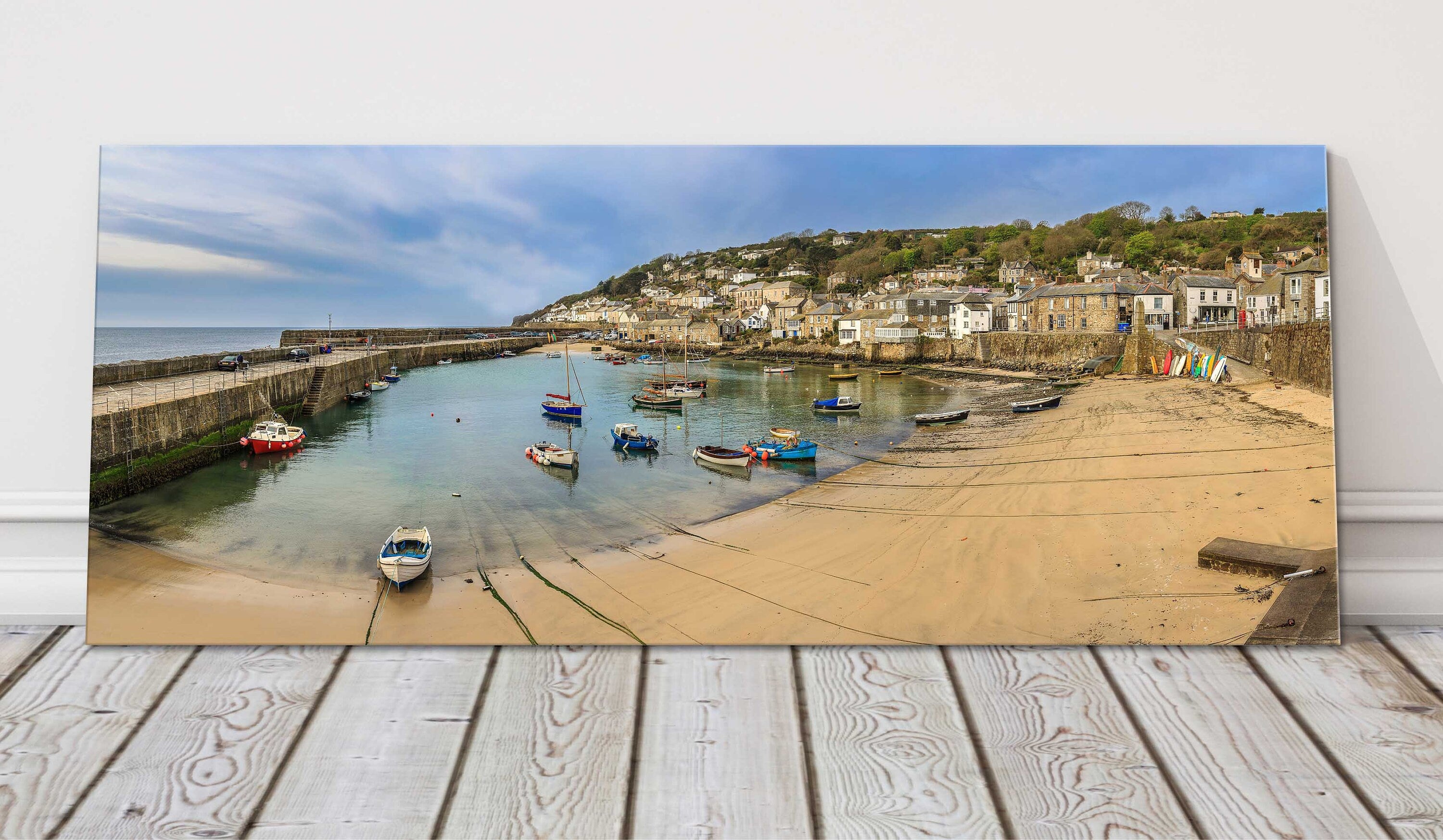 Boats moored at historic Mousehole Harbour. Cornwall seascape. Beautiful panoramic scene, printed on canvas, ideal image for home or office.