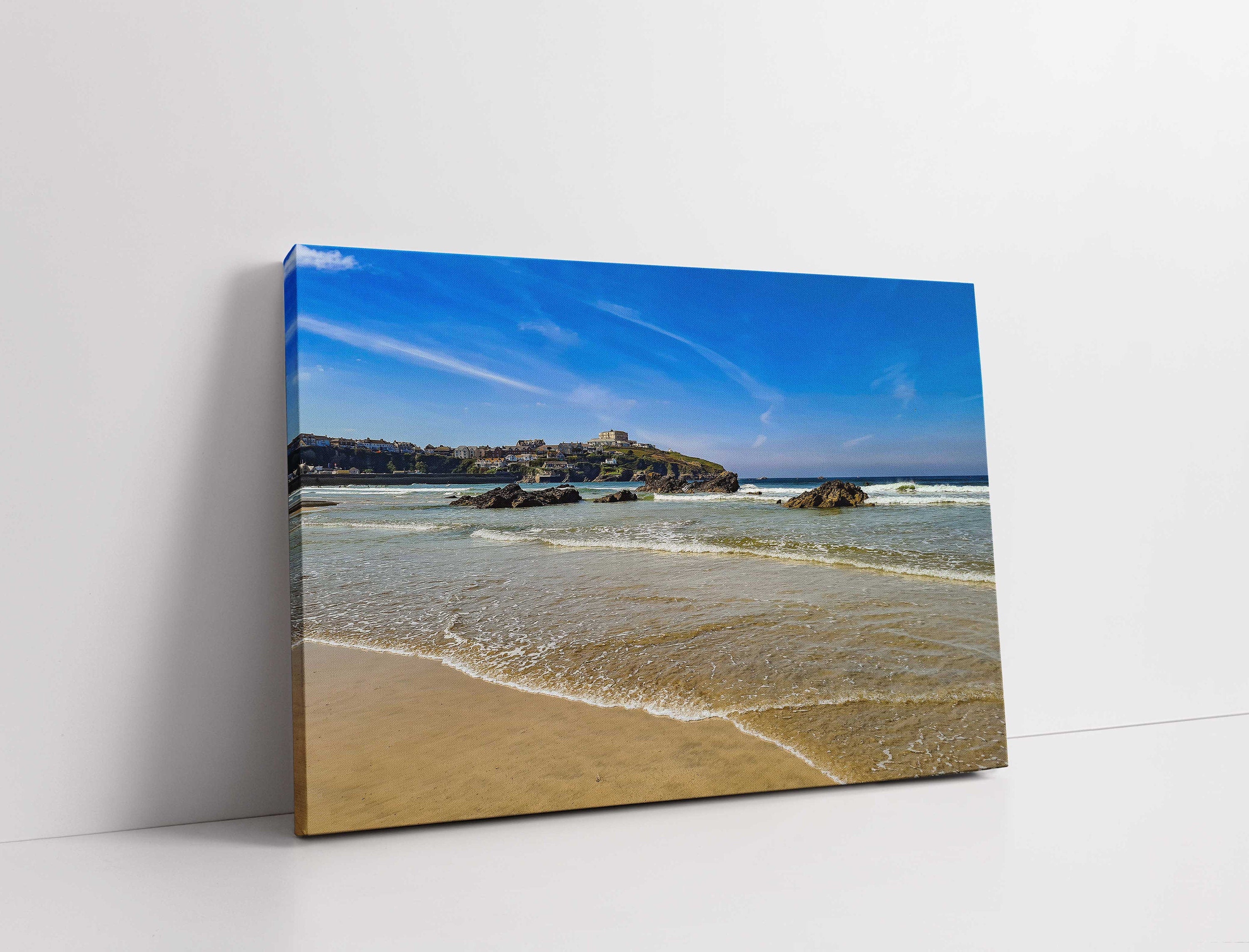A beautiful landscape canvas picture of Newquay Bay, featuring the Harbour and the Atalantic hotel on the headland. North Cornwall. Available to order in a choice of sizes.