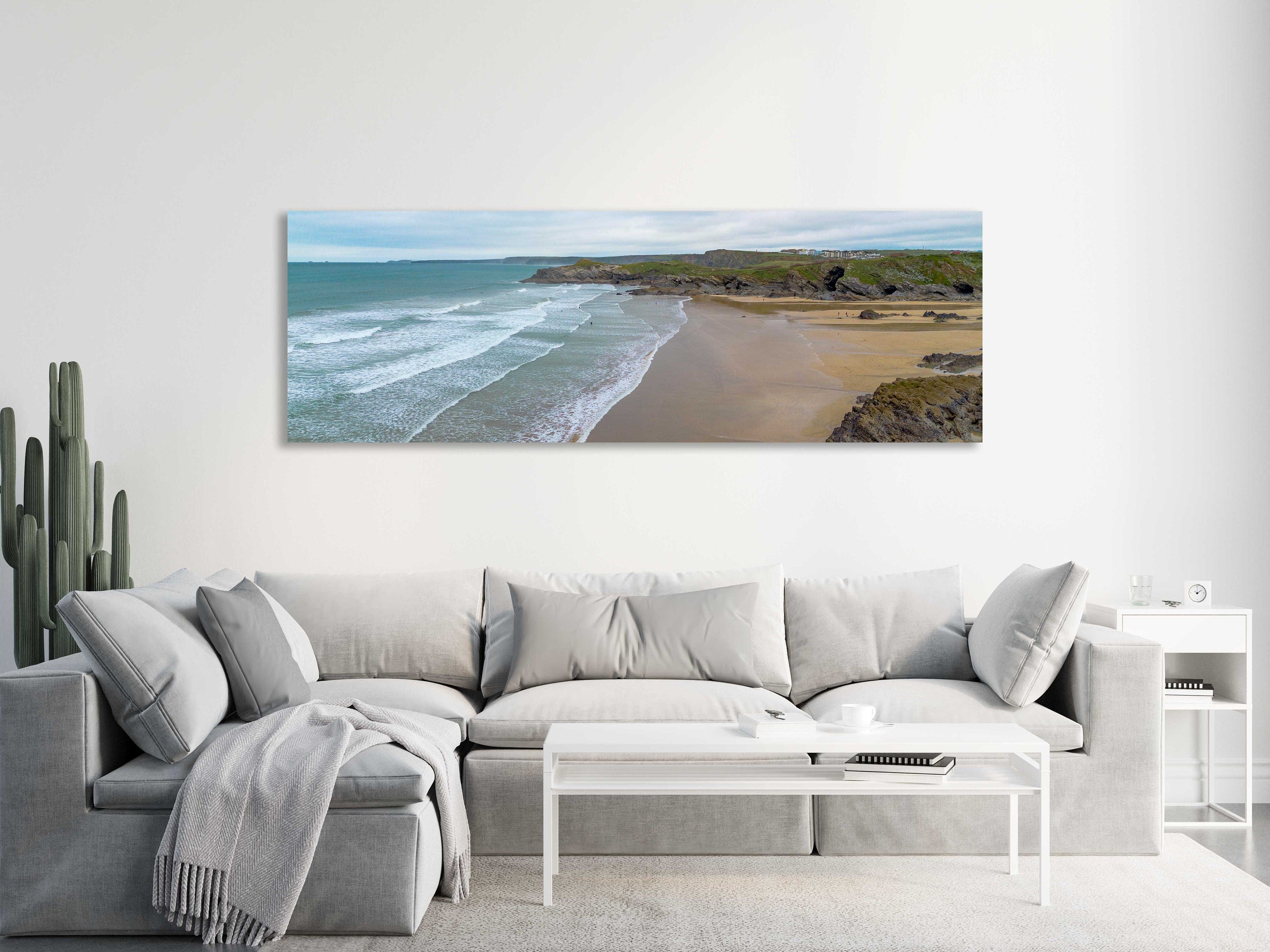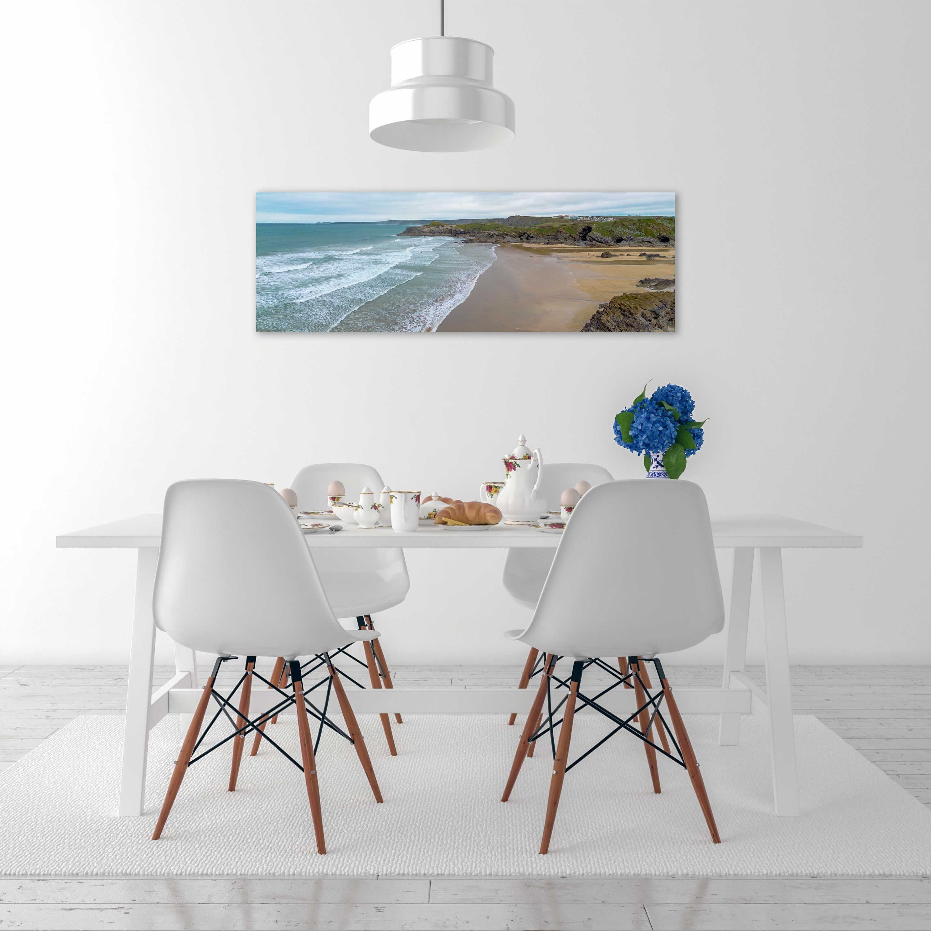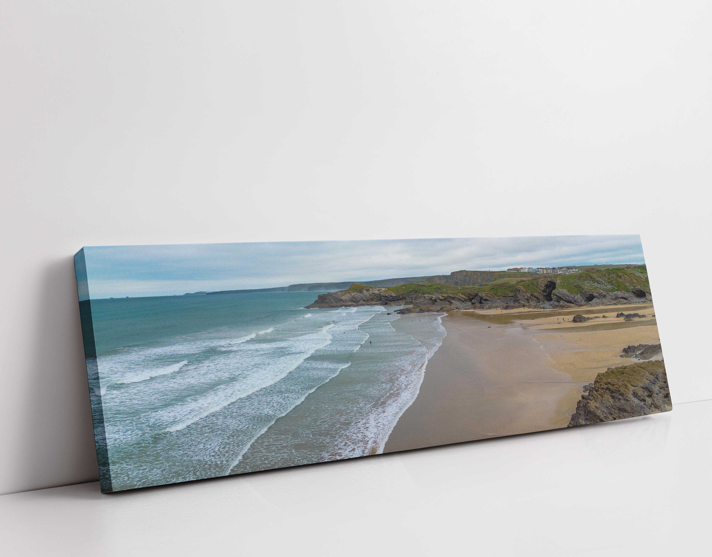 A beautiful panoramic picture of Newquay coastline, Cornwall. Beautiful colours of the Cornish coastline. Printed and framed as a canvas print, available in a choice of sizes. Wall gift.