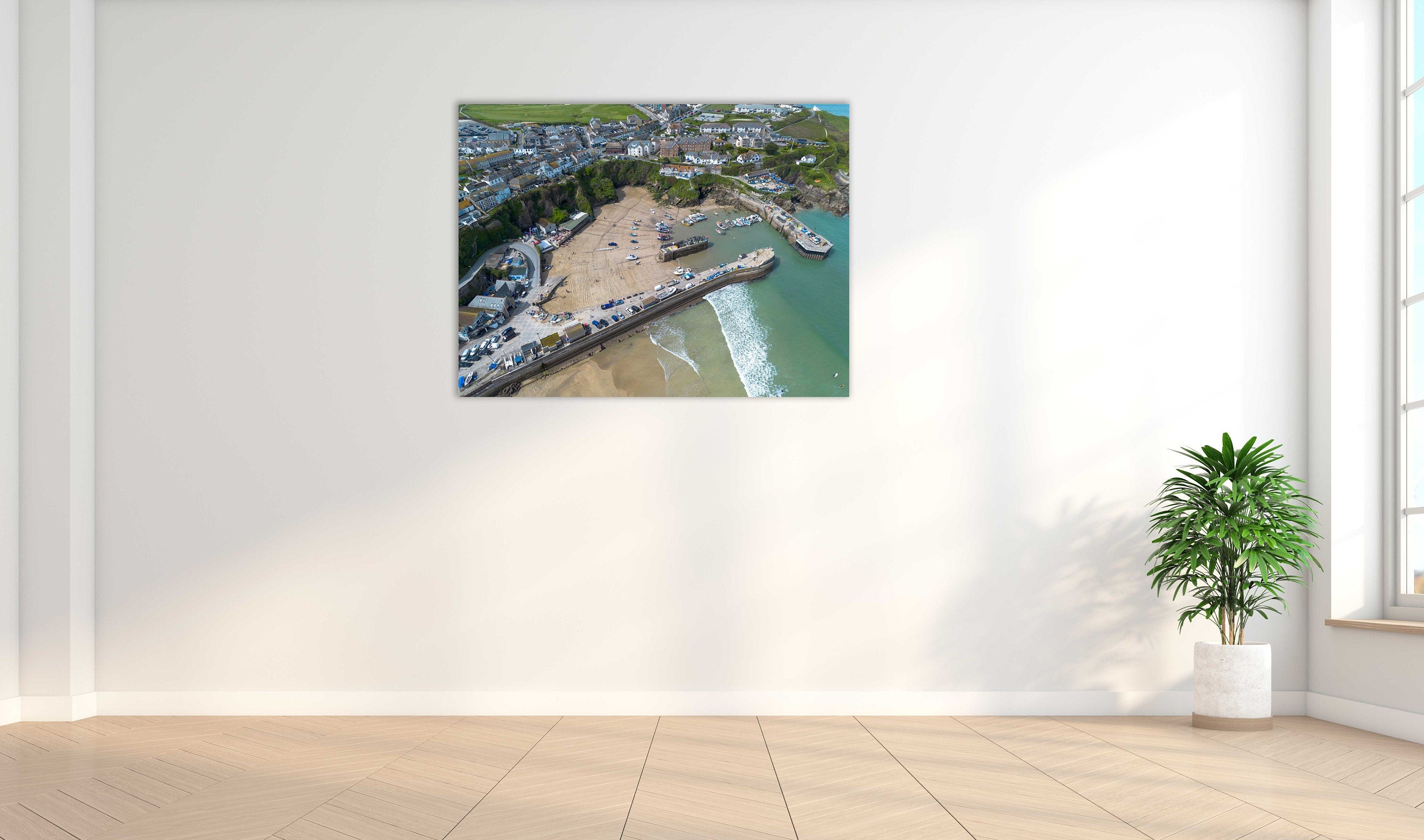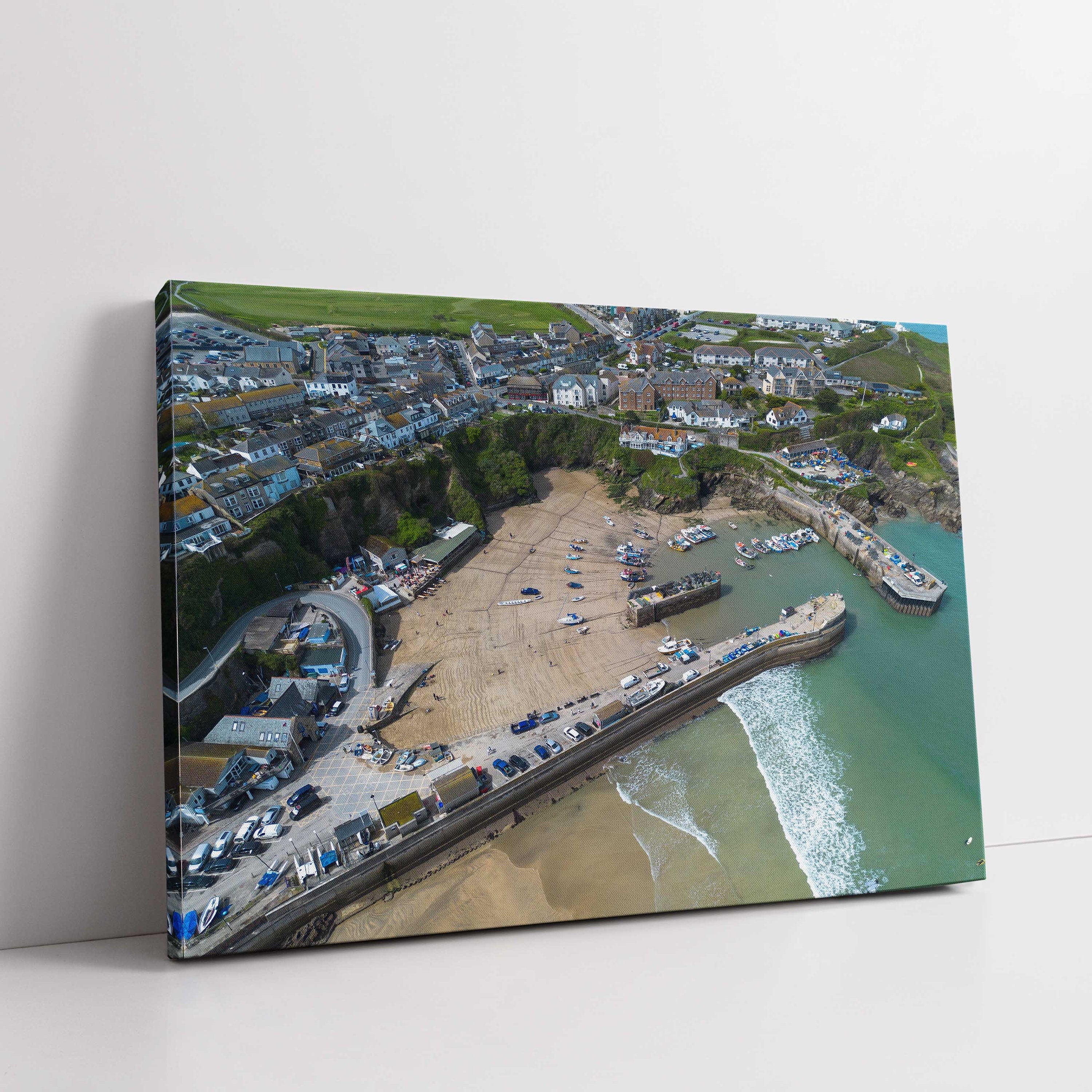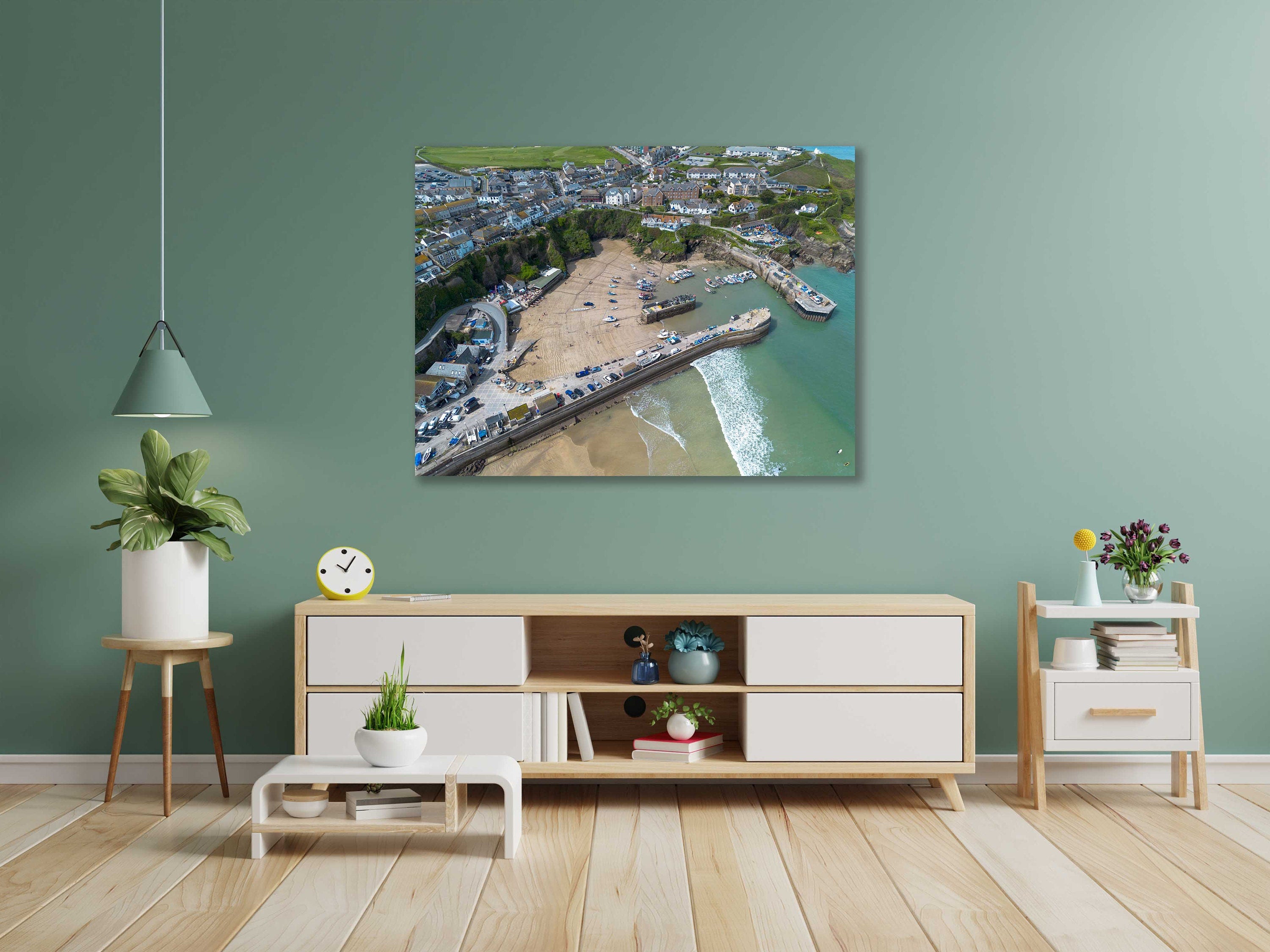 Newquay fishing Harbour and coastline, Cornwall. Aerial view of harbour and headland. Printed and framed as a canvas print. Variety... Read more