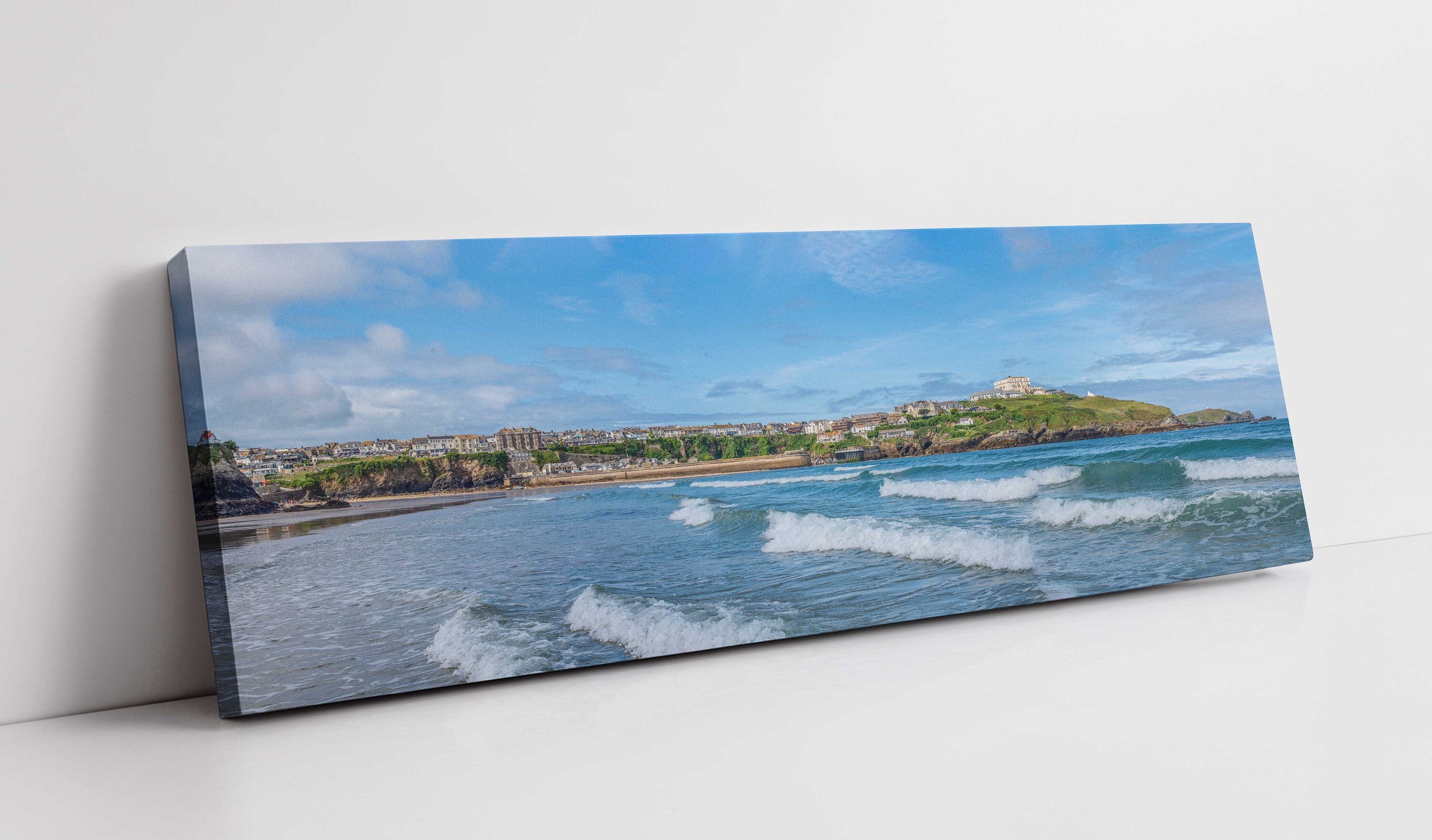 A beautiful panoramic picture of Newquay Harbour and Headland, Cornwall. Beautiful colours of the Cornish coastline. Printed and framed as a canvas print, available in a choice of sizes.