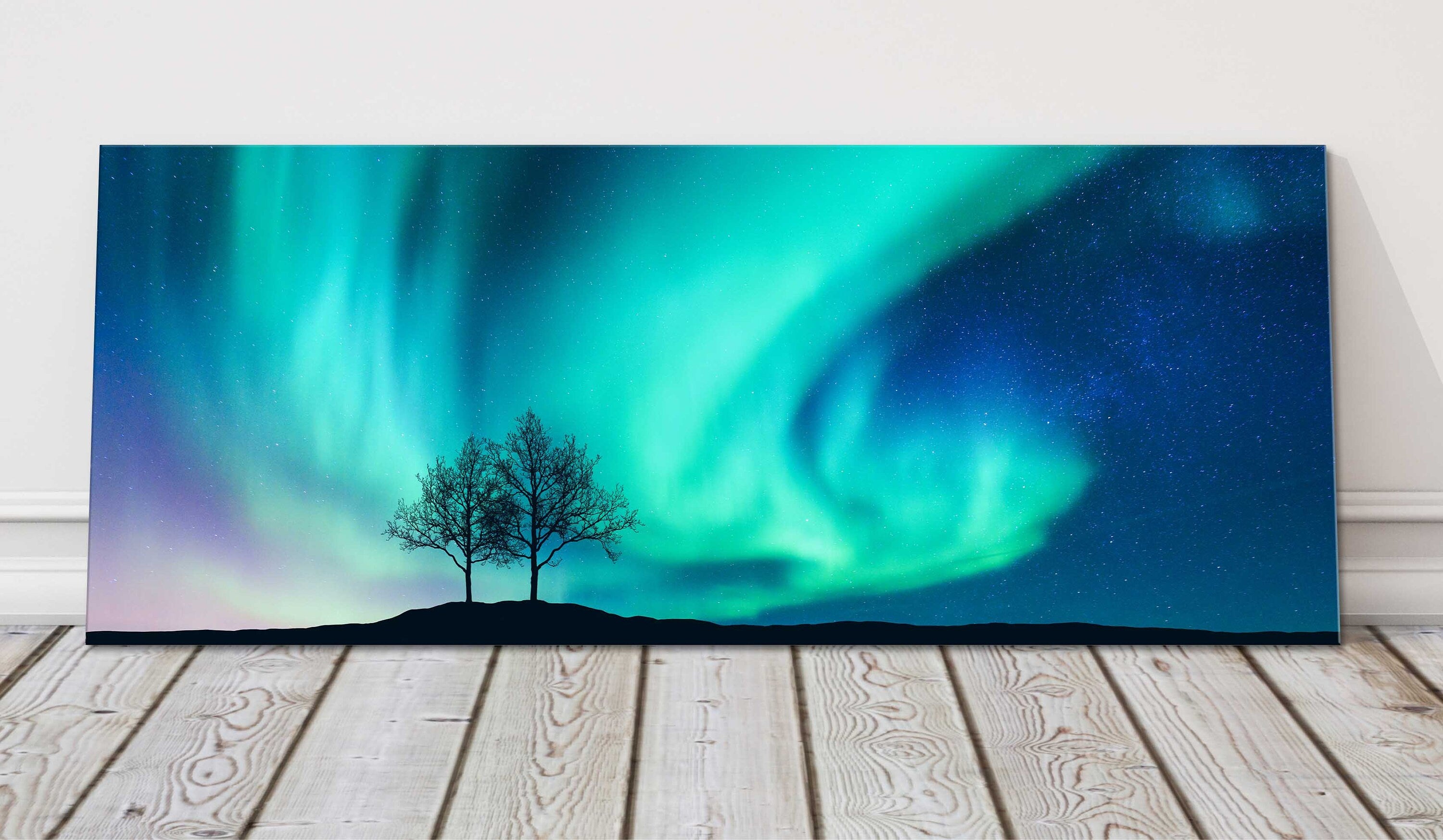 Aurora Borealis and the silhouette of trees on the hill. Panoramic canvas picture print. Beautiful landscape picture of the Northern Lights.