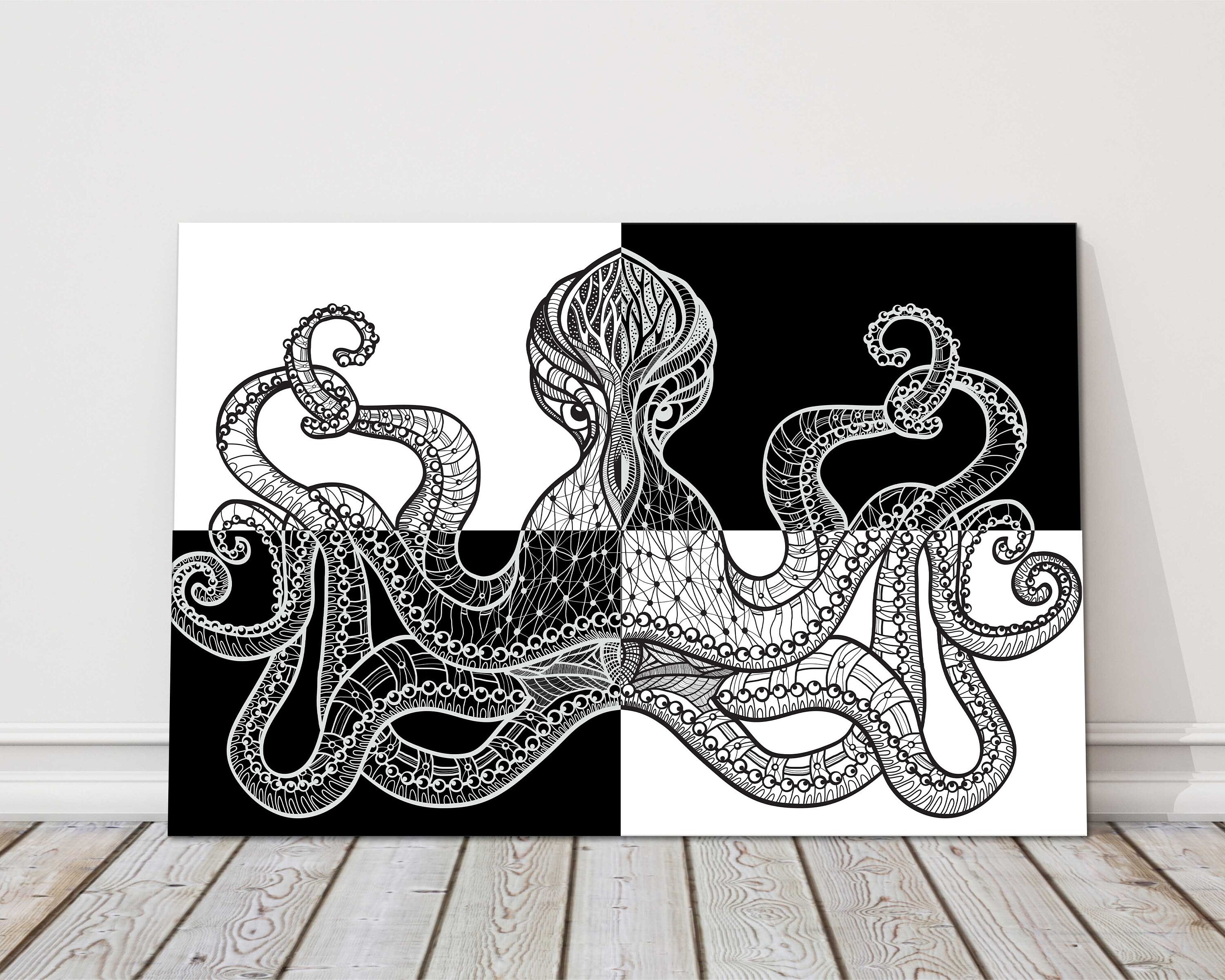 Octopus in black and white symmetrical pattern form. Canvas picture print.