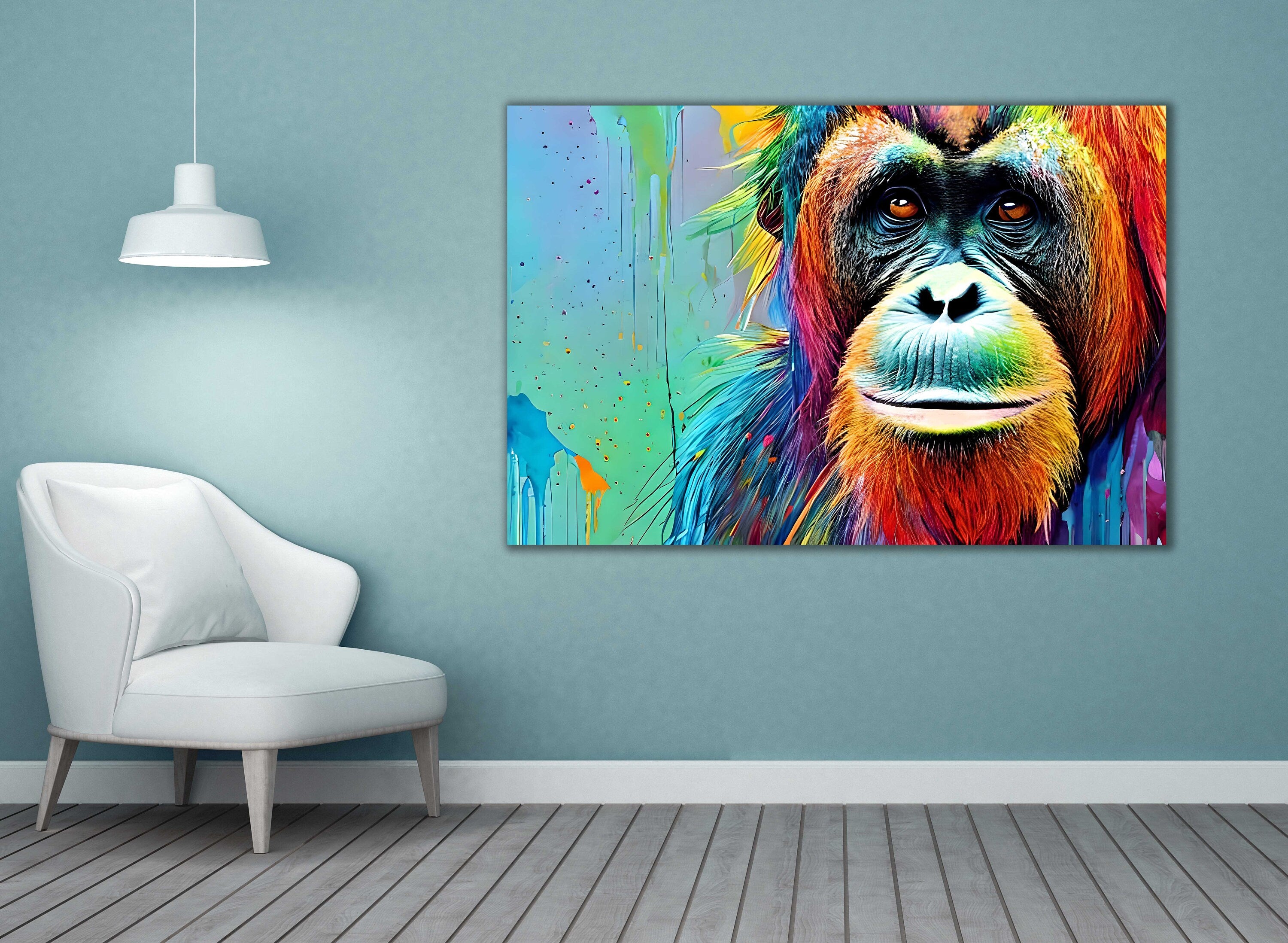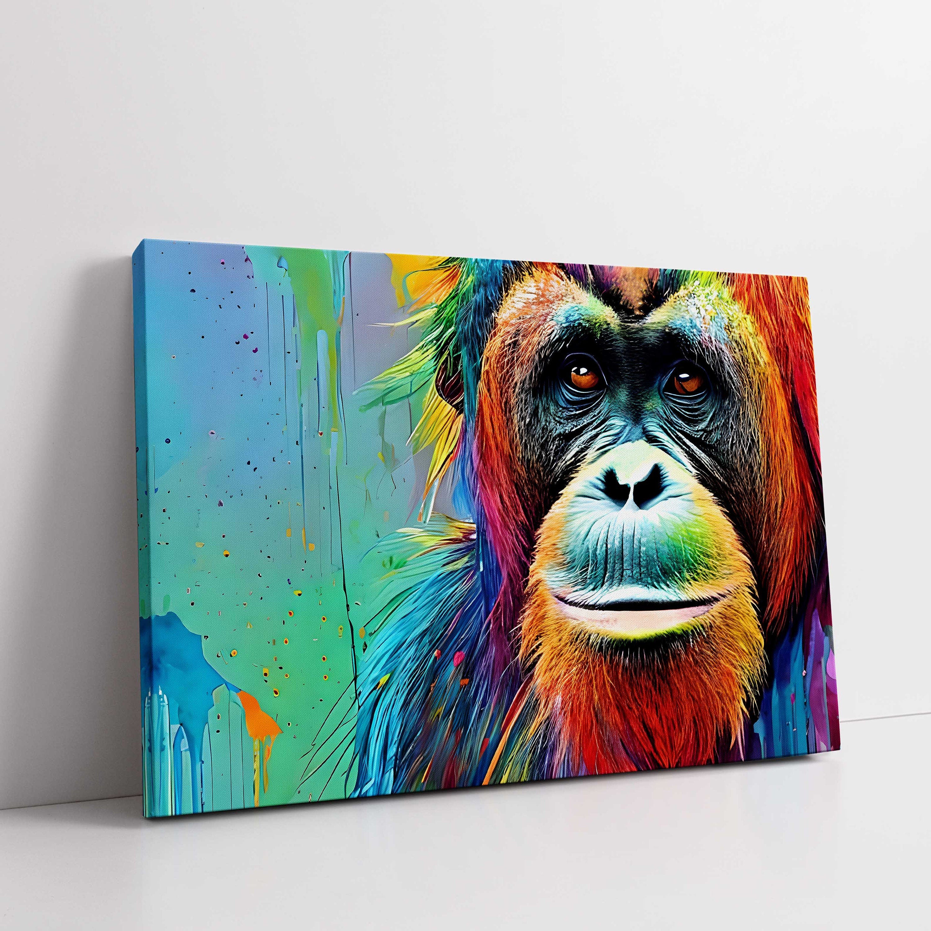 Orangutan, Close up. Wildlife image multi-coloured graffiti style. Printed and framed as a canvas picture print. A choice of sizes available to order.