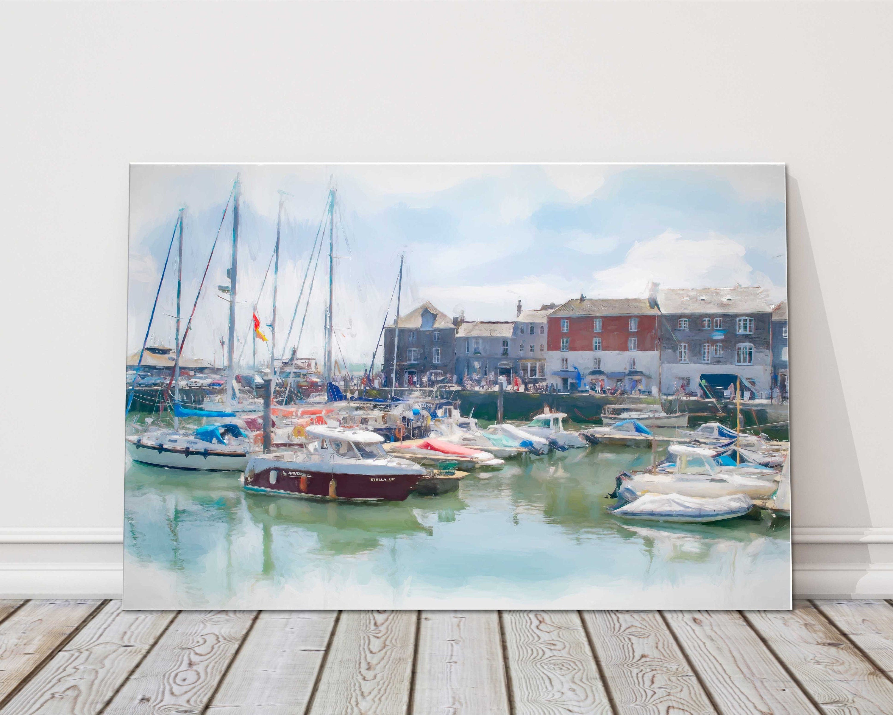 Padstow harbour painting. Boats moored in the harbour. Canvas picture print