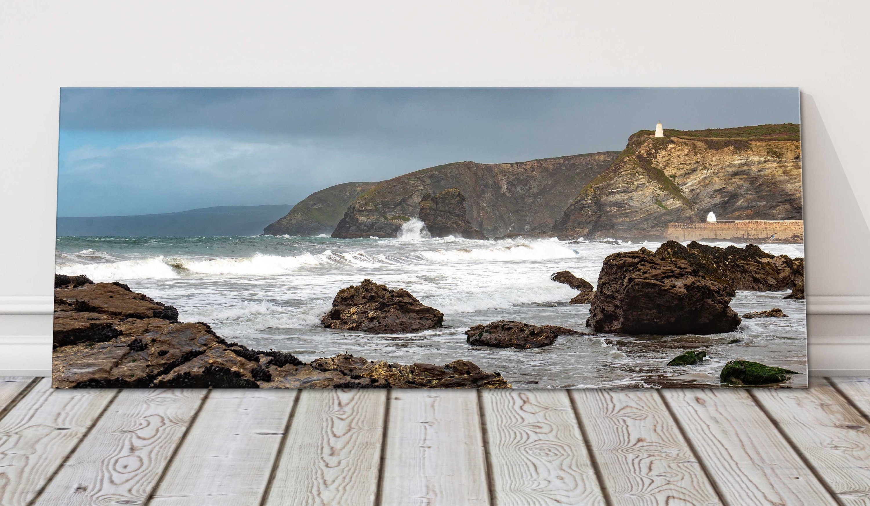 Panoramic view from Portreath Harbour, Waves crashing on the rocks. Printed on to a canvas picture.