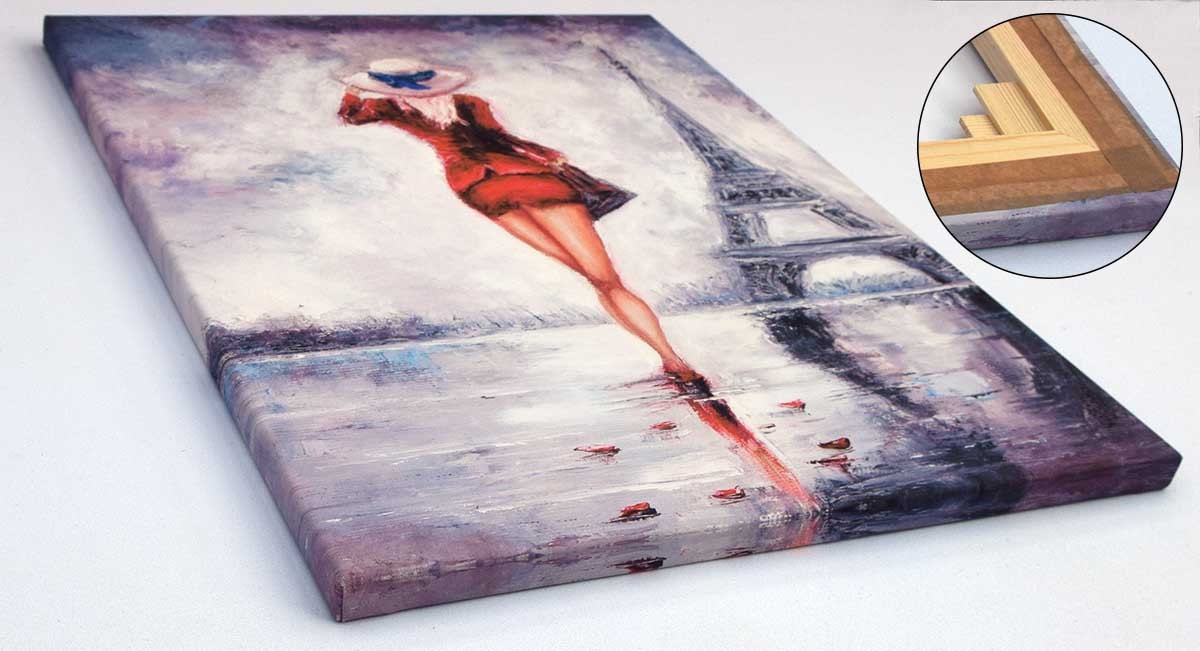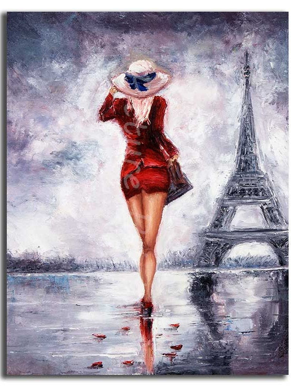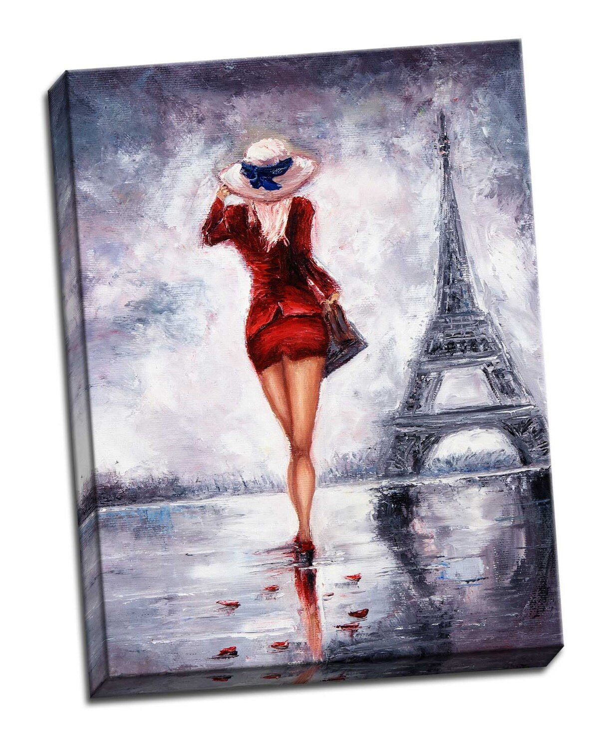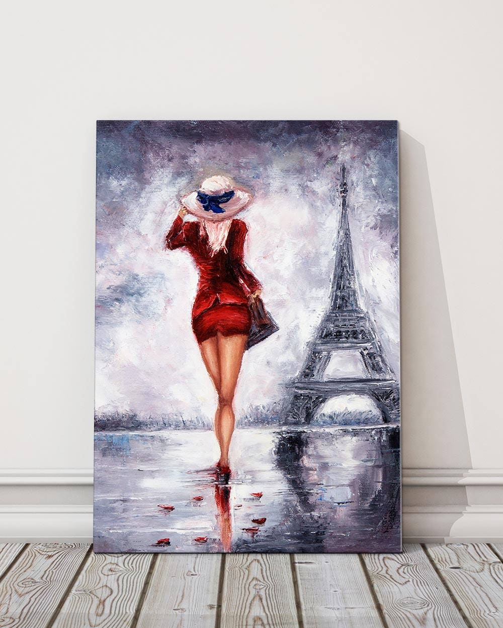 DESCRIPTION Woman walking in Paris. Bright red dress. Looking towards the Eiffel Tower. Printed and framed as a Canvas Print.... Read more