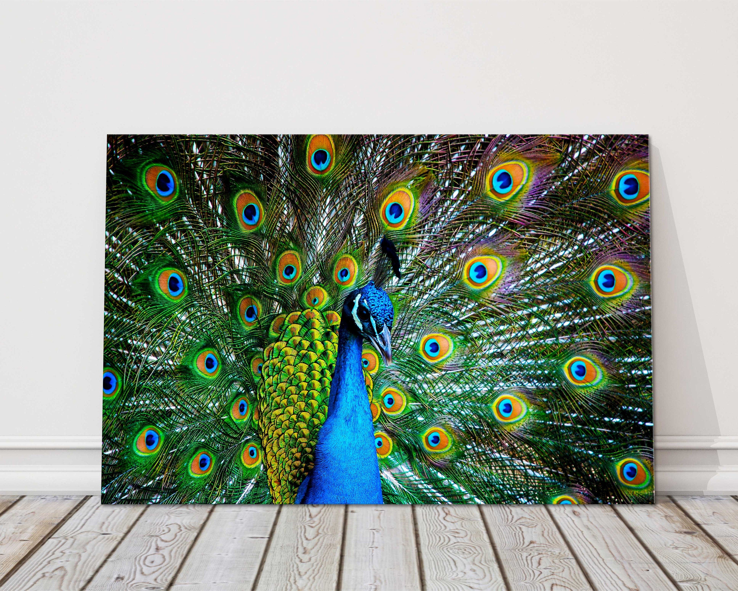 Peacock with plume of feathers, bright striking colours. Canvas picture printed and framed as a canvas print. Home decor. Gift... Read more
