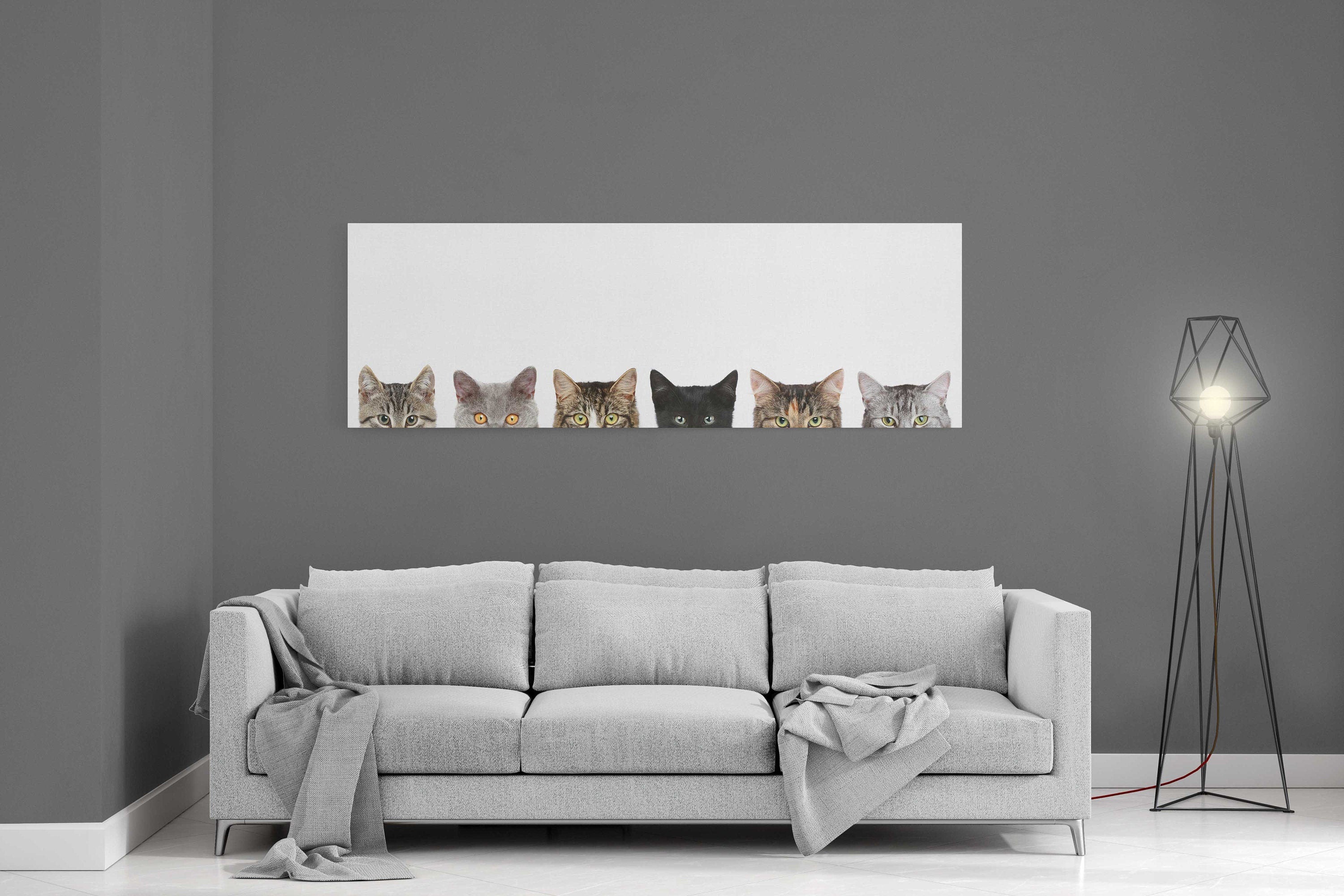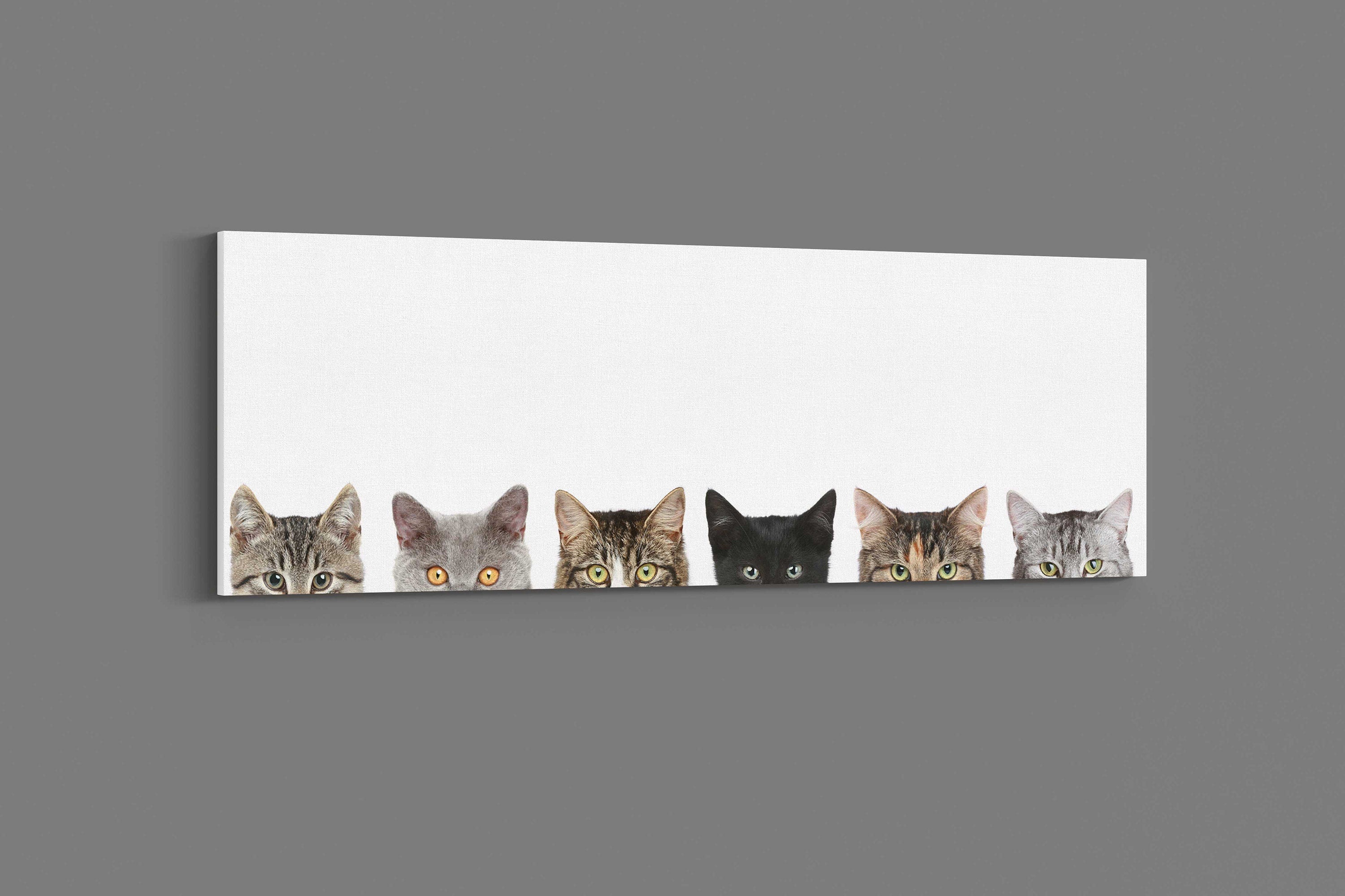 A funny panoramic picture of peeping kittens. Printed on a white background. Available in a choice of sizes to order.