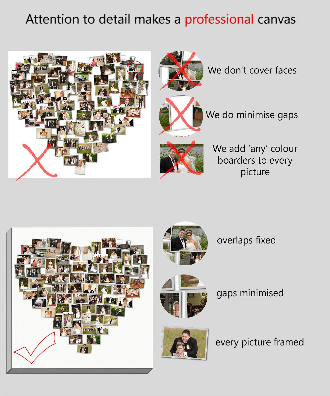 Printed on to a premium bright white canvasHandcrafted professional design with no gaps or covered facesFully adjustable canvas frames with corner wedgesChoice of border colourPrinted using professional gallery-quality Epson printersUnlimited design revisions for complete satisfactionFade-free pigment inks ensure long-lasting, vibrant resultsSimple and easy process for making changesStretched over the frame for a drum-tight finishScale preview shows individual picture sizes for accuracyBack of the canvas taped to protect walls from staplesAdd text to the front or sides of the canvas, in any locationChoose between two frame thicknesses: 18mm thin or 38mm deepOption to add a coloured background or a background image behind the heart