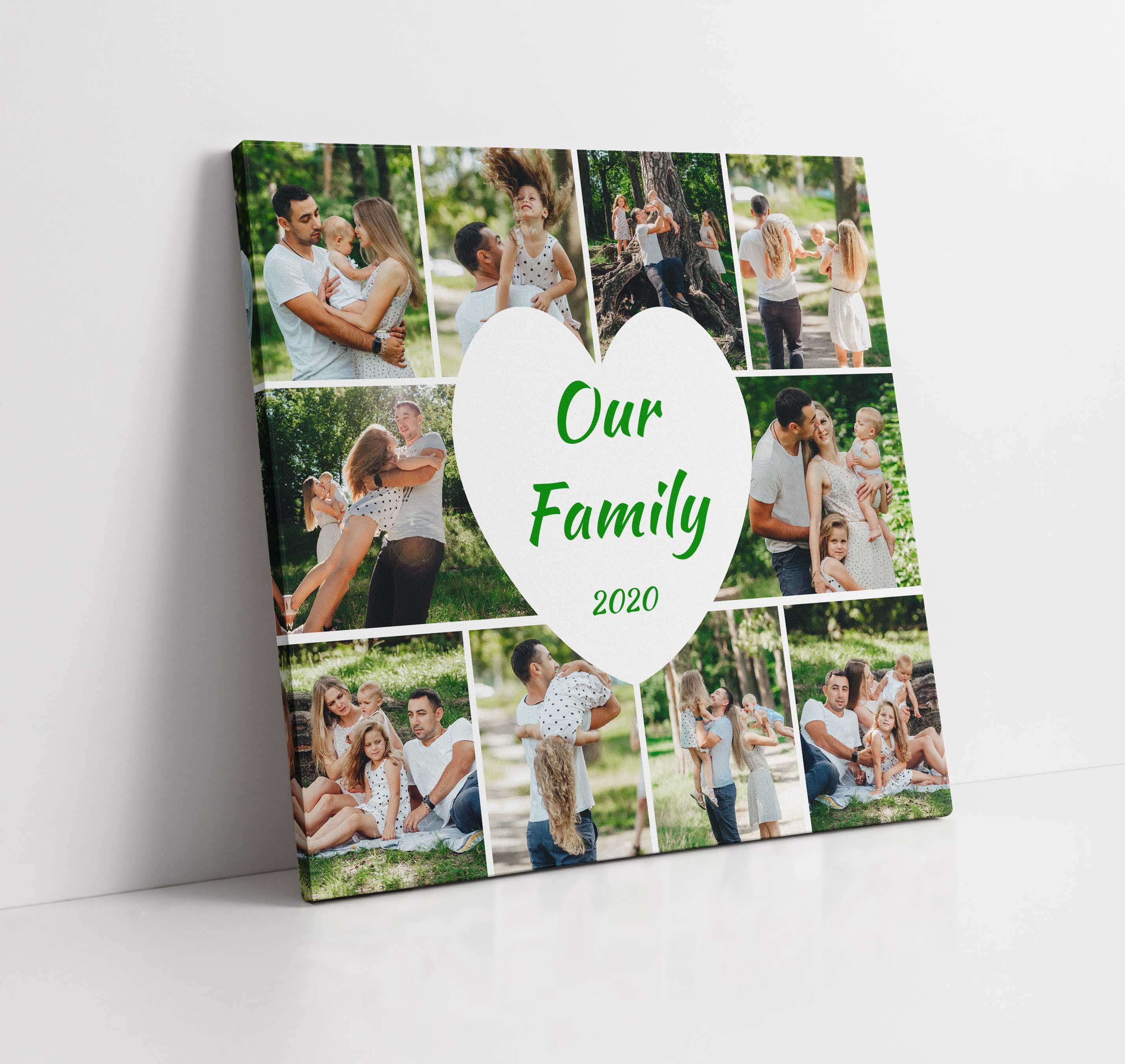 Photo collage designed by you. Using specialised online software, simply upload your pictures into the design, and arrange them to your liking. Pictures can be repositioned and swapped if necessary. Add your own choice of text with a choice of fonts and colours.