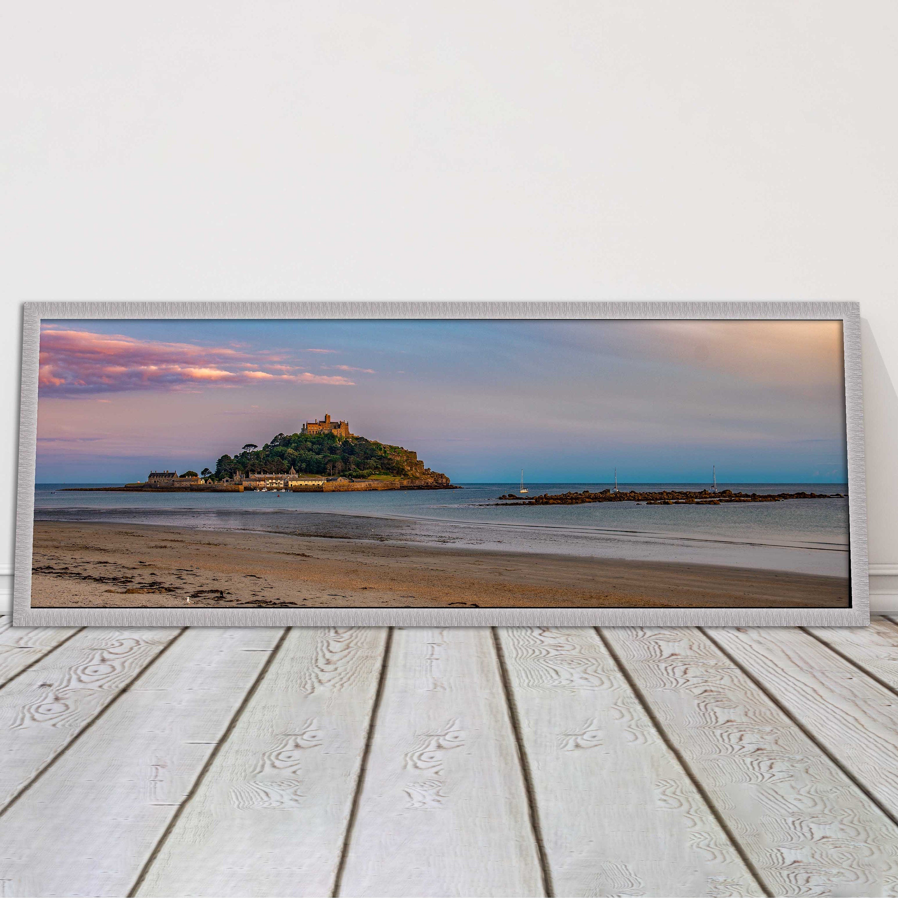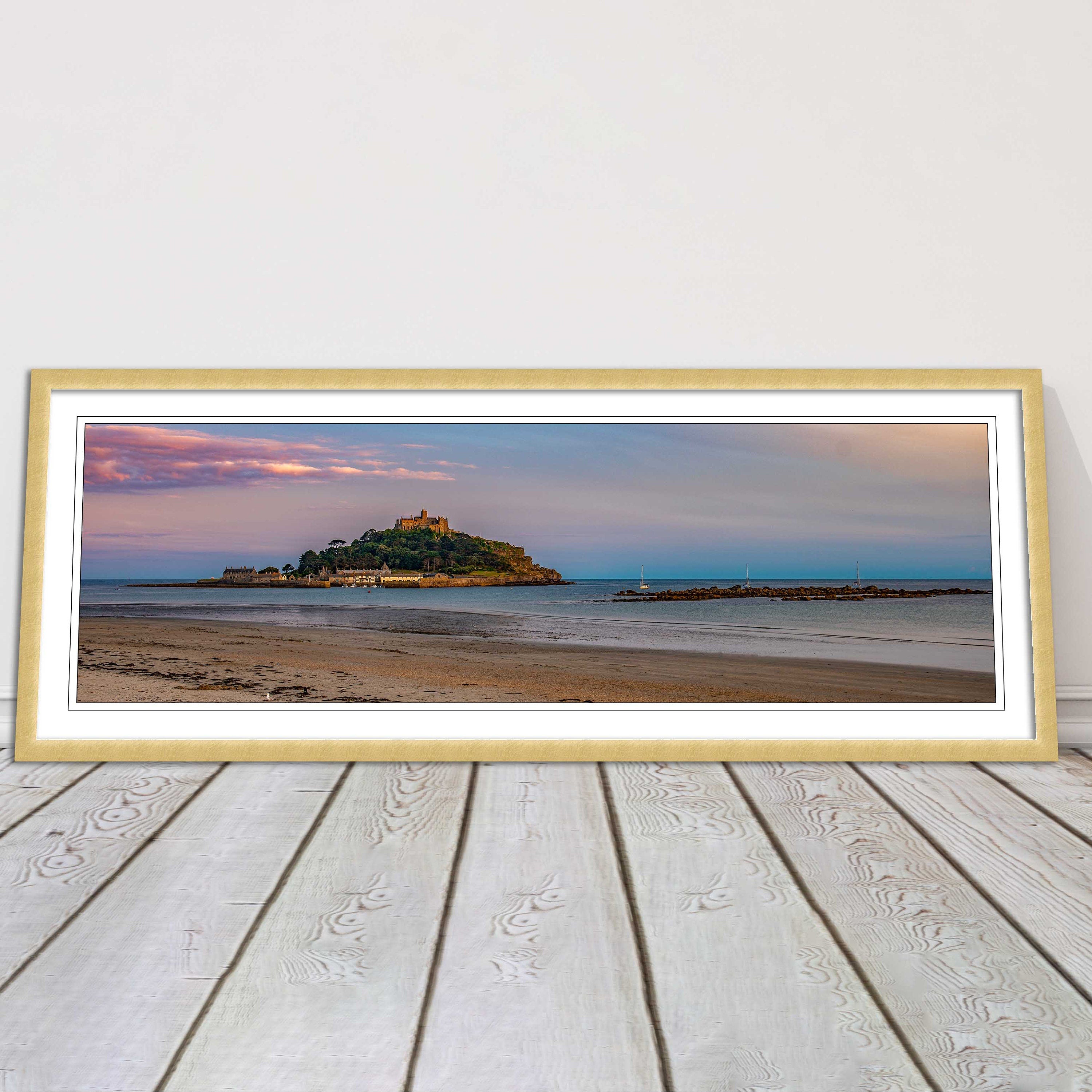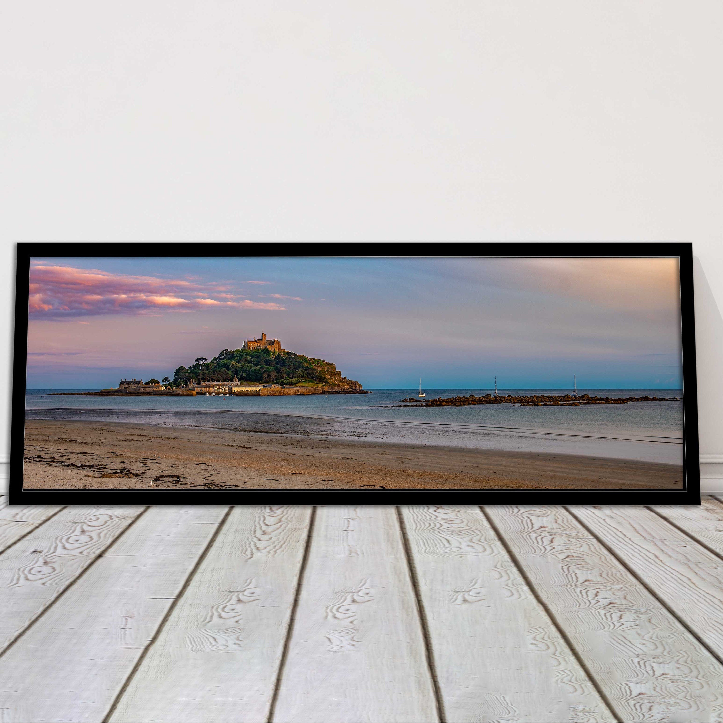 A beautiful panoramic framed picture of Saint Michaels Mount at sunset, Cornwall. A choice of frames available.