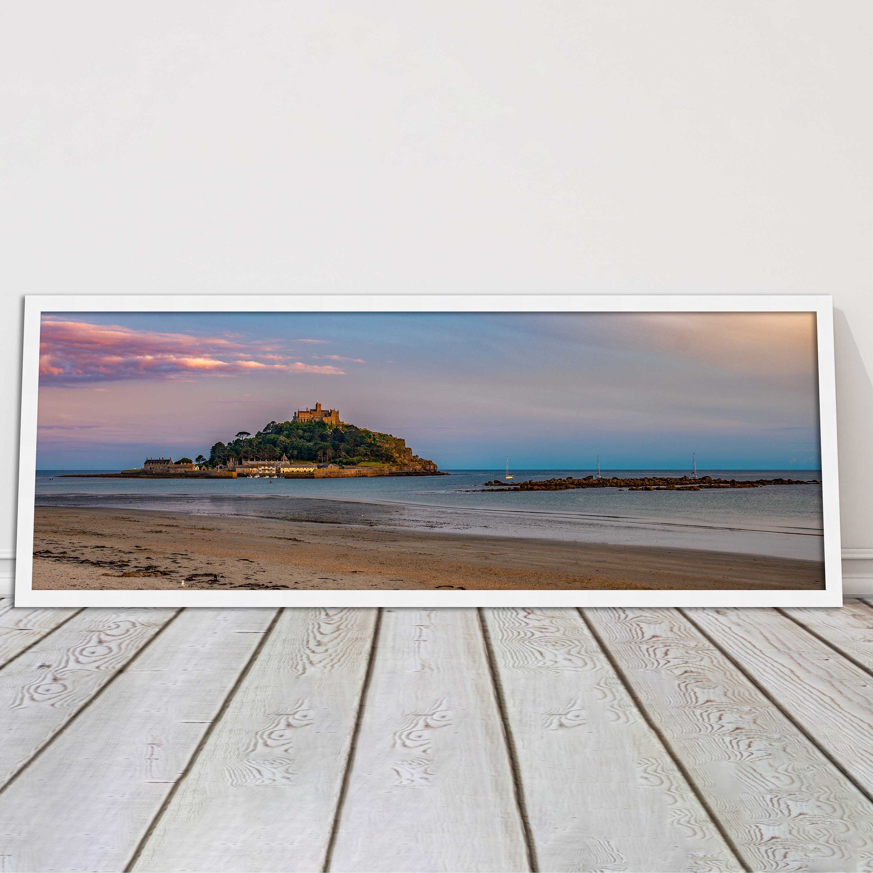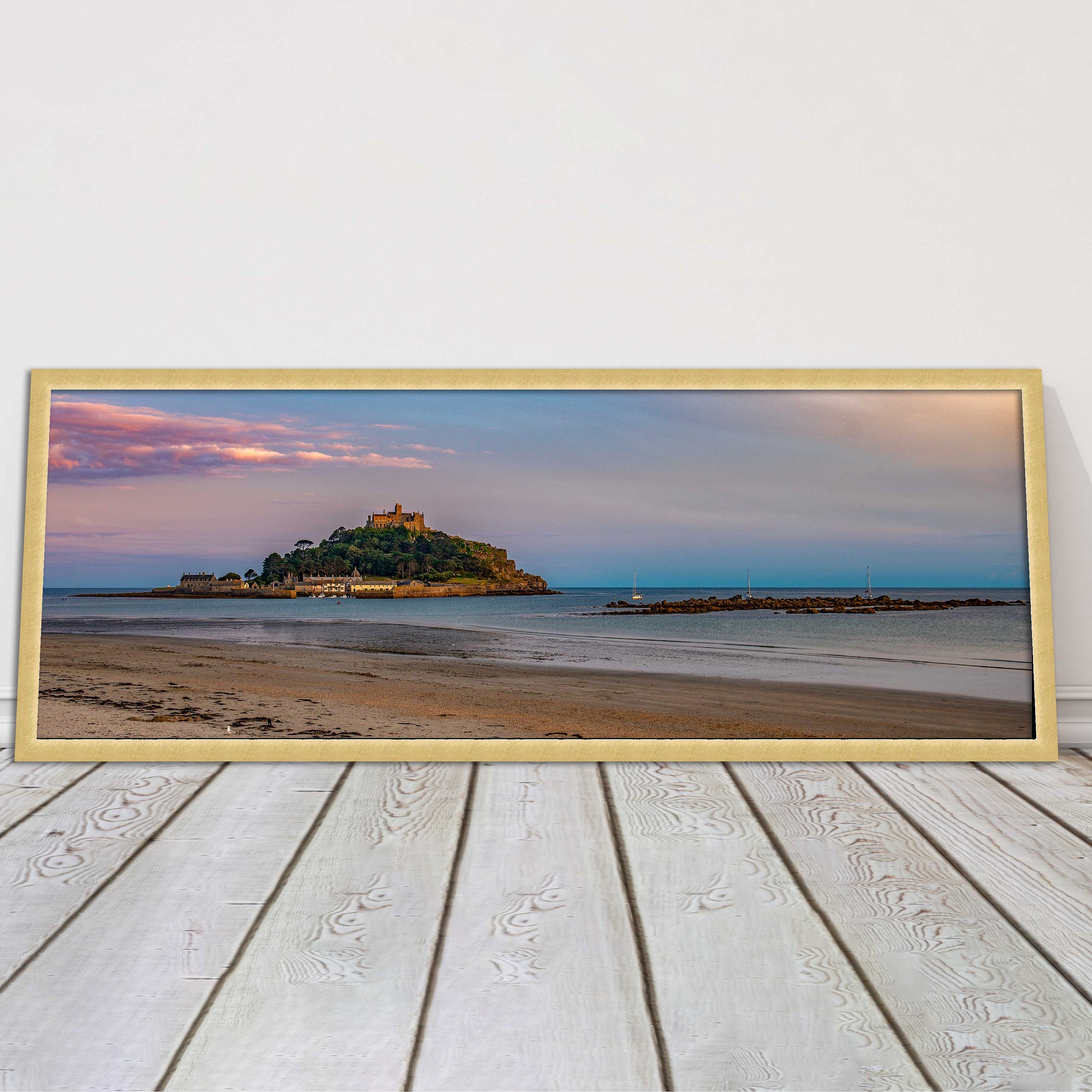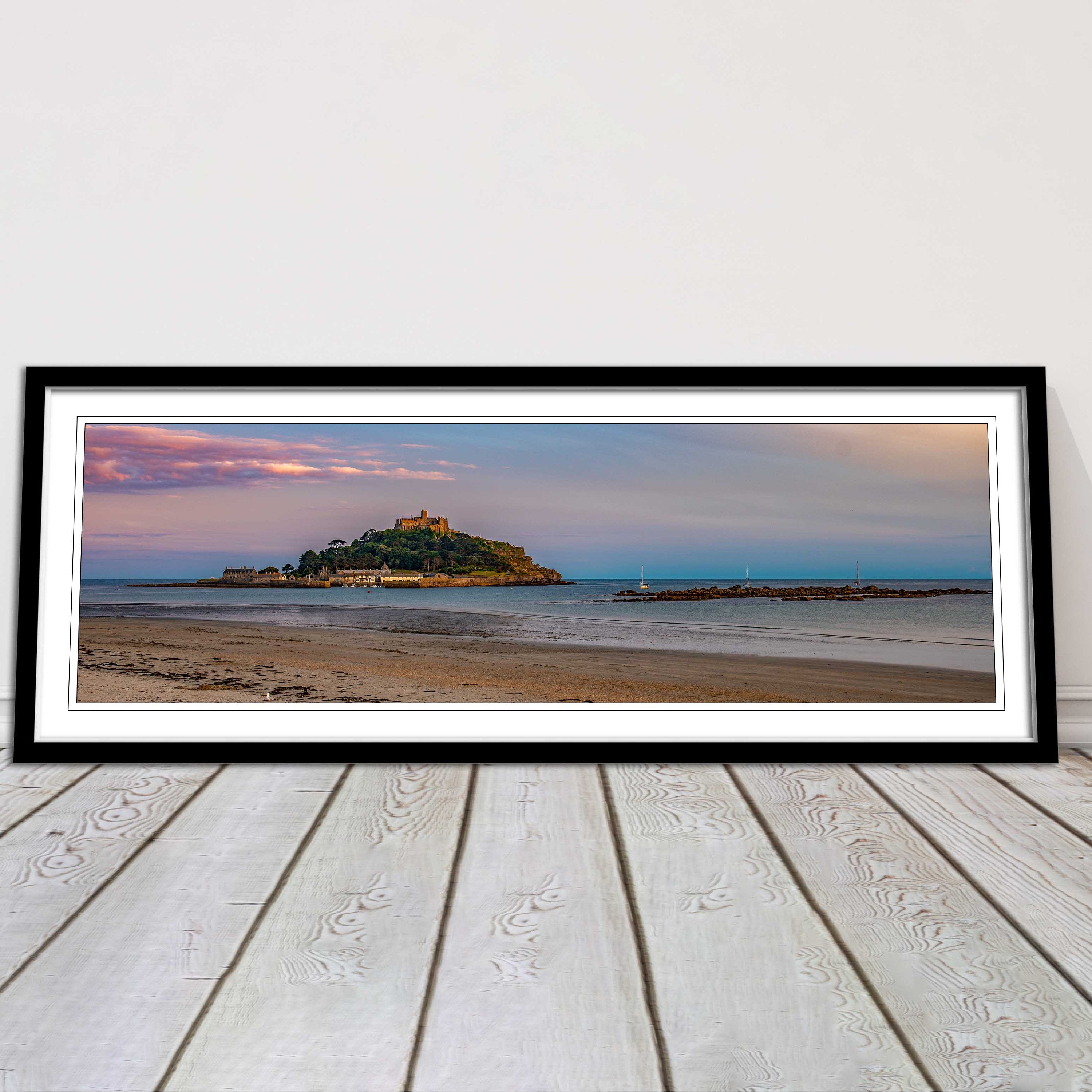 A beautiful panoramic framed picture of Saint Michaels Mount at sunset, Cornwall. A choice of frames available.