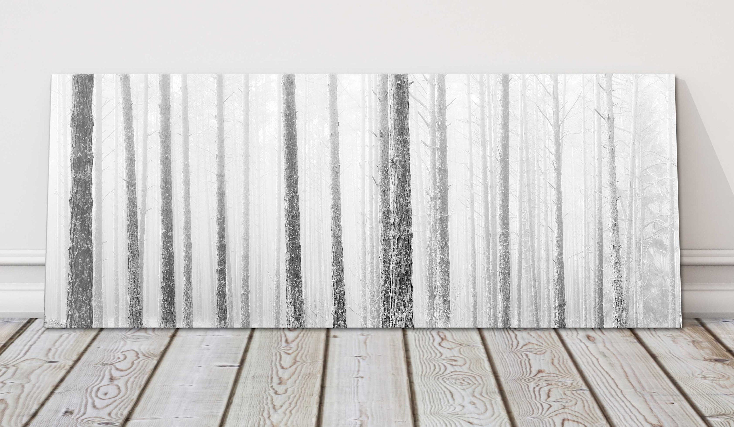 Black and white tall bare pine trees in winter fog. Panoramic canvas picture print. Winter landscape scene.