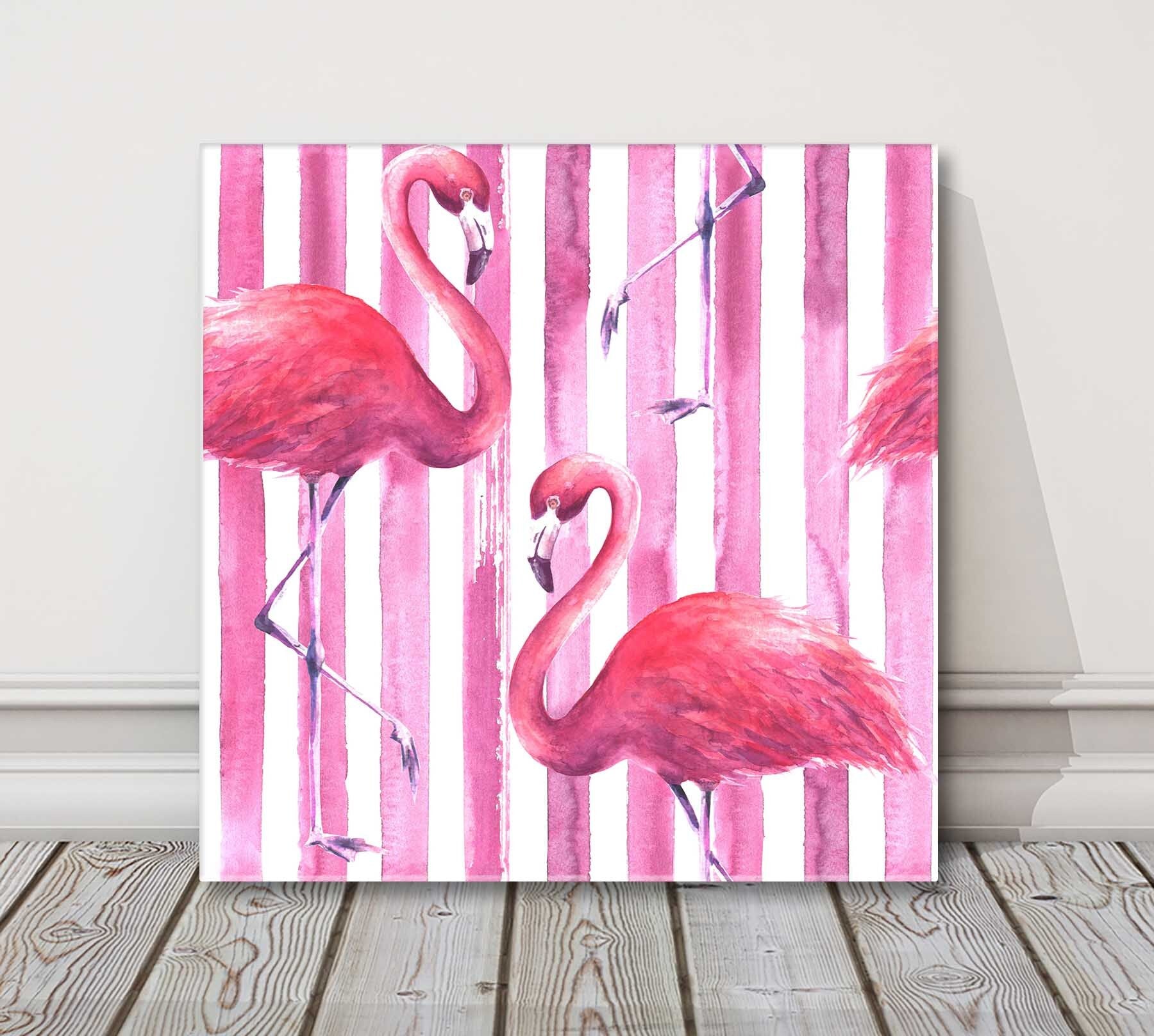 Pink flamingos watercolour print on a pink and white background canvas picture print. Available in choice of sizes. Nice bright wall art for any room.