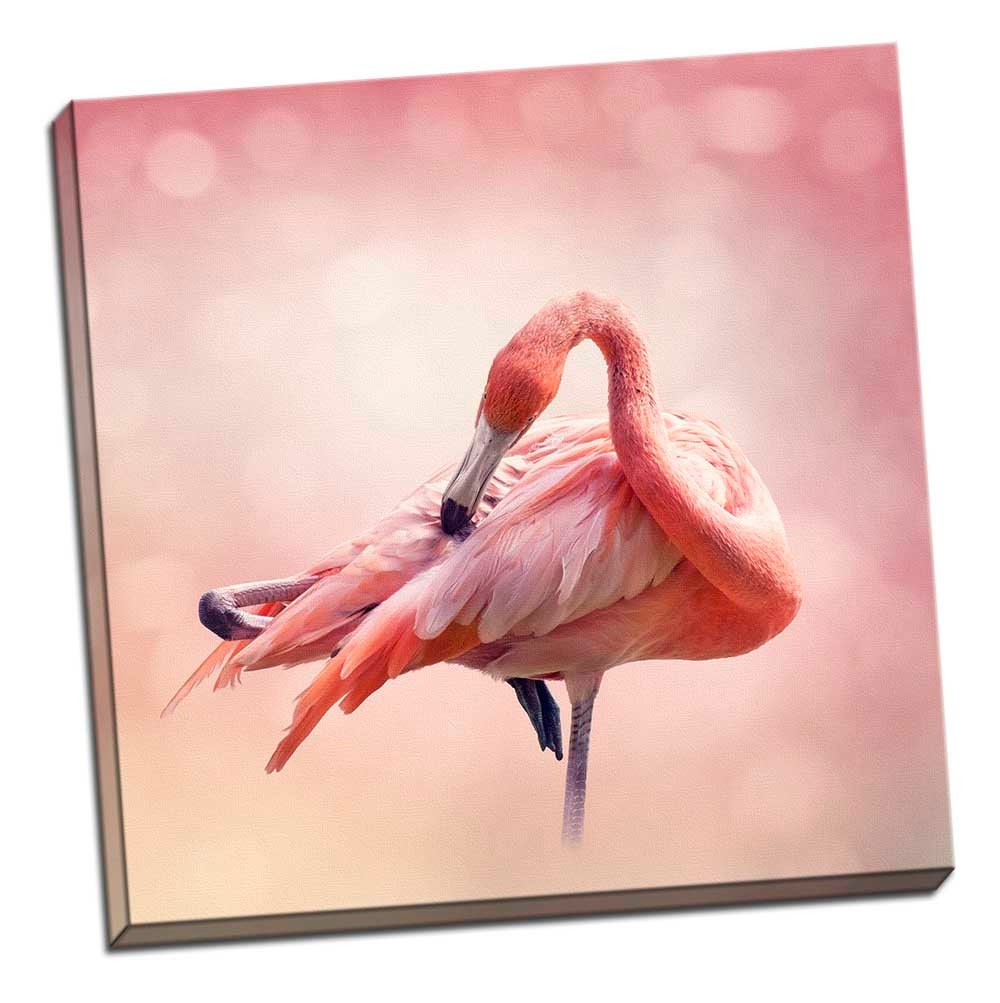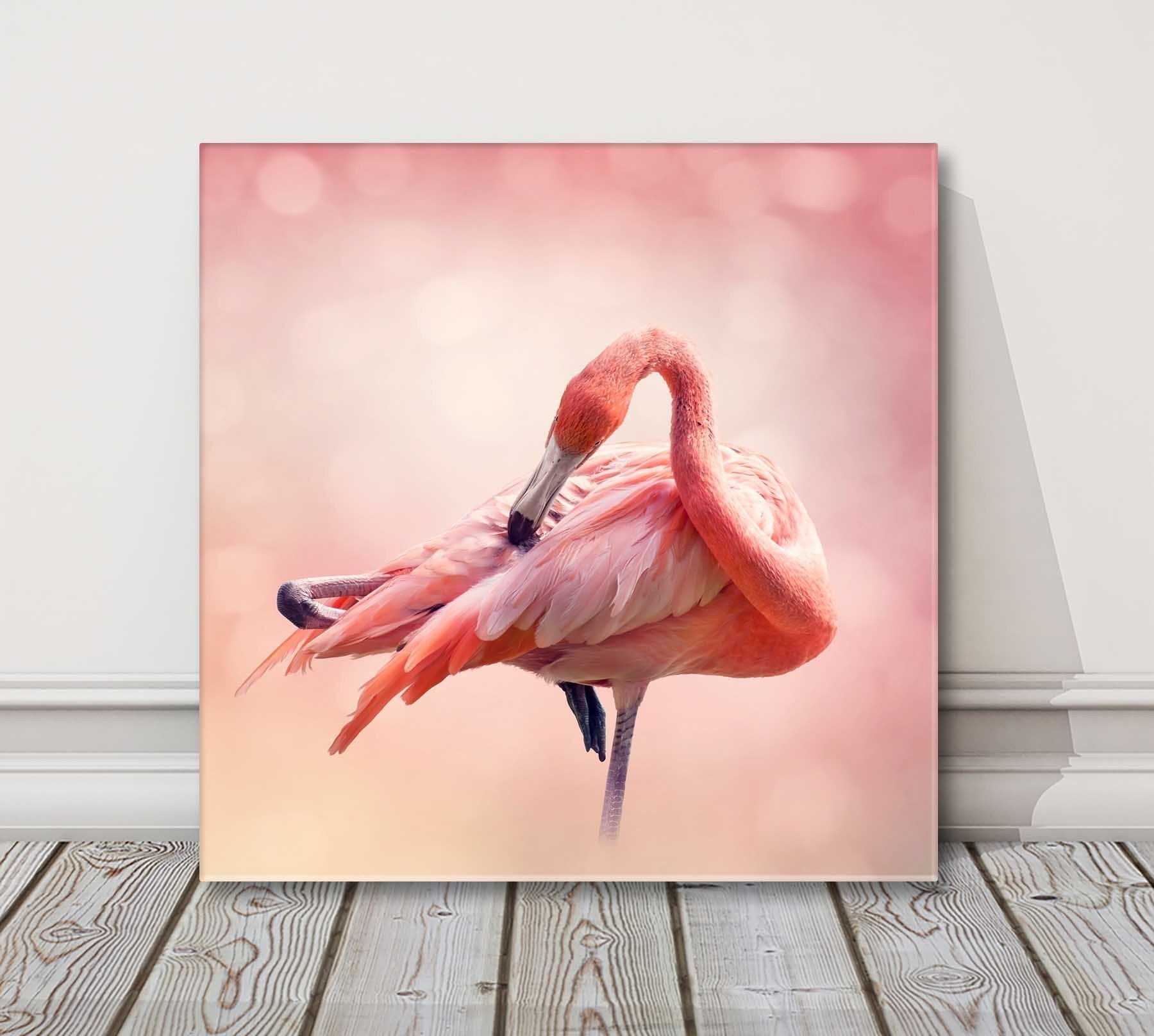 Pink flamingo grooming its feathers. Printed on a pink background. Canvas picture print. Available in choice of sizes. Nice bright wall decor for any room.