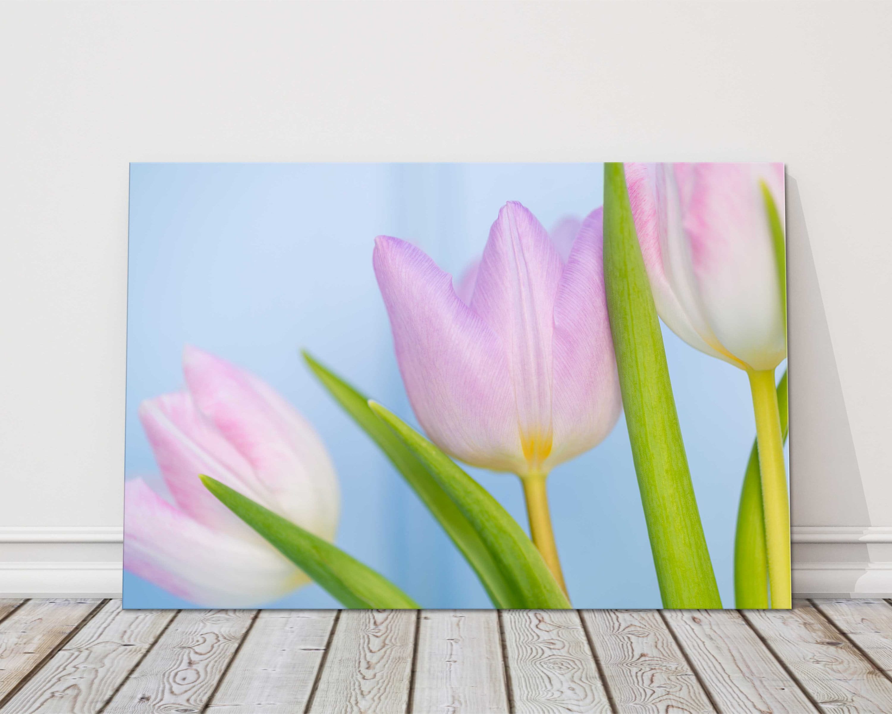 Pink Tulips on a blue background. Soft, pastel coloured springtime flowers. Printed and framed canvas picture print. Beautiful in any... Read more