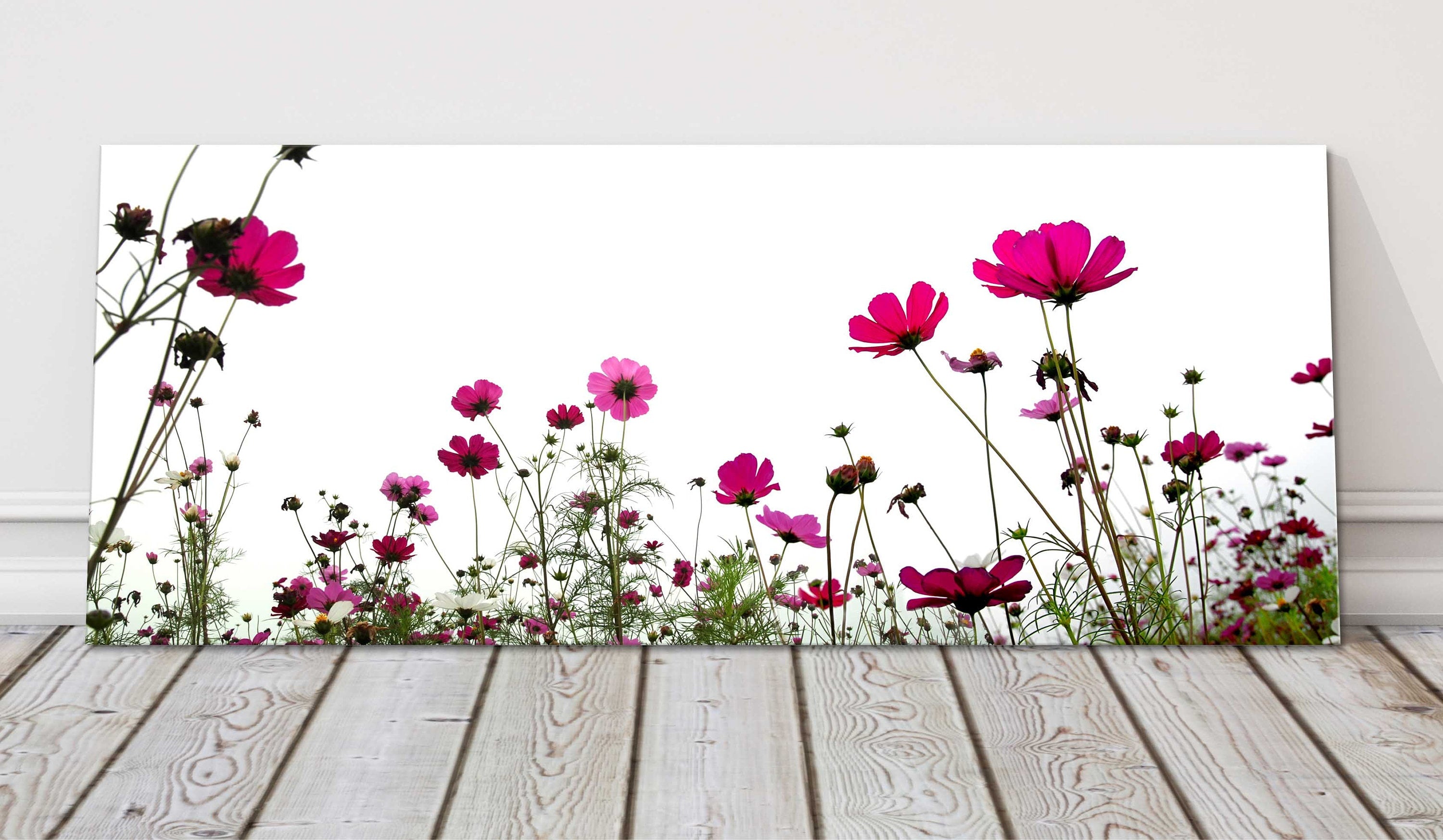 Pink Wild Flowers, panoramic canvas picture print. Sizes available to fit any wall. Bright spring colours.