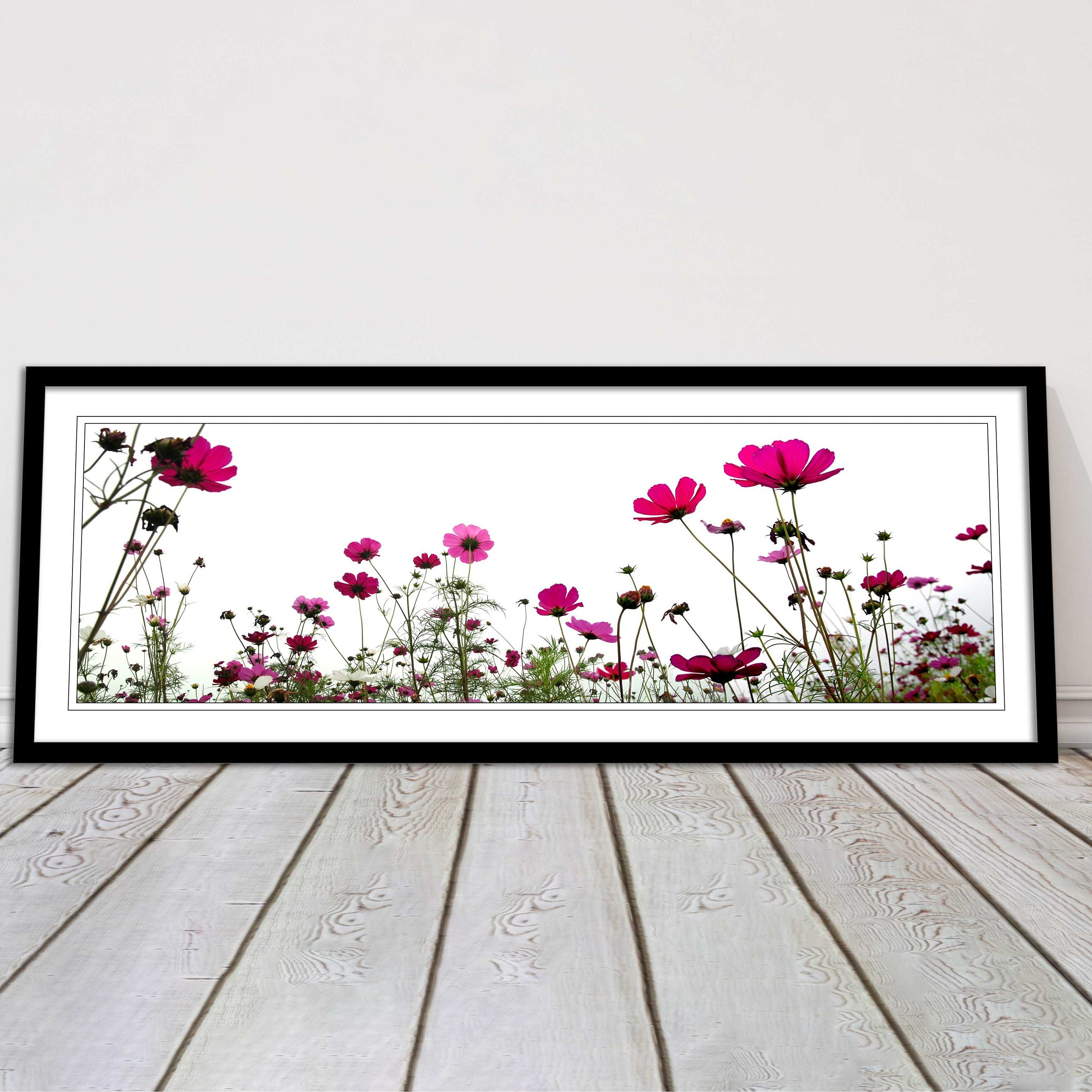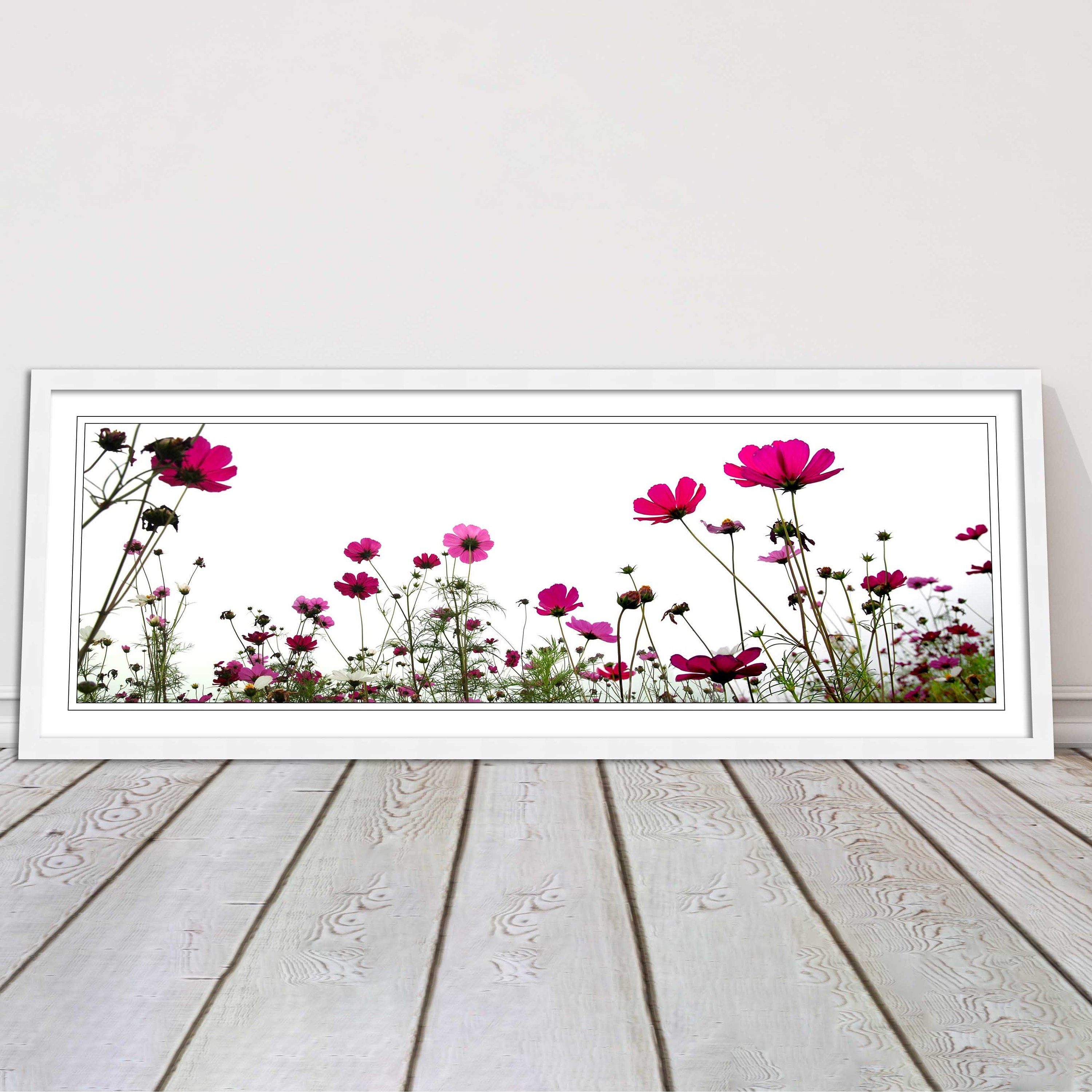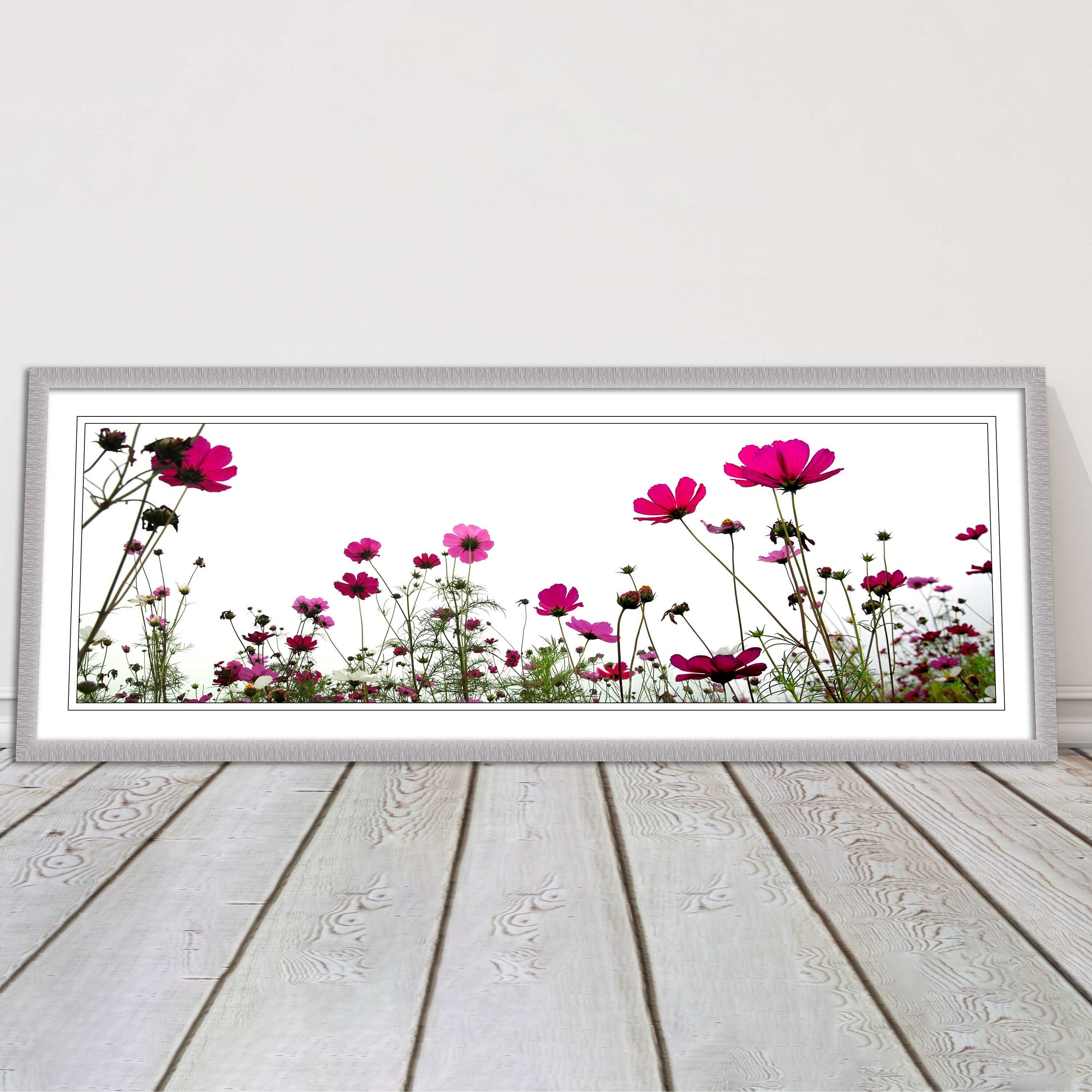 Pink wild flowers on a white background. A beautiful panoramic framed picture print. Choice of size, frame colours and borders.