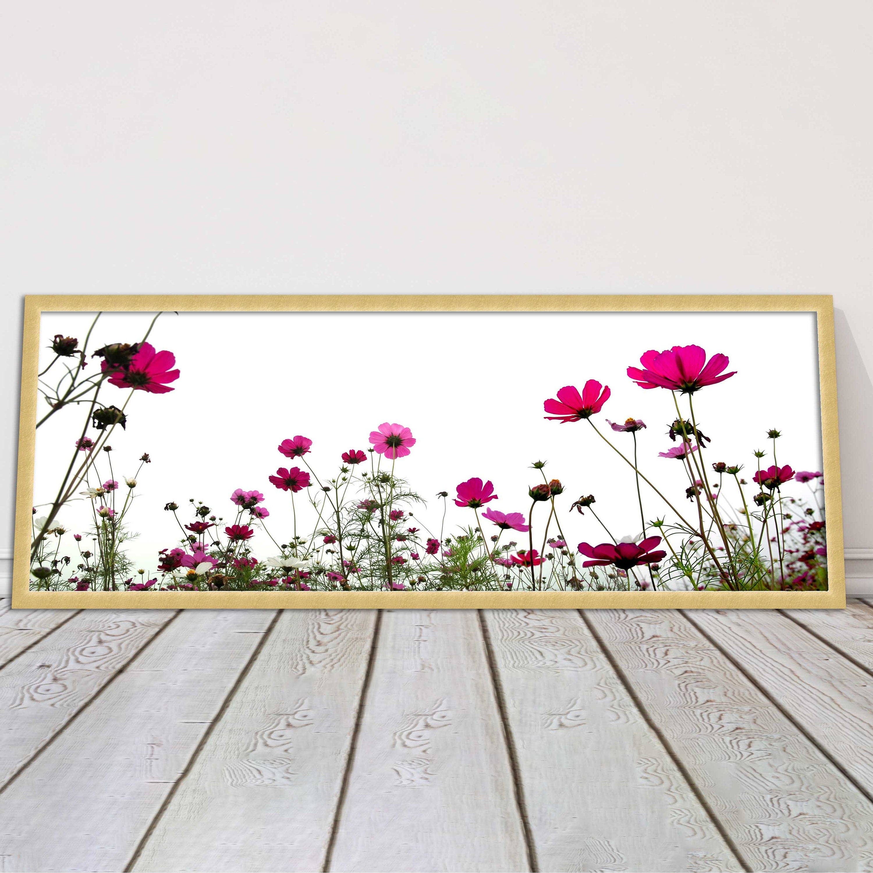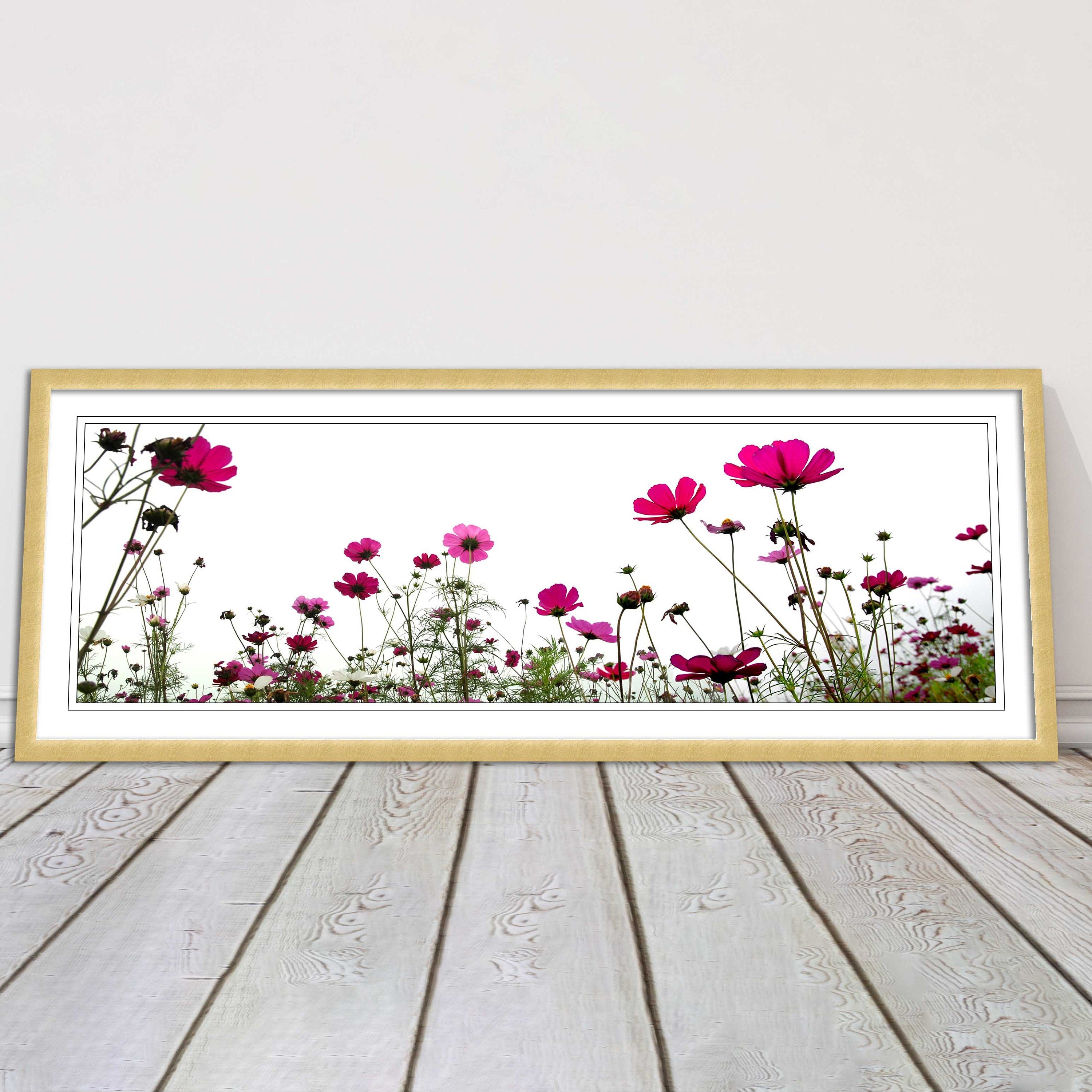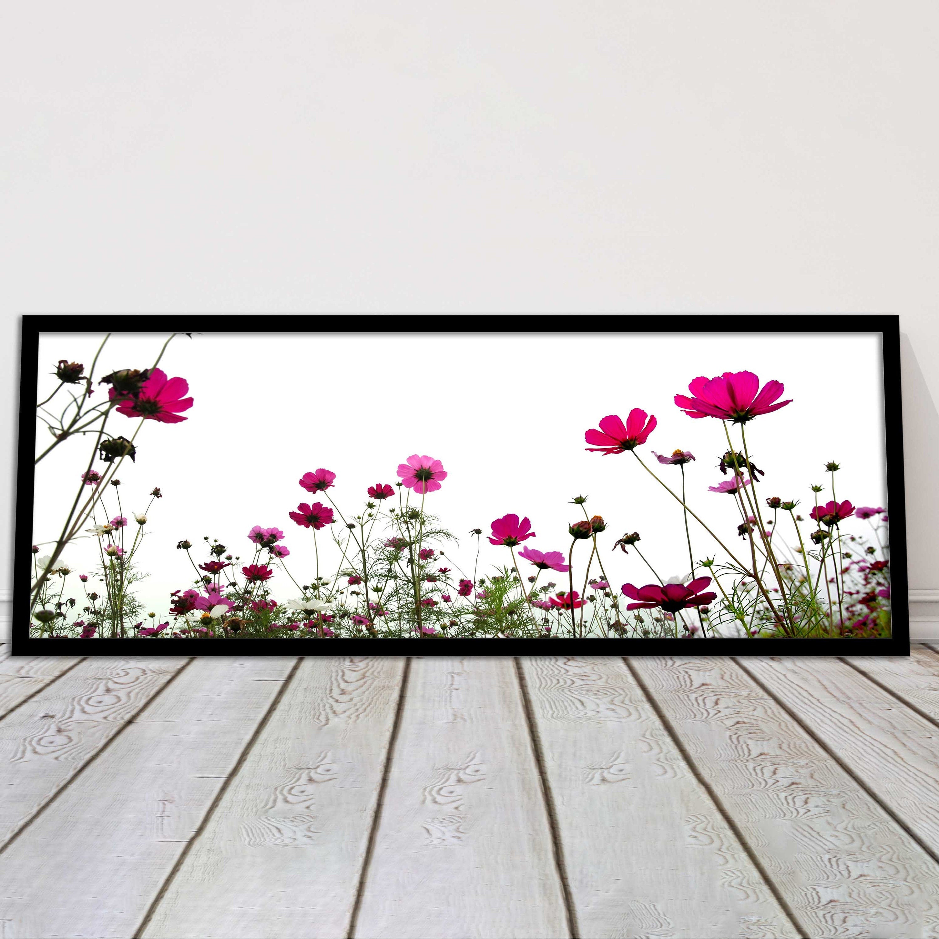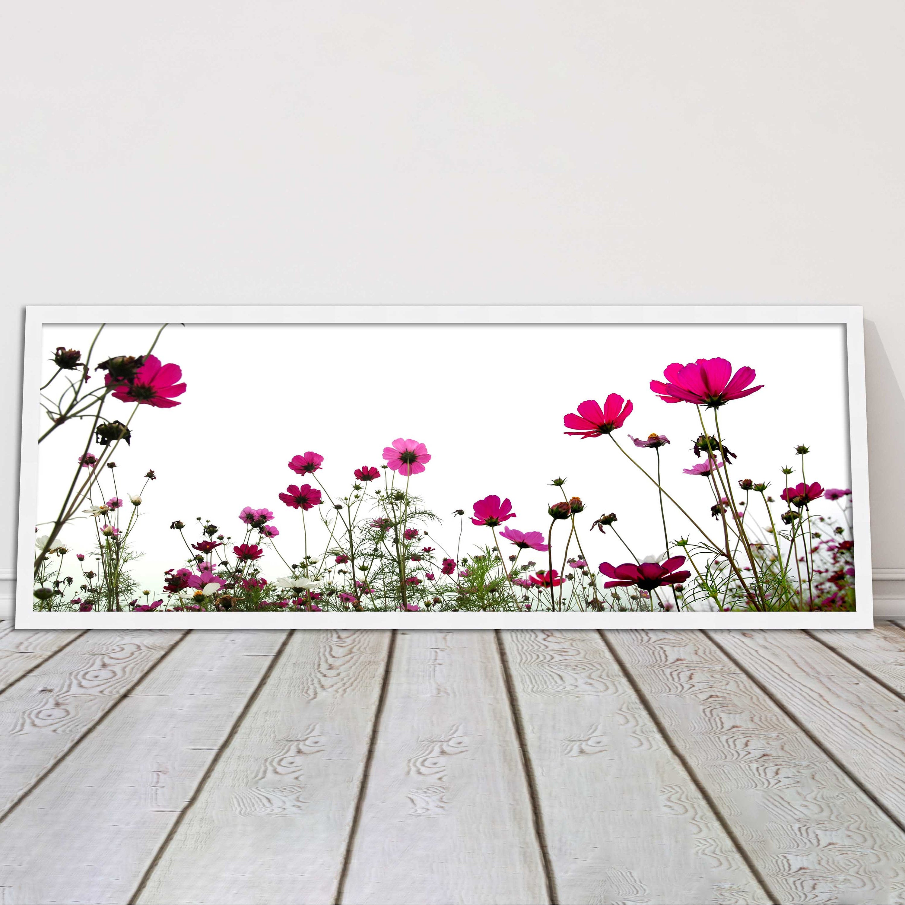 Pink wild flowers on a white background. A beautiful panoramic framed picture print. Choice of size, frame colours and borders.